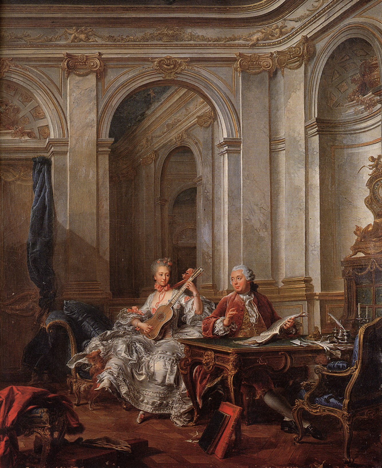 Ces deux exemples marquants nous montrent à quel point un tel parti architectural était devenu affaire de mode, adopté à l’étranger comme ici à Anvers, adopté aussi par les peintres pour portraiturer leurs modèles dans des intérieurs au goût du jour comme le firent Nicolas Lafrensen dit Lavreince avec sa célèbre gouache intitulée l’Assemblée au Salon, ou encore Jean Valade (1709-1787) avec son portrait du marquis et de la marquise de Faventine. Le tableau est actuellement conservé dans une collection privée.