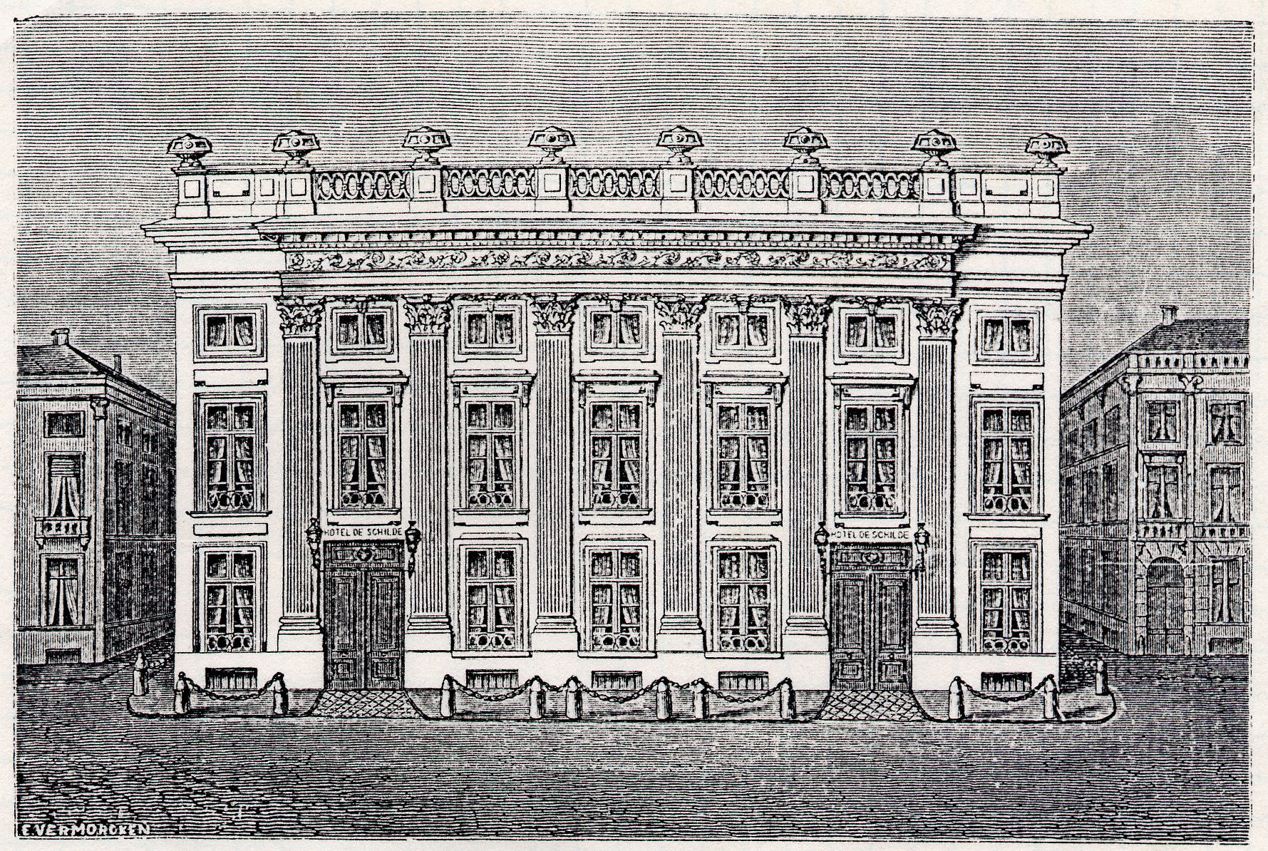 La boiserie fut réalisée pour le compte de l’une des plus importantes familles de la ville d’Anvers, les Van De Werve – De Schilde et fut installée dans un salon situé au premier étage de leur hôtel particulier, l’hôtel de Schilde, une demeure néo-classique bâtie dans le quartier du Kipdorp et aujourd’hui disparue (voir ci-dessous).