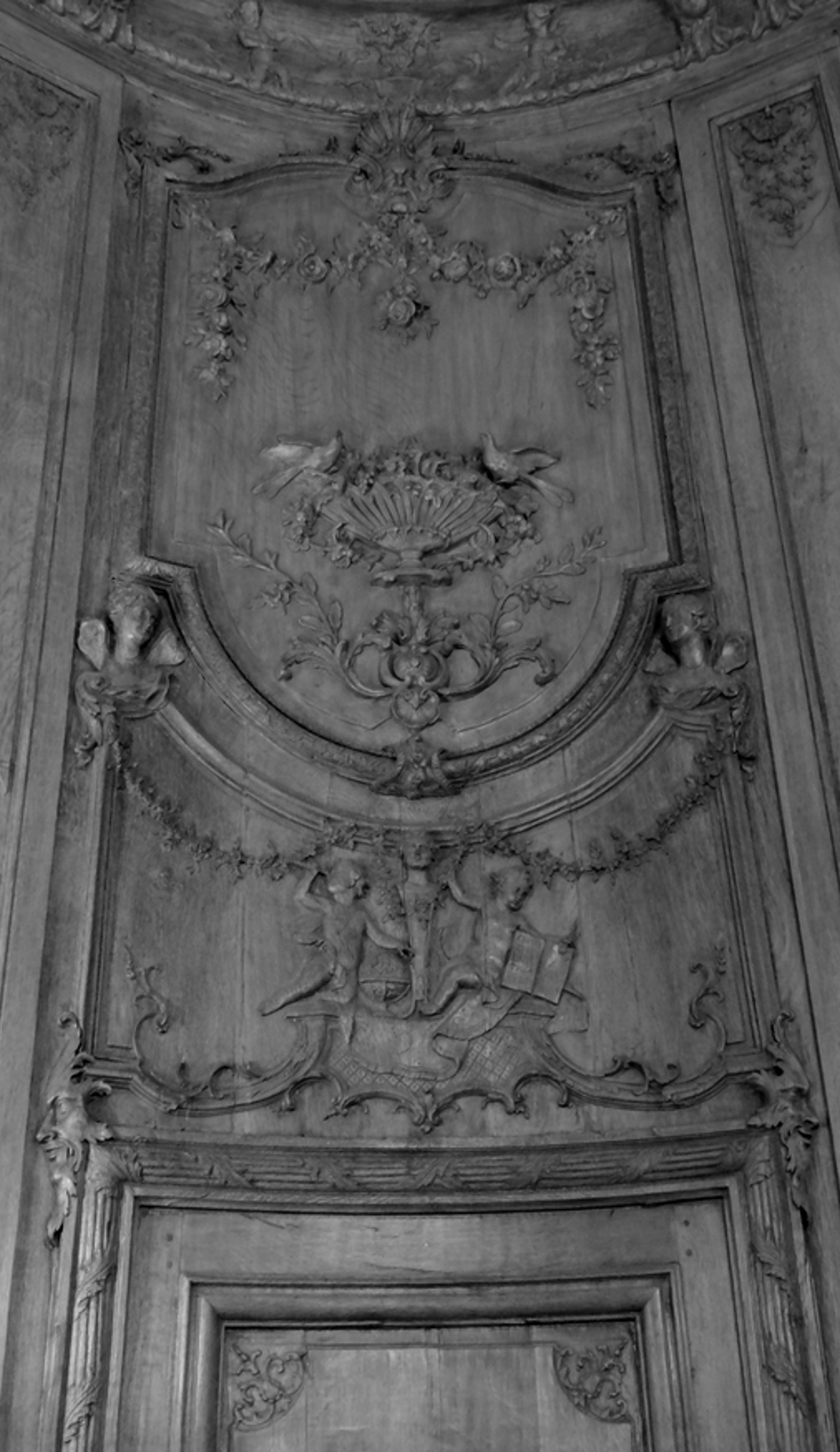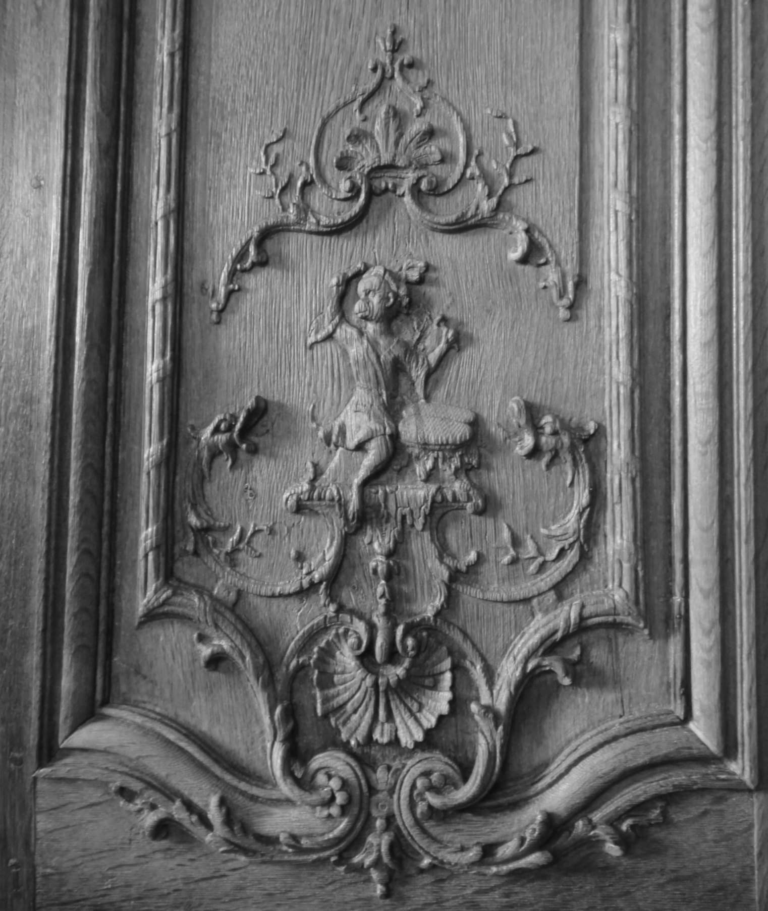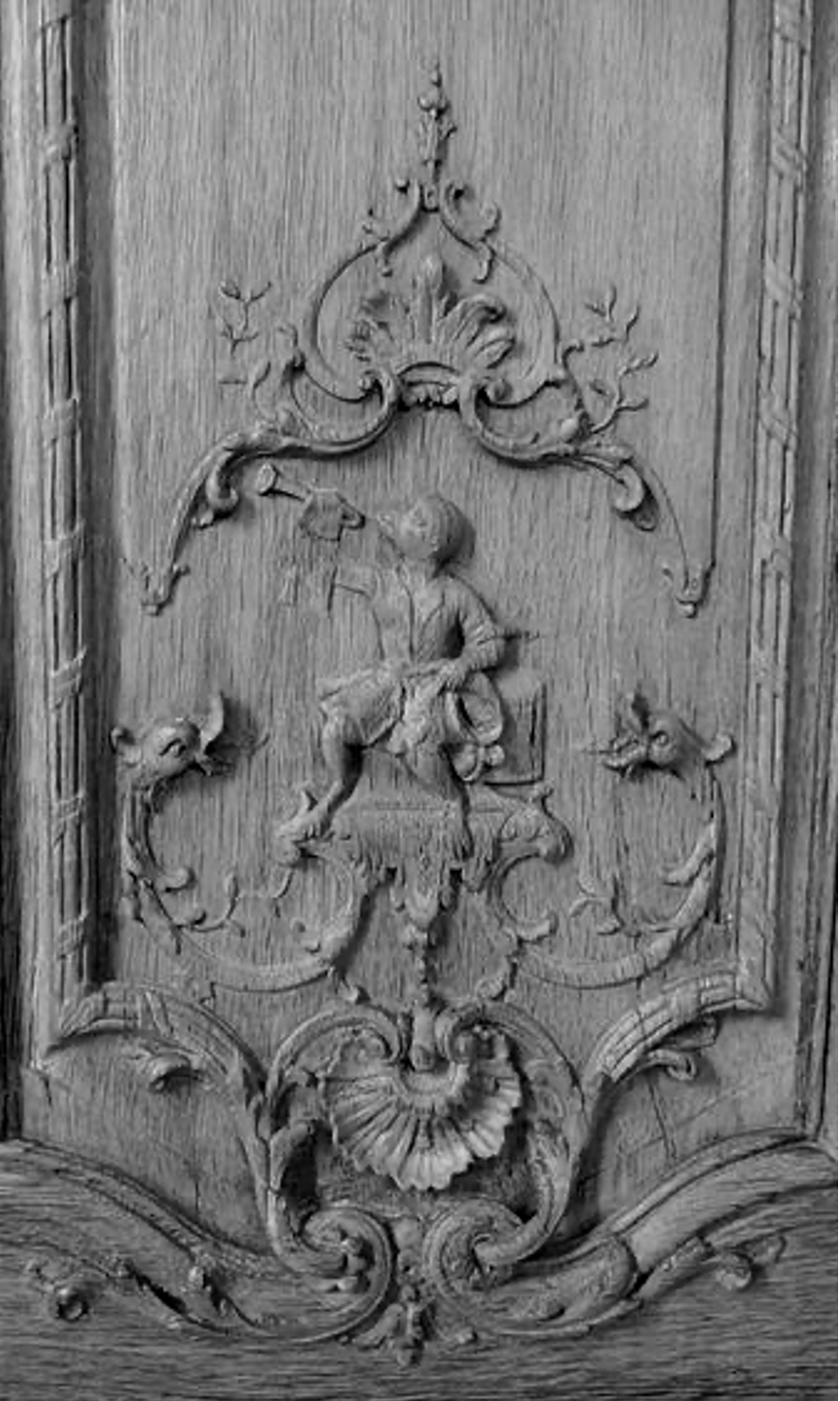 Des volutes en écoinçon singularisent les angles inférieurs des grands panneaux, de part et d’autre d’un jeu de volutes et de palmes entrecroisées soutenant au centre des enfants musiciens ou joueurs, l’un d’entre eux soufflant des bulles de savon, symboles de la fragilité et de l’éphémère. Structuré de même, les panneaux plus étroits montrent en lieu et place des enfants précédemment décrits, des singes, ‘travestis en homme’, singes musiciens, singes colporteurs, riche décor pour le moins exotique auquel viennent s’ajouter ici des clins d’œil d’ordre anecdotique, avec ces escargots ‘escaladant’ les volutes festonnées d’acanthes de ces lambris. Le trumeau de miroir au-dessus de la cheminée, bordé à motifs de palmes, est ponctué d’un enfant maintenant sur sa tête une corbeille de fleurs.