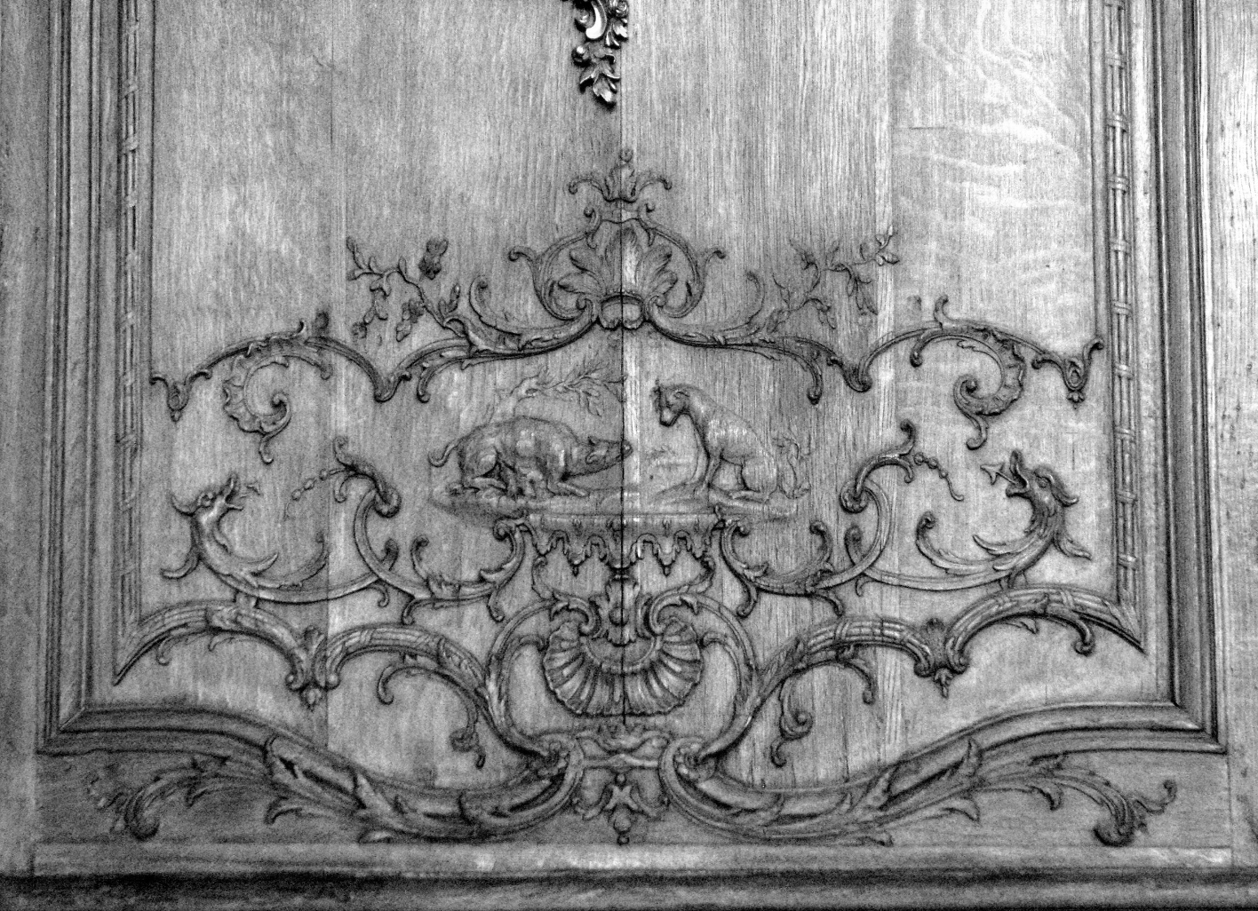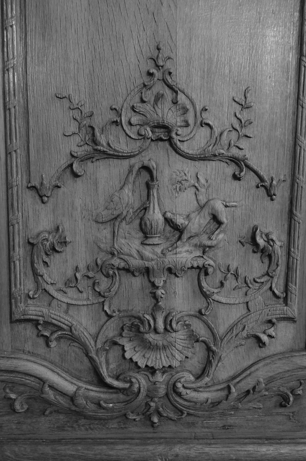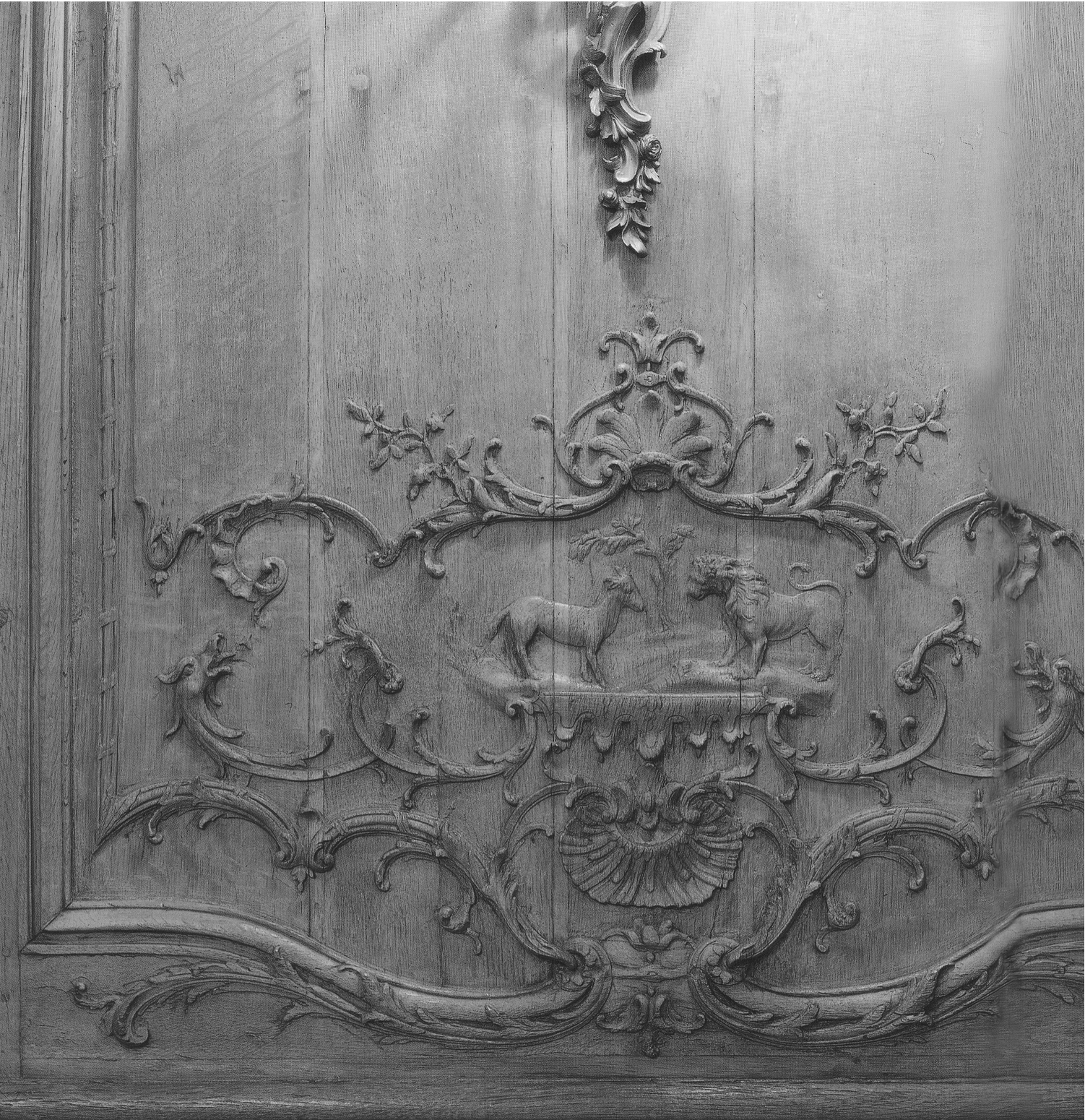 Des volutes en écoinçon singularisent les angles inférieurs des grands panneaux, de part et d’autre d’un jeu de volutes et de palmes entrecroisées soutenant au centre des enfants musiciens ou joueurs, l’un d’entre eux soufflant des bulles de savon, symboles de la fragilité et de l’éphémère. Structuré de même, les panneaux plus étroits montrent en lieu et place des enfants précédemment décrits, des singes, ‘travestis en homme’, singes musiciens, singes colporteurs, riche décor pour le moins exotique auquel viennent s’ajouter ici des clins d’œil d’ordre anecdotique, avec ces escargots ‘escaladant’ les volutes festonnées d’acanthes de ces lambris. Le trumeau de miroir au-dessus de la cheminée, bordé à motifs de palmes, est ponctué d’un enfant maintenant sur sa tête une corbeille de fleurs.