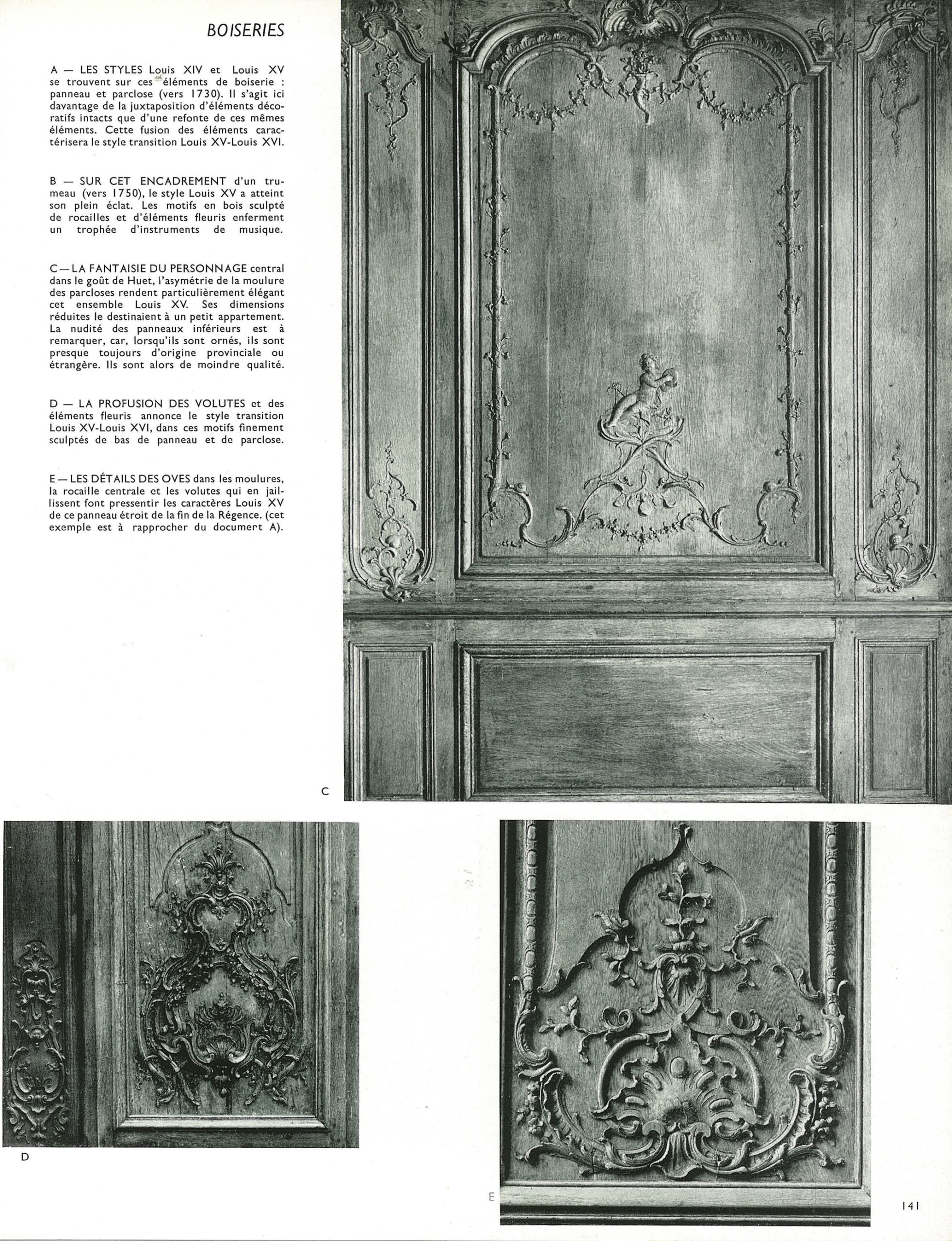 Notre ensemble de boiseries repose sur une sobre cimaise à compartiments, à bordures simplement moulurées et fonds unis, soutenant une suite alternée de grands panneaux et de parcloses très délicatement et finement sculptés. Chaque grand panneau présente un encadrement mouluré et rectiligne à découpe supérieure ‘en arbalète’ ponctuée d’un cartouche à motifs de palmette et de volutes festonnées, flanqué d’acanthes, le tout enfermant une seconde bordure faite d’une juxtaposition de fines baguettes moulurées autour desquelles viennent s’enrouler de délicates guirlandes de fleurs au naturel.