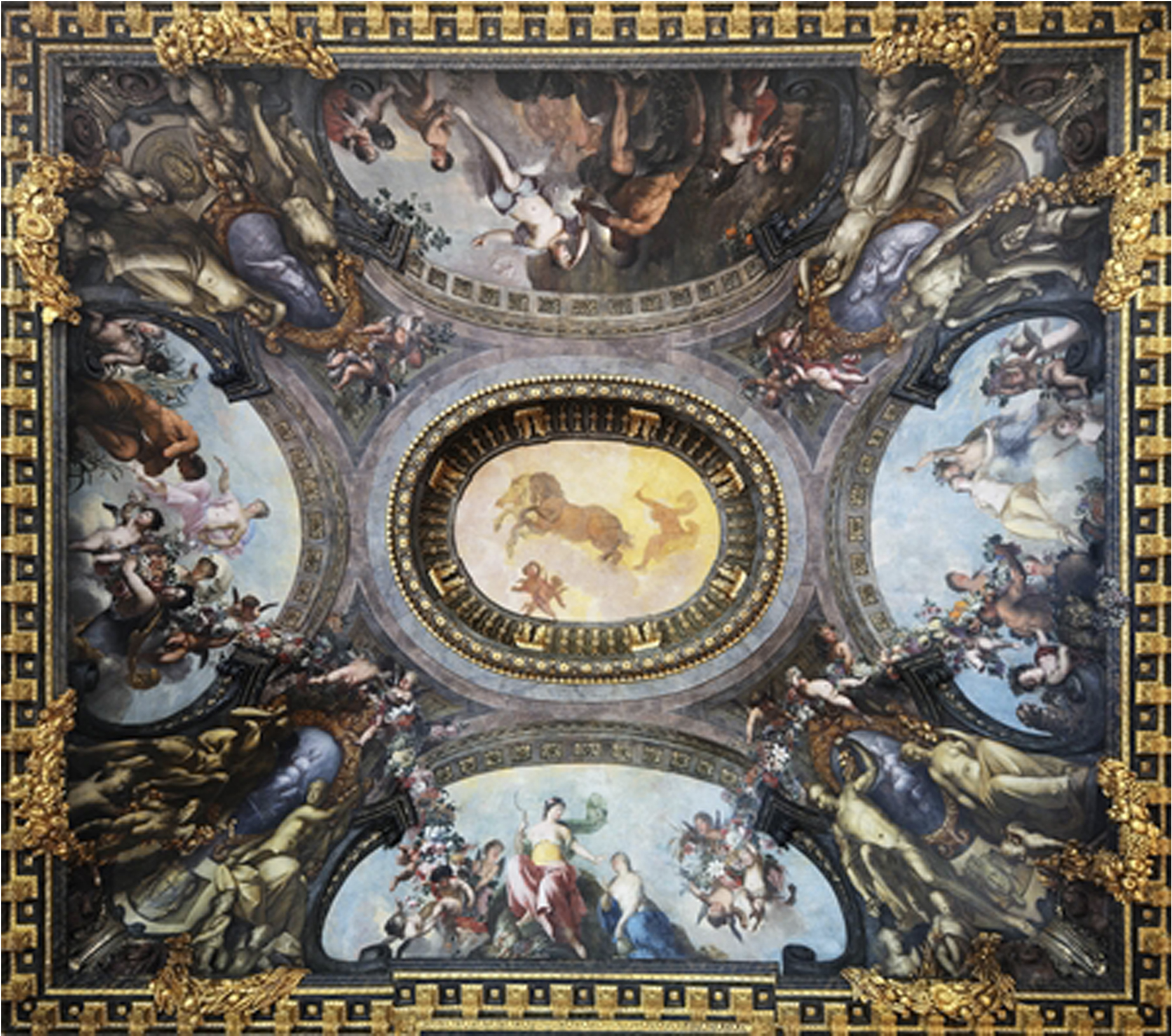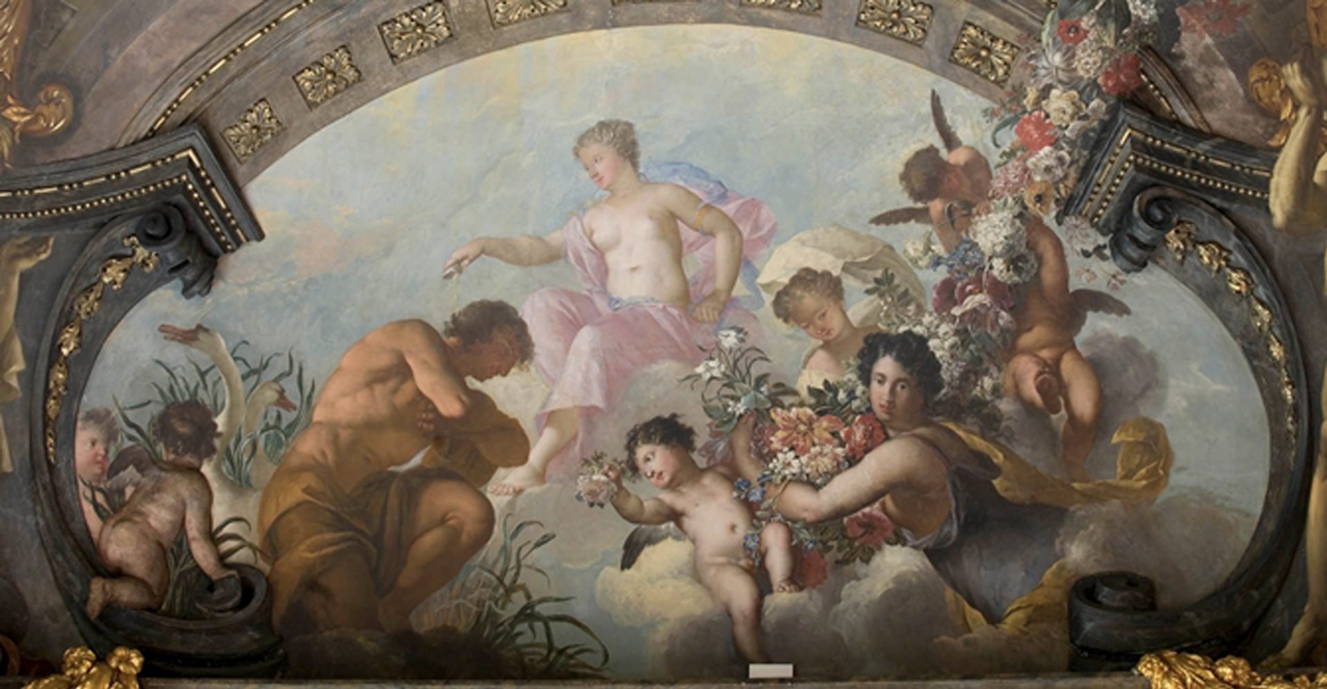 The composition of each painting, inspired by projects of 17th century French frontispieces, is organized around a central oval decorated with figures of ancient gods or prophets, painted in grisaille, completed by a Latin inscription, with whole restings on an architectural base. The group is set against a background of draperies, foliage and cherubs holding circular garlands of flowers in their hands. In the lower portion, a group of putti representing an allegory echoes the subject painted in grisaille in the center of the composition.