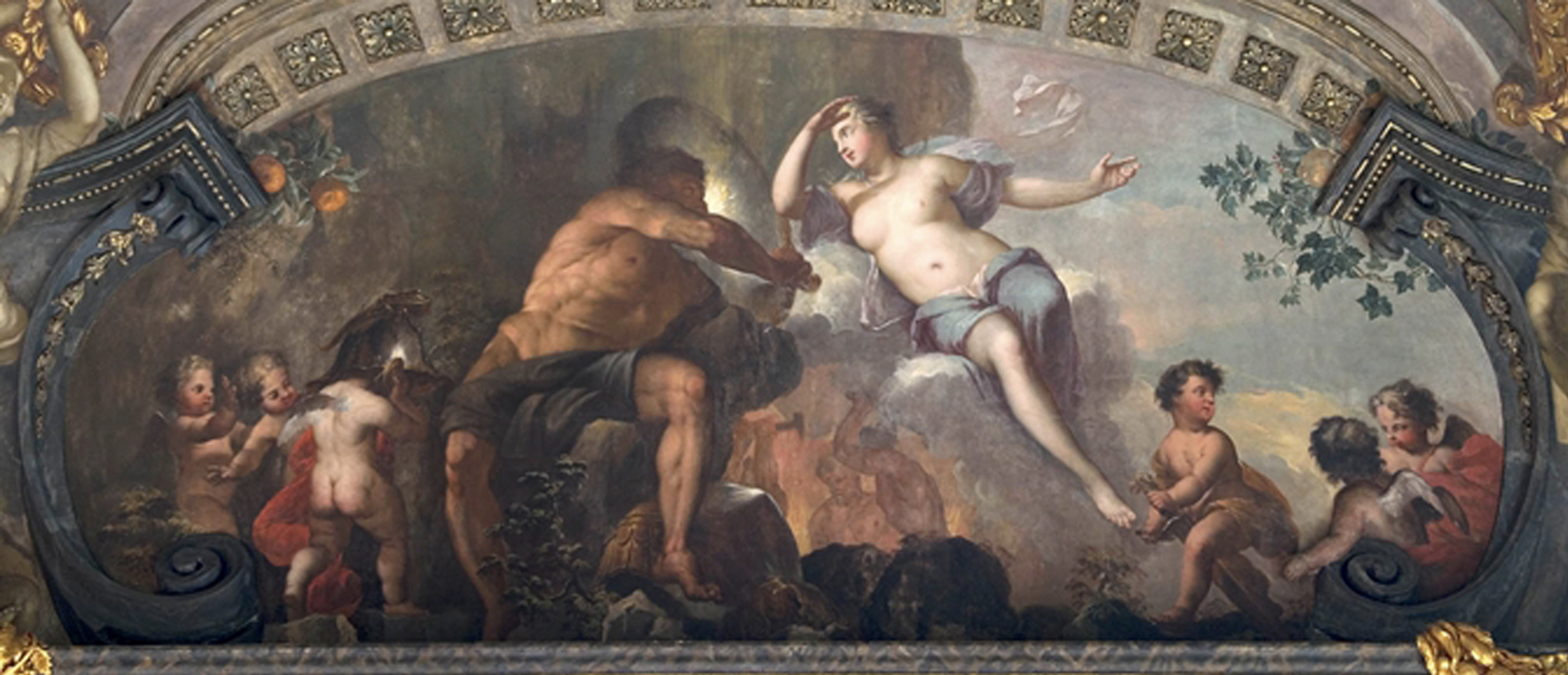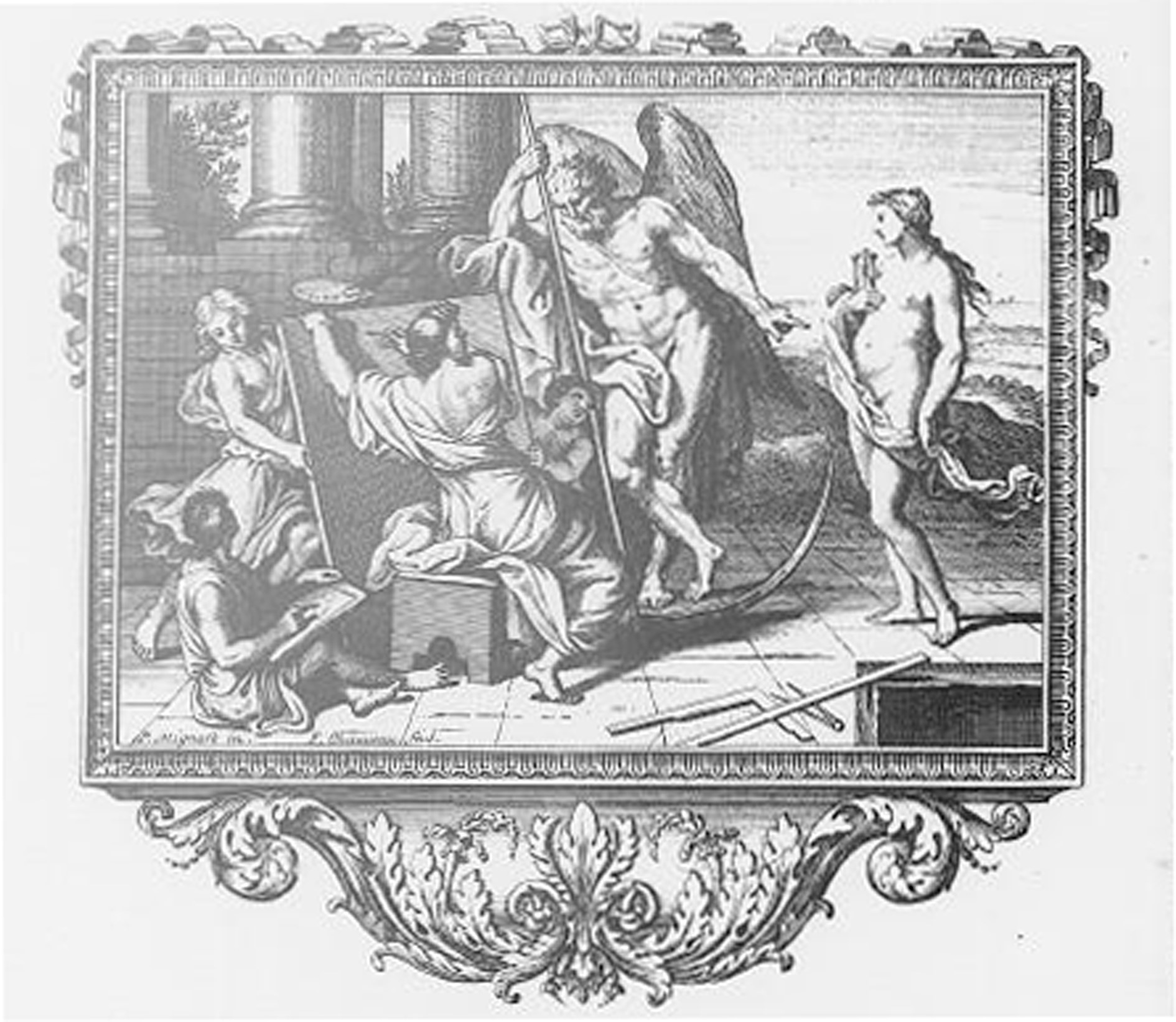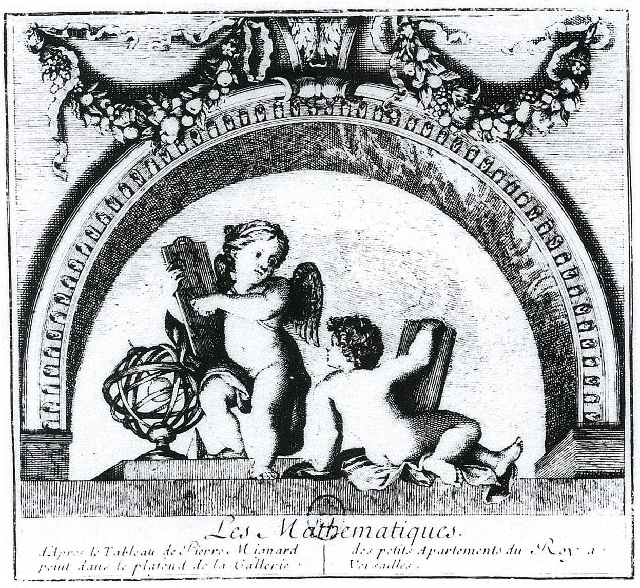 It must be noted in regard to our work, that several scenes come directly from prints made by Pierre Mignard (1612-1695): notably the allegories of children representing Mathematics (fig.1) and Music (fig.2), engraved after the paintings executed by Mignard for the gallery of the Petits Appartements of the king at Versailles. Likewise, the section painted in grisaille representing Beauty Presented to Painting by Time is drawn from a print of François Chauveau, itself a copy of Mignard’s work, published in La gloire du Val de Grâce (fig.3) – a long poem in Alexandrine verse written by Molière in 1669 to laud the great fresco painted by Mignard in the dome of the church of Val de Grâce.