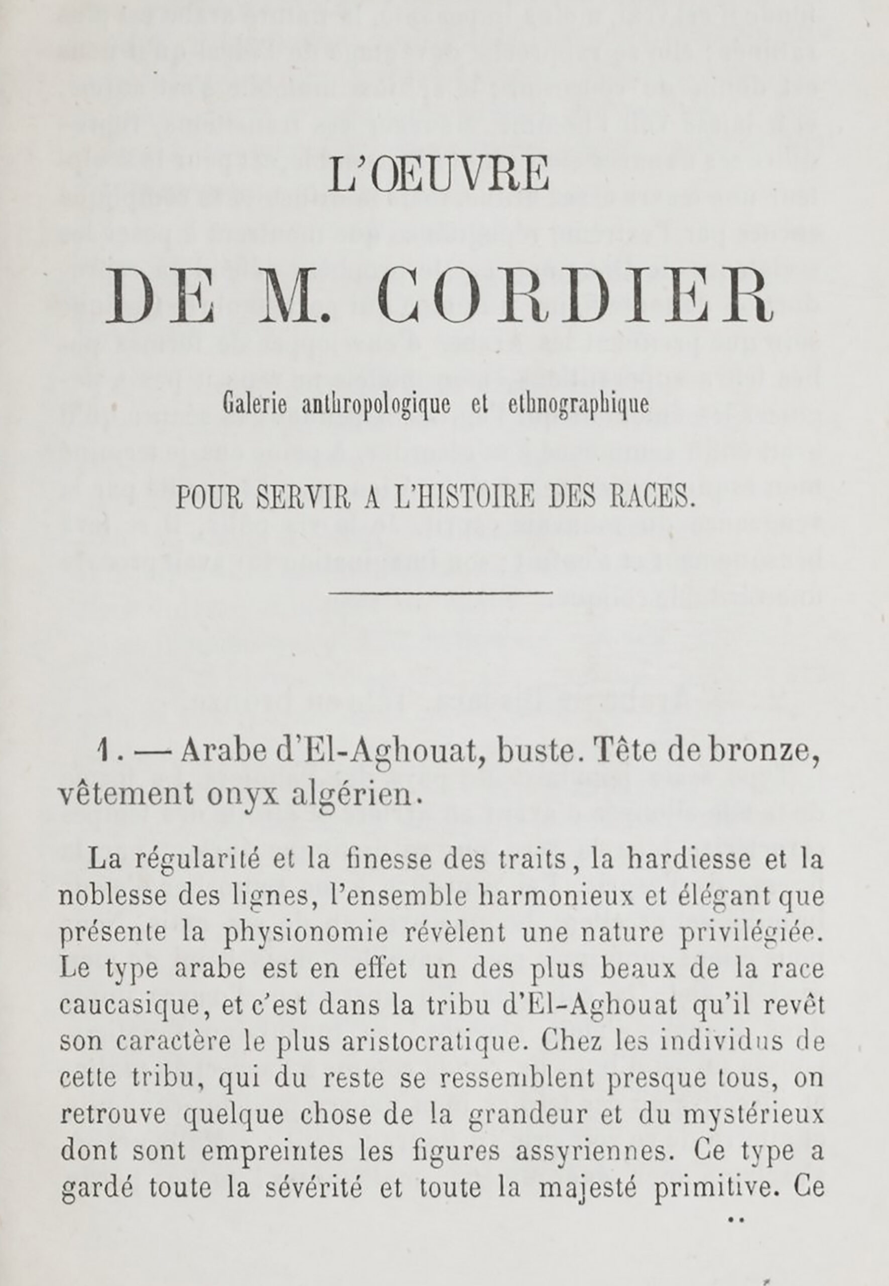 “The life of M. Cordier will have been, in the noblest and most rigorous sense of the word, a voyage in the discovery of form! For several years now he has been obstinately pursuing the problem, grasping human nature in all the varieties of conformation, in all the evolutions of the line, in all its combinations, in all its whims, in all its movements, in all its aspects, in all its settings. Many are the needs catered for by studies undertaken under the influence of a similar method; for it is not only to artists, but also to the anthropologist, the ethnographer, the anatomist, the philosopher and the historian, that M. Cordier’s works are addressed. Thus understood, art is no longer a mere individual episode, a pure fantasy; it takes on its true purpose by attaching itself to the great movement of humanity. If it is true that the faithful reproduction of the types of the various races is necessary to enlighten the study of biological and moral sciences, and to provide them with solid foundations, sculpture has never had a more profound meaning, never has it been of more general interest.”