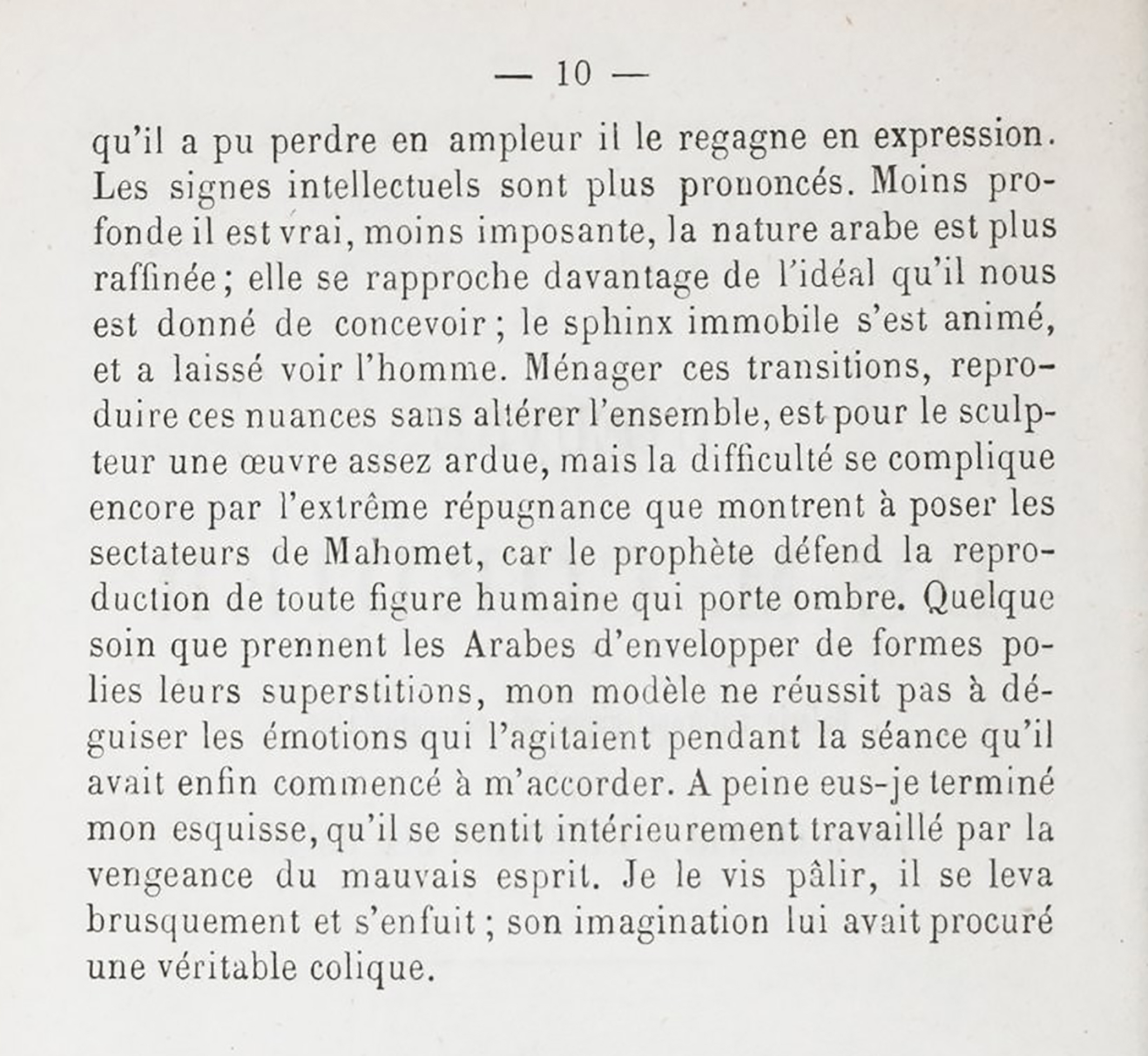 “The regularity and fineness of the features, the boldness and nobility of the lines, the harmonious and elegant whole presented by the physiognomy [of our head] are evidence of a privileged nature. The Arab type is indeed one of the most beautiful of the Caucasian race, and it is in the tribe of El-Aghouat that it takes on its most aristocratic character. In the individuals of this tribe, who are almost all alike, there is something of the grandeur and mysteriousness of the Assyrian figures. This type has retained all of their primitive severity and majesty. What it may have lost in magnitude, it has regained in expression. The intellectual signs are more pronounced. Less profound it is true, less imposing, Arab nature is more refined; it is closer to the ideal that we are given to conceive; the immobile sphinx has come to life and has allowed man to be seen. To preserve these transitions, to reproduce these nuances without altering the whole, is for the sculptor a rather arduous task, but the difficulty is further complicated by the extreme reluctance shown by the sectarians of Mohammed to pose, for the prophet forbids the reproduction of any human figure that carries a shadow. However much care the Arabs take to shroud their superstitions in polished forms, my model did not succeed in disguising the emotions that stirred him during the sitting which he had finally begun to consent to. No sooner had I finished my sketch, than he felt inwardly tormented by the vengeance of the evil spirit. I saw him turn pale, he rose abruptly and fled […]”, Charles Cordier, 1860.
