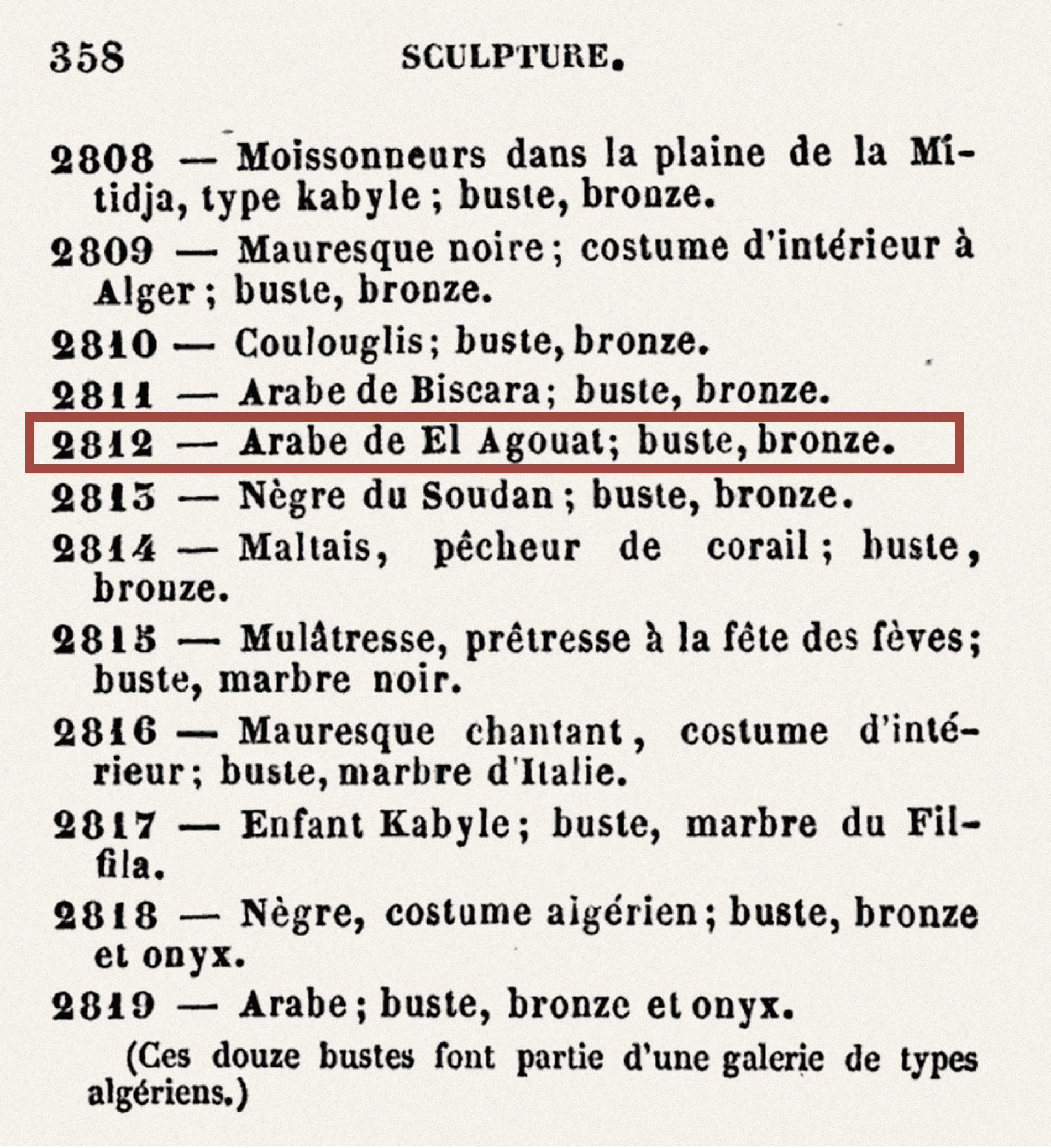 Thanks to a government grant, Cordier was sent to Algeria in 1856 where he executed many portraits, and it was under the title of “Arab of El Aghouat” that he presented the bronze bust made from our chief model at the Salon in 1857.