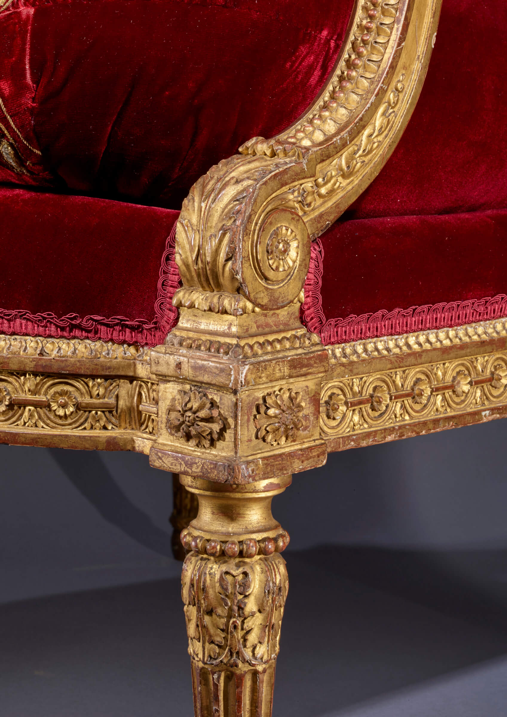 MARKS AND INSCRIPTIONS: N° 3, handwritten mark in black ink, visible several times on the reverse of the seat, designating armchair n° 3 out of the four of this set delivered by Georges Jacob in 1781; cursive letters T S incised on the reverse of one of the seat rails, this very rare inscription was used to designate the Palais des Tuileries during the Revolution, the Consulat and the Empire, as can also be seen on the equally rare printed labels, affixed to a suite of four giltwood armchairs (originally six) executed by Jacob Frères, initially commissioned for the Palais du Directoire exécutif, today the Palais du Luxembourg, but placed in 1800 at the Palais des Tuileries, in the first salon of Joséphine Bonaparte, on the ground floor of the south wing of the palace; these armchairs are today preserved in the Mobilier national, in Paris (inv. GMT 1445/004) ; E. de Rostchild [sic], handwritten inscription in black pencil, visible beneath one of the seat rails, designating Baron Edouard Alphonse James de Rothschild (1868-1949) ; R.MA., capital letters handwritten in black paint on the reverse of one of the seat rails, signifying Rothschild Marine, an inventory mark used by the Einsatzstab Reichsleiter Rosenberg (Reichsleiter Rosenberg Taskforce), which was responsible for the confiscation of property belonging to Jews and Freemasons in the territories occupied by the Germans.