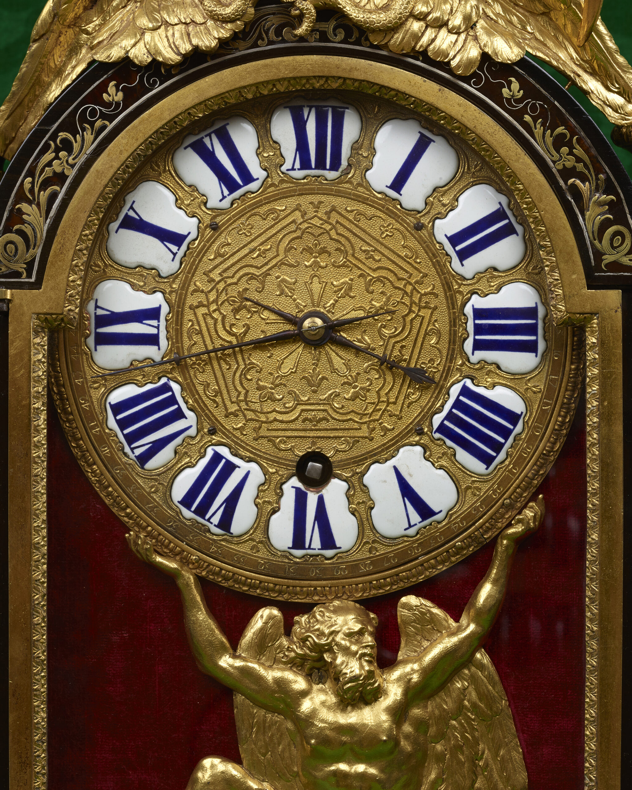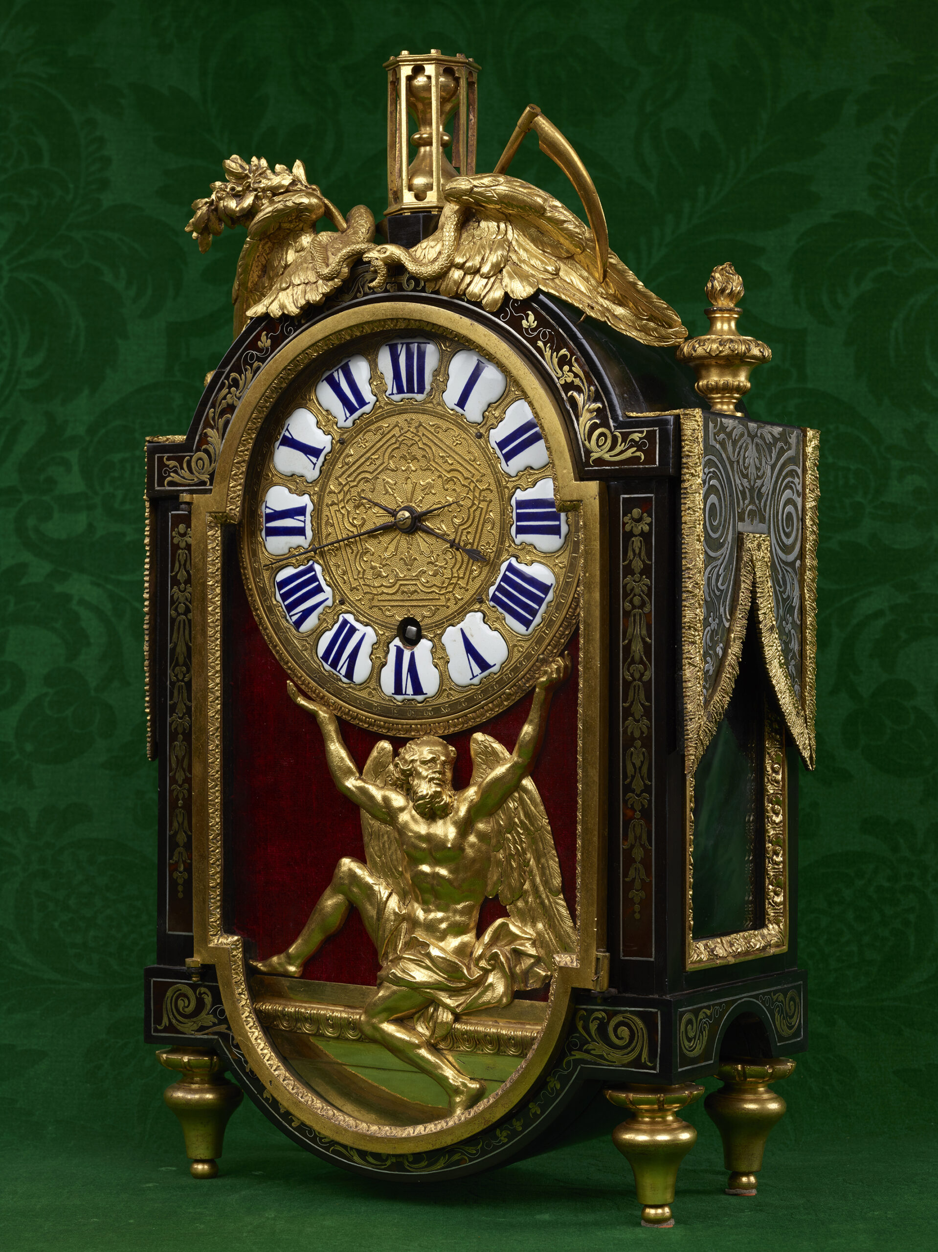 This rare model of Boulle marquetry quadrangular clock, enhanced with inlays of copper and gilded bronze, standing on four toupie feet and crowned with a gilded bronze hourglass, is the work of the renowned cabinetmaker André Charles Boulle (1642-1732). The whole piece is veneered with tortoiseshell tinted in black or dark red, enriched with thin lines of brass and bordered with gilt bronze rods adorned with interlacing friezes. The central part of the clock is equipped with a large enameled dial supported by the figure of a winged Chronos seating on the lower sleeper of the case. On each side, the clock is flanked by a tablier motif adorned with foliate scrolls topped with a burning cassolette and completed with simulated fringes. The pediment is adorned in its center by two chimeras, half-eagle, half-snake, facing each other, one holding the tail of the other in its mouth. Each chimera holds an attribute between its wings : one is holding a scythe – the symbolic attribute of Chronos used to cut the thread of life, the other is holding a laurel branch. Inside the case, the movement is signed by Pierre Fardoil, clockmaker of the Grand Conseil de Sa Majesté.