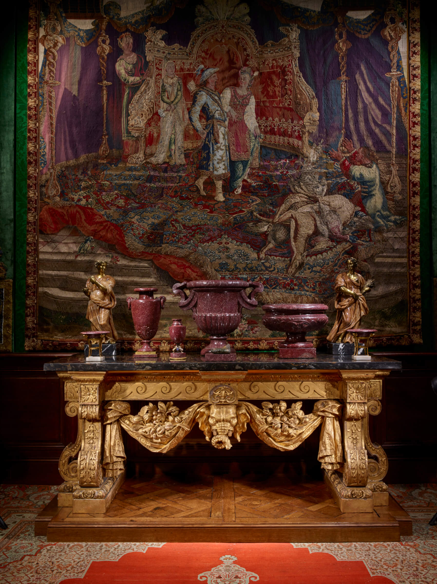 A rectangular Portor marble top completes the ensemble. This console belongs to a very small corpus of neo-Palladian tables and chairs, all dating from circa 1740, displaying this extremely rare and highly unusual emblem of an elephant’s head, in addition to a decorative repertoire similar to ours, in particular the rails with moulded edges and wave-scrolled friezes set against a contrasting amatis background. A pair of sofas and a pair of stools with these characteristics were executed on behalf of Hugh Fortescue (1696-1751), 14th Baron Clinton, future 1st Earl of Clinton and 1st Baron Fortescue, at Castle Hill, near Filleigh, in the county of Devon; (ill. 3) The stools later became part of the collection of Claus von Bulow (1926-2019) and his wife Martha Sharp Crawford (1932-2008), known as ‘Mrs. Sunny’, at Clarendon Court in Newport, Rhode Island. Each adorned with a modern marble top that converted them into small tables, they were sold by Sotheby’s in New York on 28th and 29th October 1988, lot no°. 475, and purchased by Mallett & Son Antiques in London, who resold them in 1989 to Ann and Gordon Getty. (ill. 2)