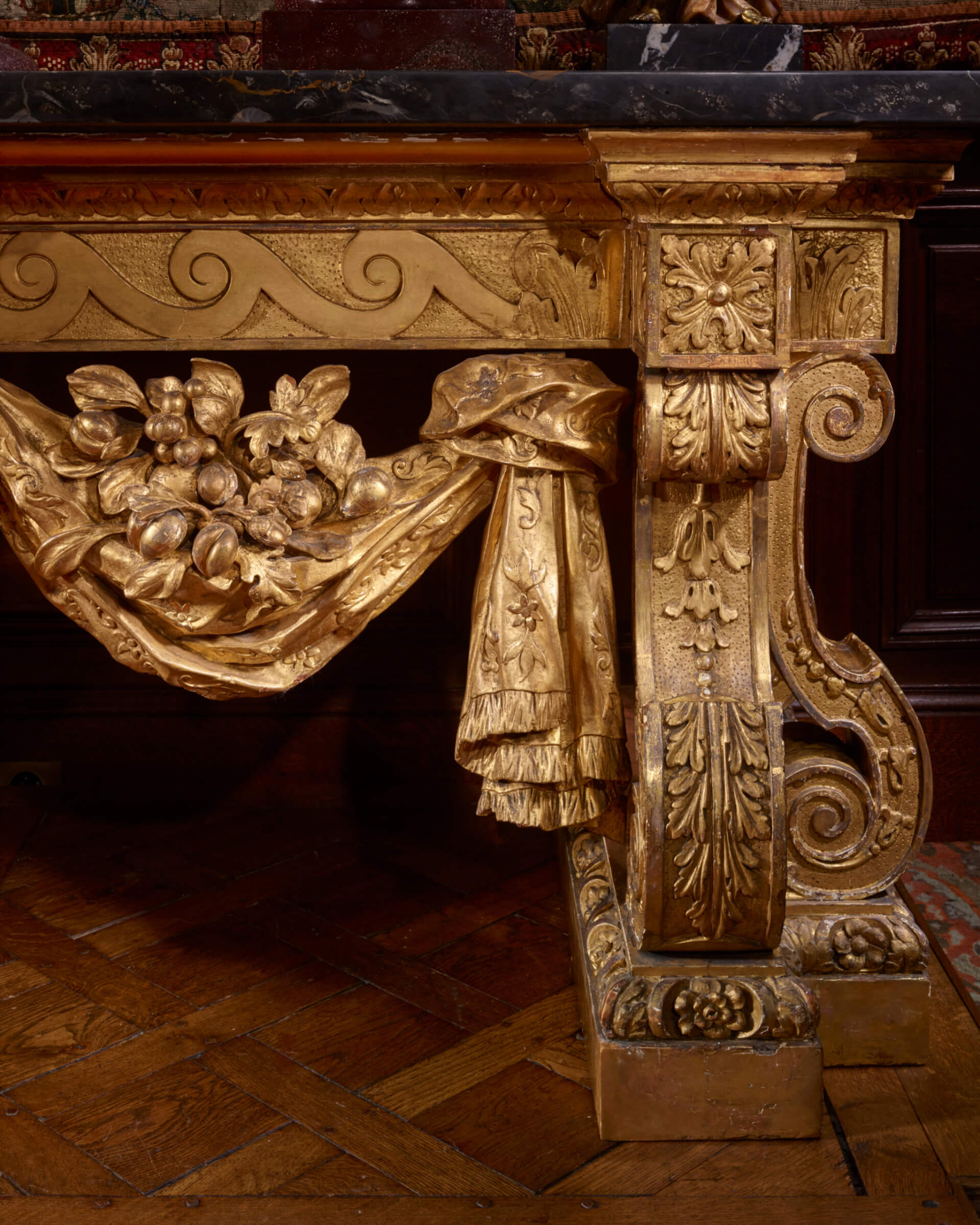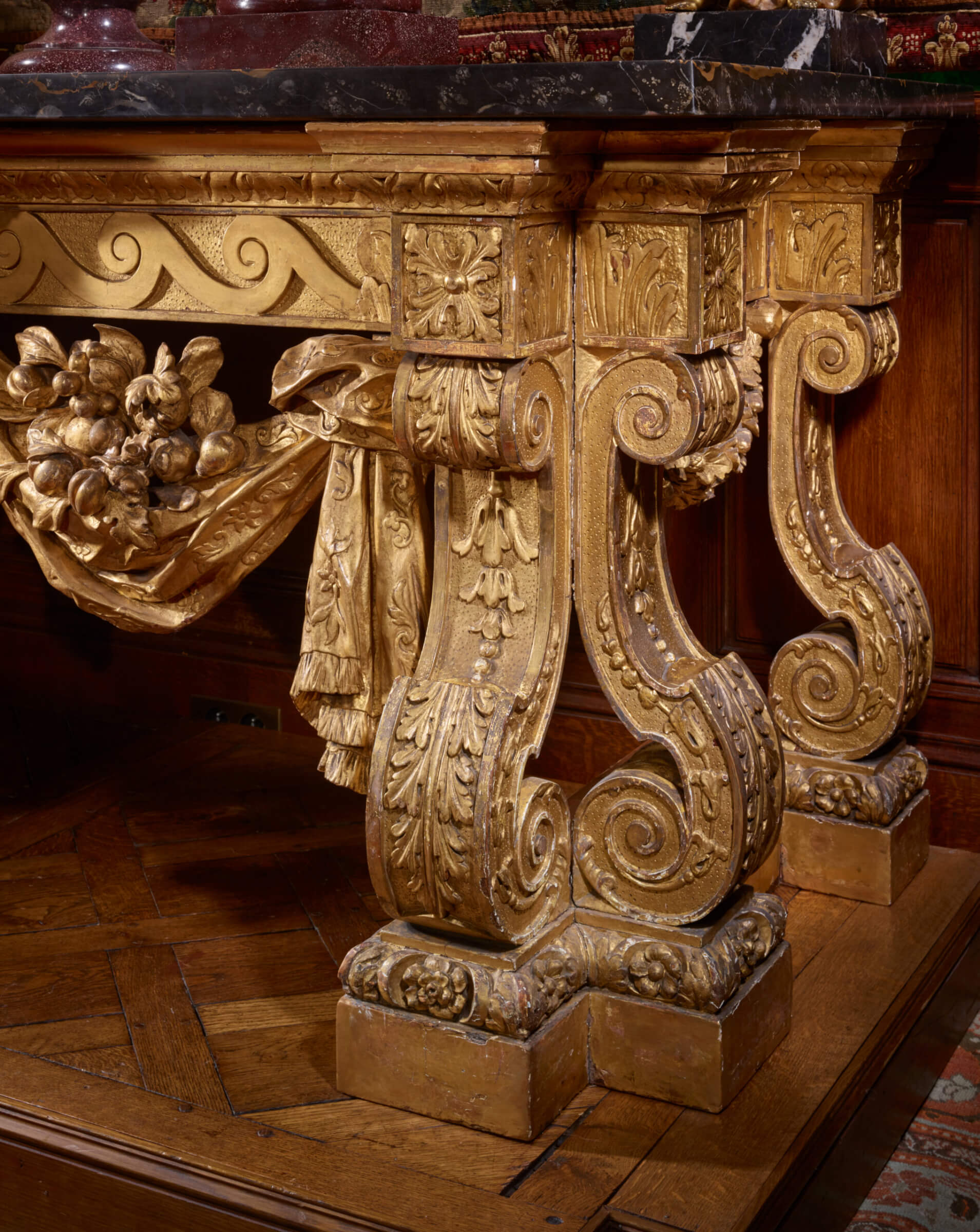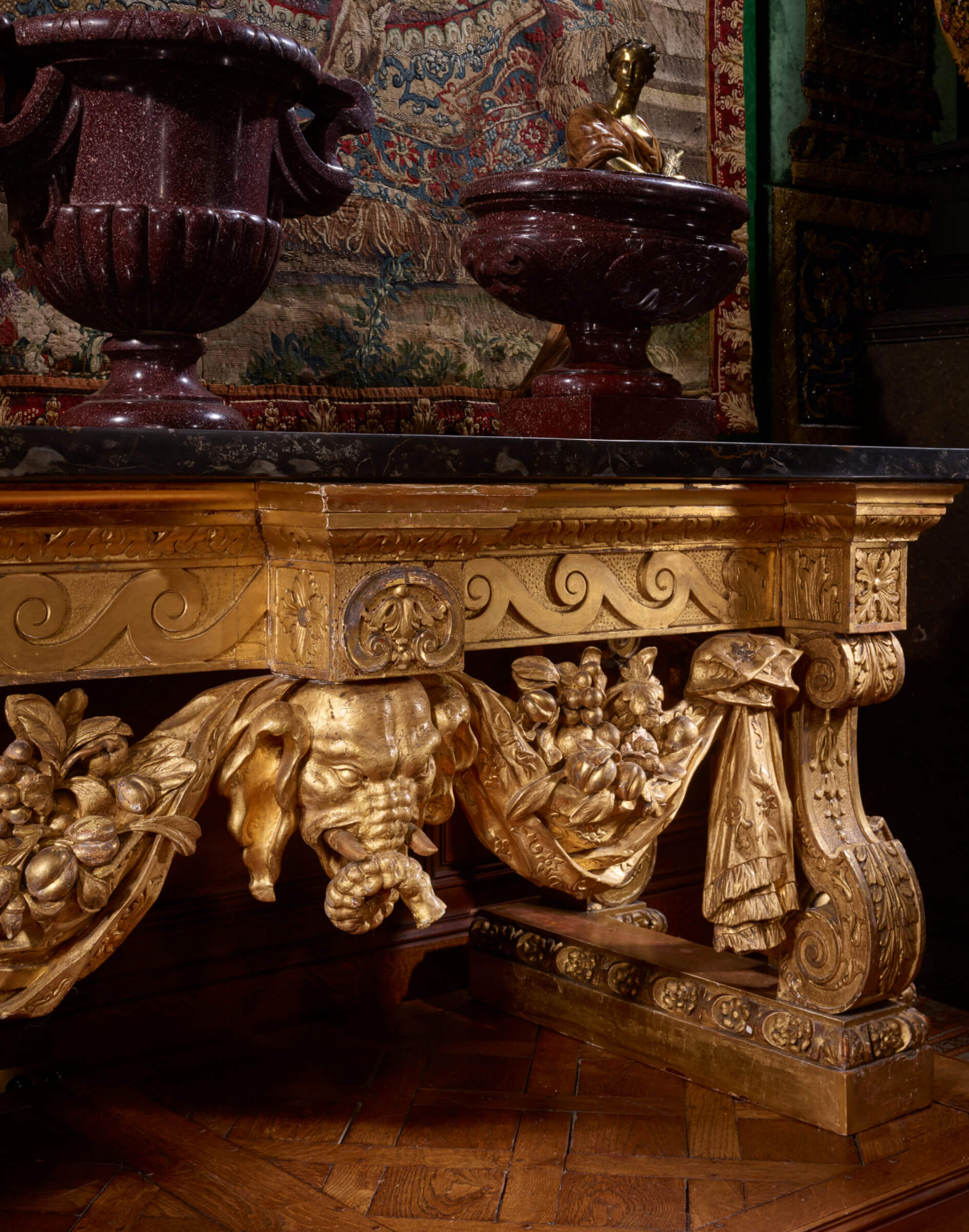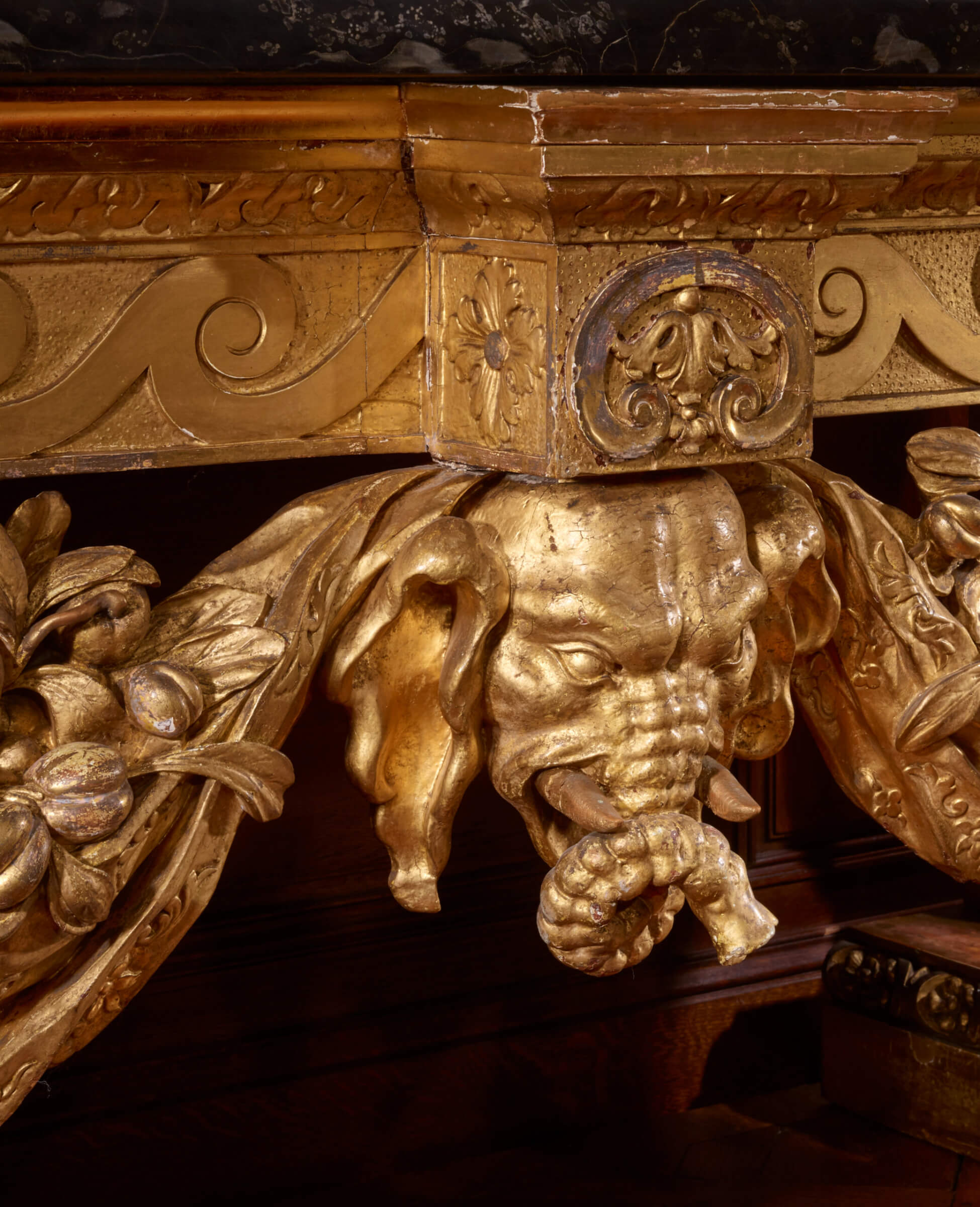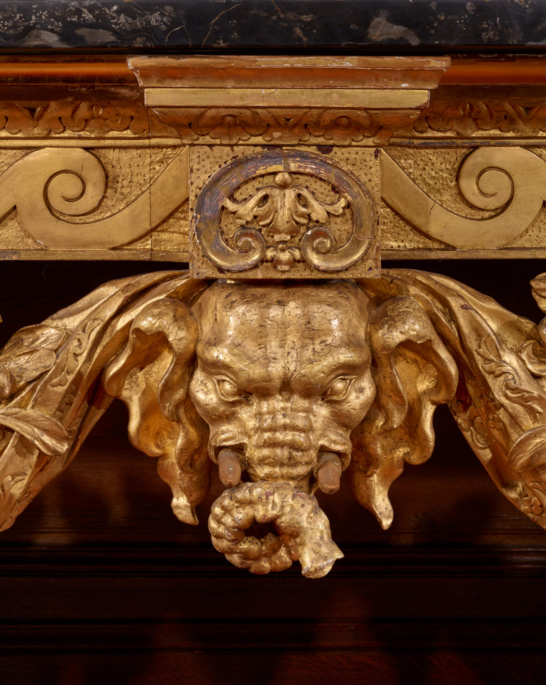 Rectangular in shape, it displays a powerful moulded rail, adorned with ample flat wave-scrolled friezes contrasting against dotted backgrounds, surmounted by a moulded cornice forming a wide overhang, with an ogee-shaped edge which is carved around its entire contour with a short acanthus frieze, the whole punctuated on the front by three bold projections enhanced with quatrefoils and acanthus leaves. The wider, central projection is distinguished by a circular, scroll-shaped cartouche motif in the form of an inverted pelta, enclosing an acanthus fleuron. An extraordinary elephant’s head, treated au naturel and carved in the round, emphasises the latter, flanked by two powerful accolades composed of rich drapery with floral motifs and fringed borders, each accolade containing a luxuriant composition of fruit and leafy branches, all held together by two lavish knots fixed to the front legs of the console’s base.