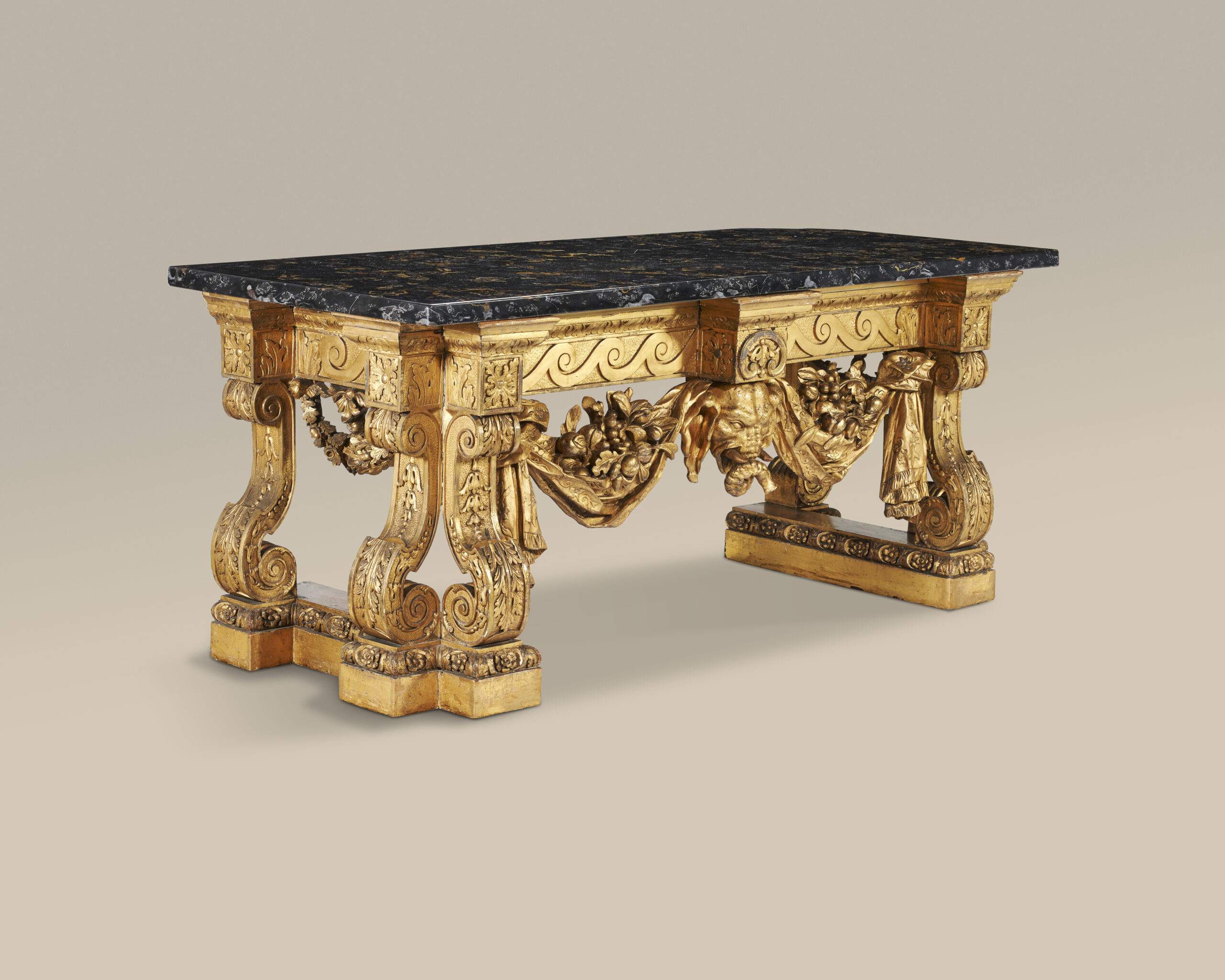 Moulded, carved and oil-gilded pine; Portor marble top.