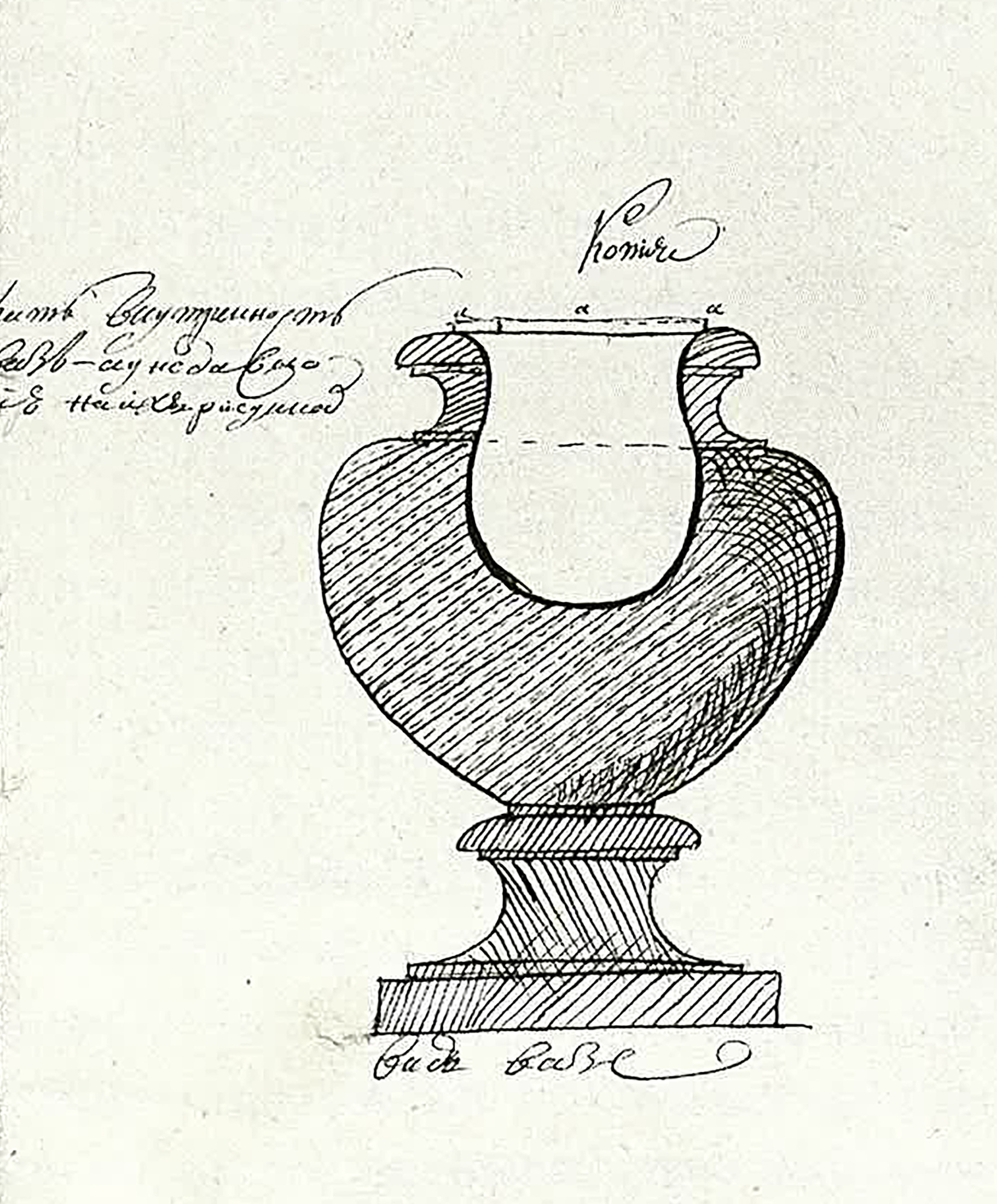 A drawing kept in the Hermitage archives, dated 1803, shows the cross-section of a vase of our model partially hollowed out, accompanied by a handwritten note stating the following wish of Count Stroganov: “I consider it necessary to suggest that from now on, when executing the vases, the interior, as indicated in the drawings, should be removed, both to lighten the heaviness thereof and to preserve their beauty […]”.