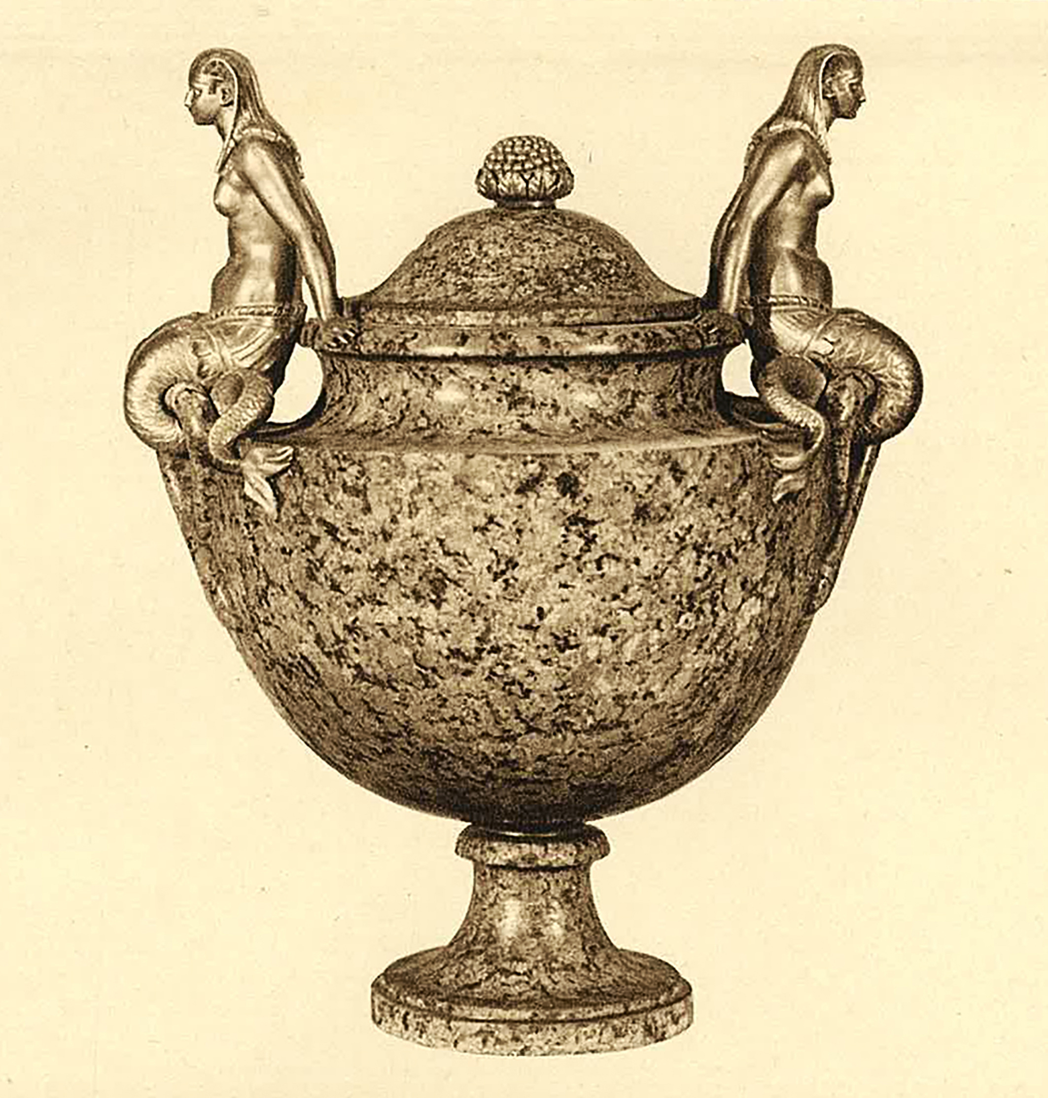 This imposing covered vase, carved in pink granite from the Urals and adorned with two imposing figures of mermaids wearing Egyptian nemes headdresses and a shendyt (loincloth) around their waists, is emblematic of the collection of Count Alexander Sergeyevich Stroganov (1733-1811), who took over the administrative management of the three Russian imperial lapidary manufactories—those at Peterhof, Yekaterinburg and Kolyvan—in 1800. Designed by a major figure of Russian Neoclassicism, Andrei Nikiforovich Voronikhin (1759-1814), the protégé architect of the Count who launched his career, and probably his natural son, the vase was carved circa 1805 at the Imperial Lapidary Manufactory in Yekaterinburg, which is located in the Urals, in western Siberia, and then mounted in gilded bronze in the Imperial Bronze Foundry of Saint Petersburg, founded in 1805 on the instigation of Count Stroganov on Vasilyevsky Island, in a building belonging to the Imperial Academy of Fine Arts.