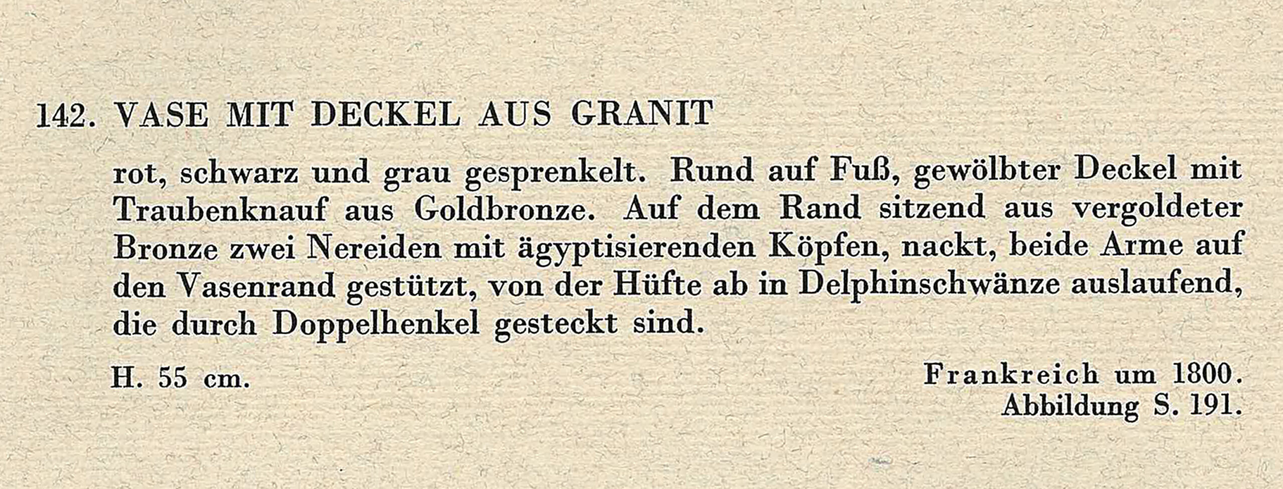 But the most tragic event of all took place in 1929, when the Soviets decided to disperse the collections in their entirety. Extremely valuable sets of works of art and minerals, as well as the contents of the library, were divided between several museums and some of the collections even disappeared without a trace. Another part, including our vase, a large number of paintings and the very best of the French decorative arts, was sold at Rudolph Lepke’s Kunst-Auctions-Haus in Berlin on 12th and 13th May 1931. The sale generated a great deal of publicity and attracted a great many art dealers and collectors from all over the world, including Jacques Seligmann, Guy Stein, Ben Simon, K. Stern, Sabin & David of London, and J. and S. Goldschmidt. Forming lot n°. 142 of the auction, our vase, which was reproduced in the catalogue, was sold for DM 1,700 on 13th May 1931