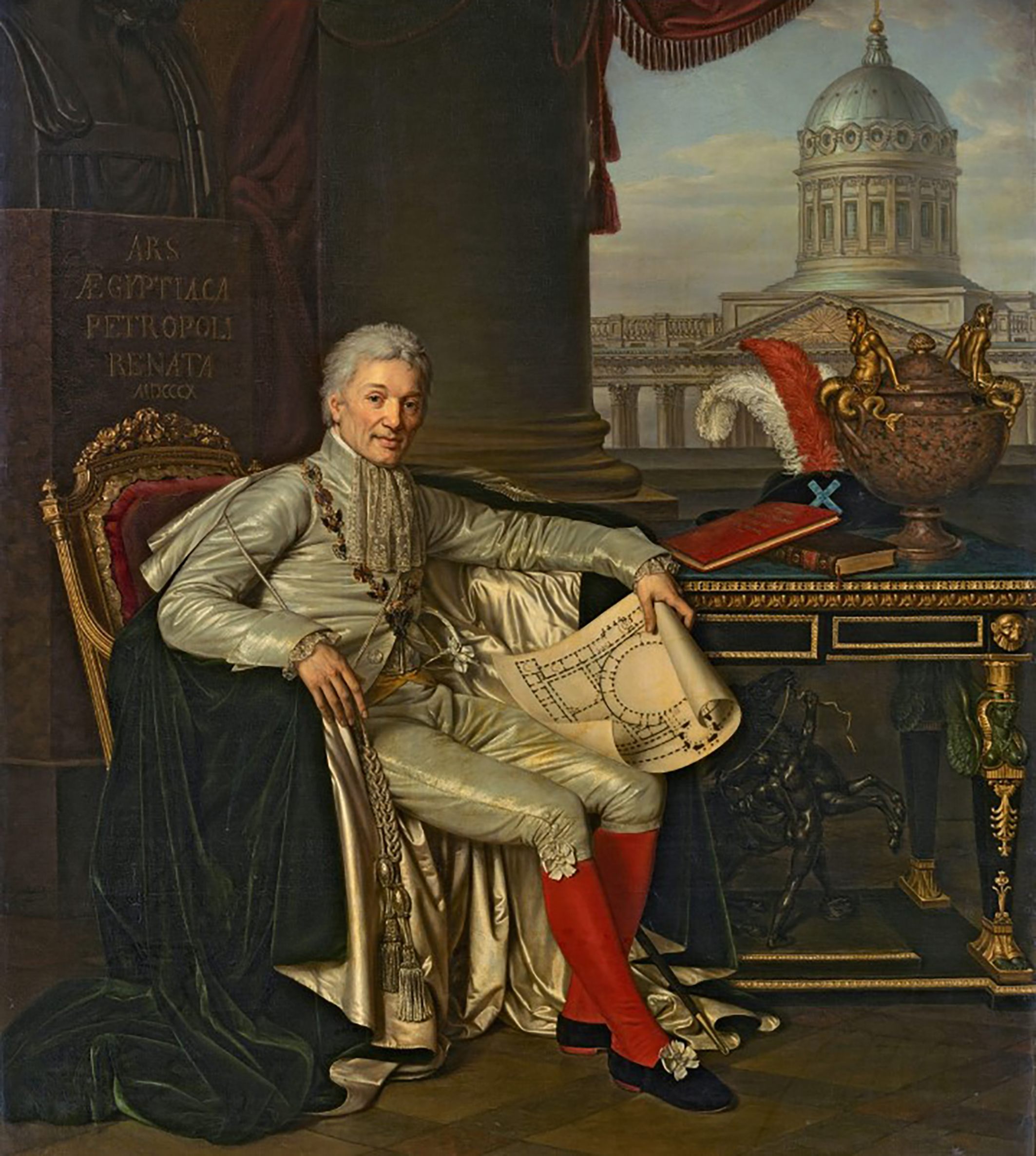 Varnek’s painting leaves nothing to chance, and is a remarkable illustration of the importance of Egyptian iconography, emanating in the first place from the power of the vase, in Count Stroganov’s Freemasonic world. On the right-hand side of the composition, the vase is placed on the lapis lazuli top of the Count’s study in the palace bearing his name, built in 1753 by the architect Rastrelli on the corner of Nevsky Prospekt and the Moika embankment, and appears at the same height as the face of its patron, seated opposite in a sumptuous Louis XVI-style armchair in gilded wood covered with red velvet. The Count wears the habit of a member of the Imperial Order of Saint Andrew the Apostle the First-Called (“Орден Святого апостола Андрея Первозванного”), the first Russian honorary order, founded on 30th August 1698 by Peter the Great, and reserved for the most important figures of the state, both civil and military.