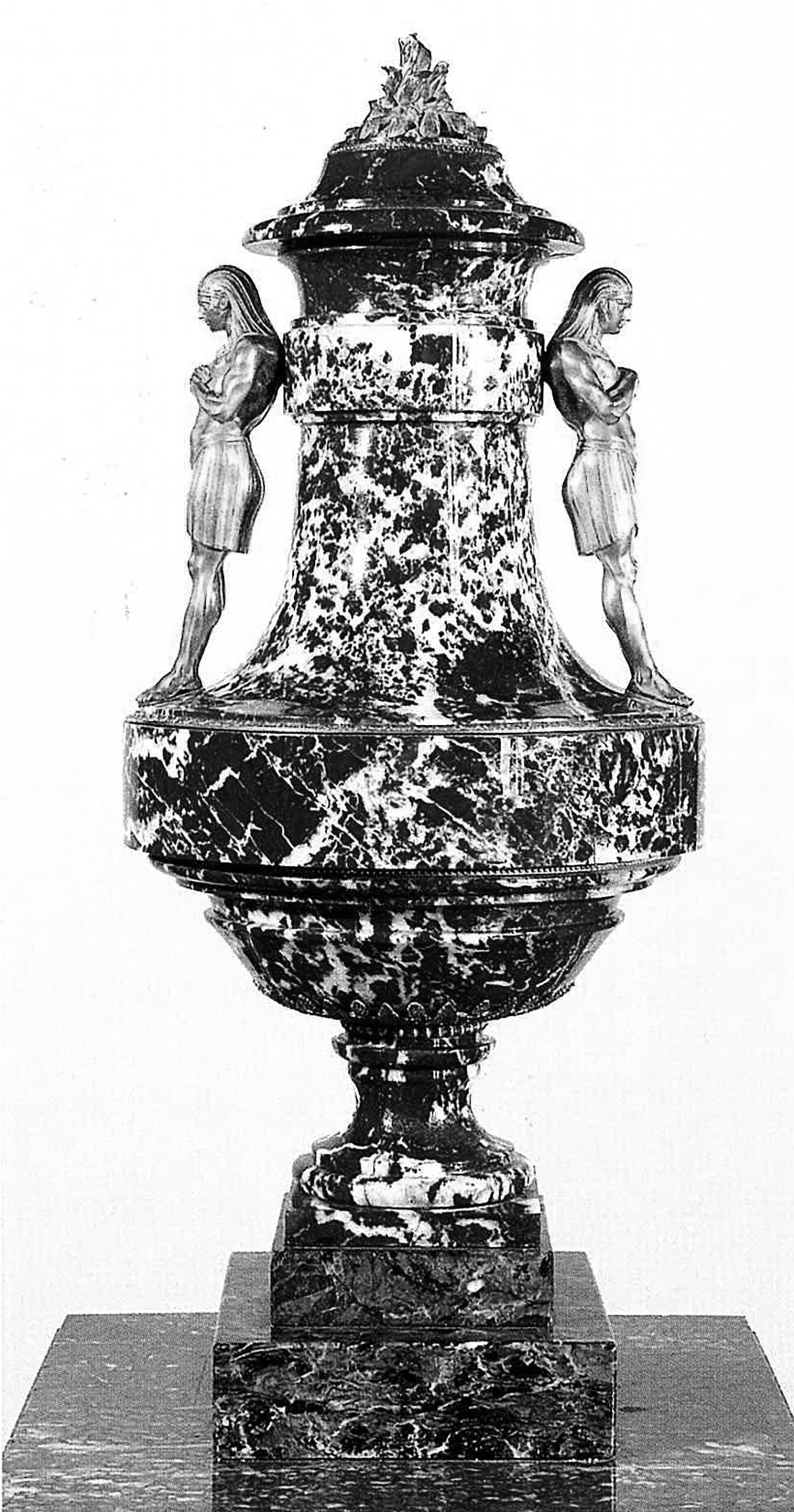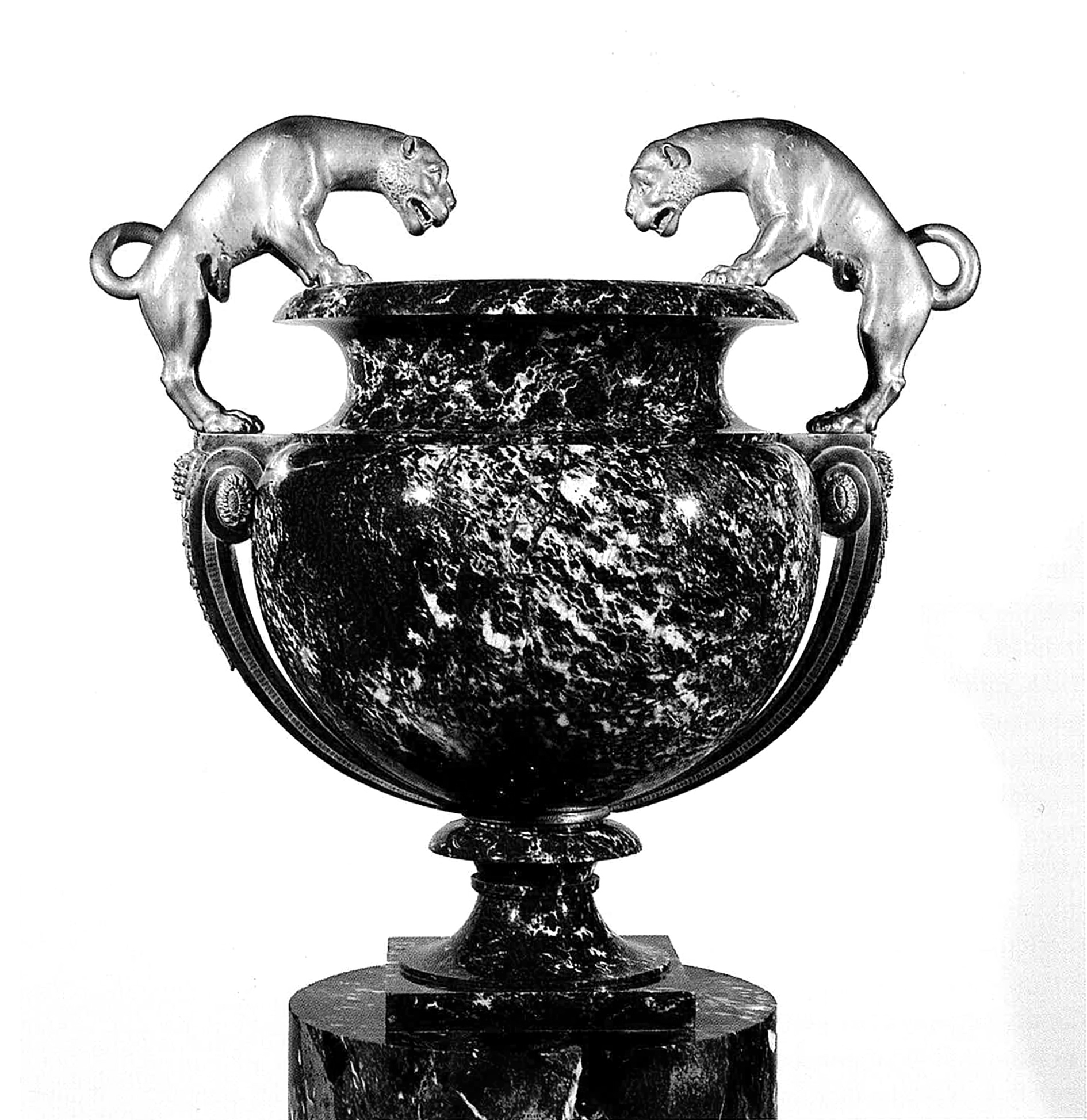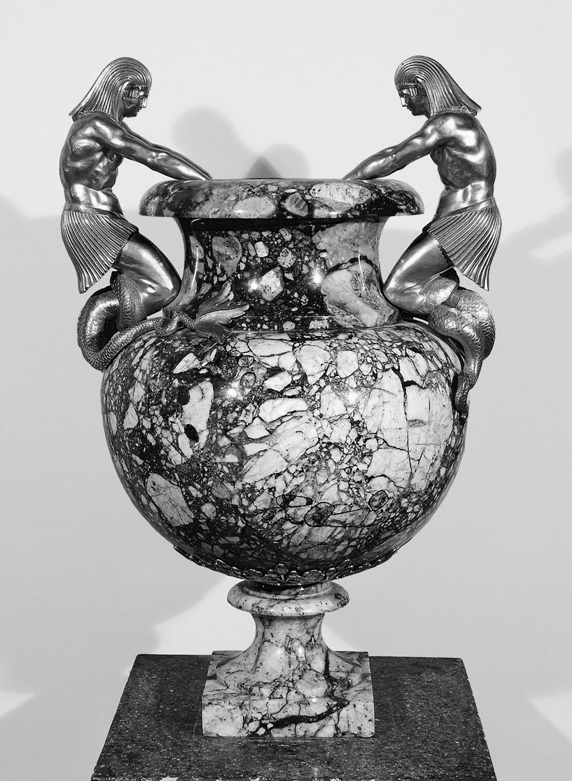 It is reminiscent of several mounted vases, all designed by Voronikhin, now in the collections of the Hermitage Museum in Saint Petersburg, most notably a pair of breccia marble vases with a reddish-brown ground, adorned with two Egyptian figures with triton tails kneeling on either side of the collar and holding the neck with their outstretched arms.