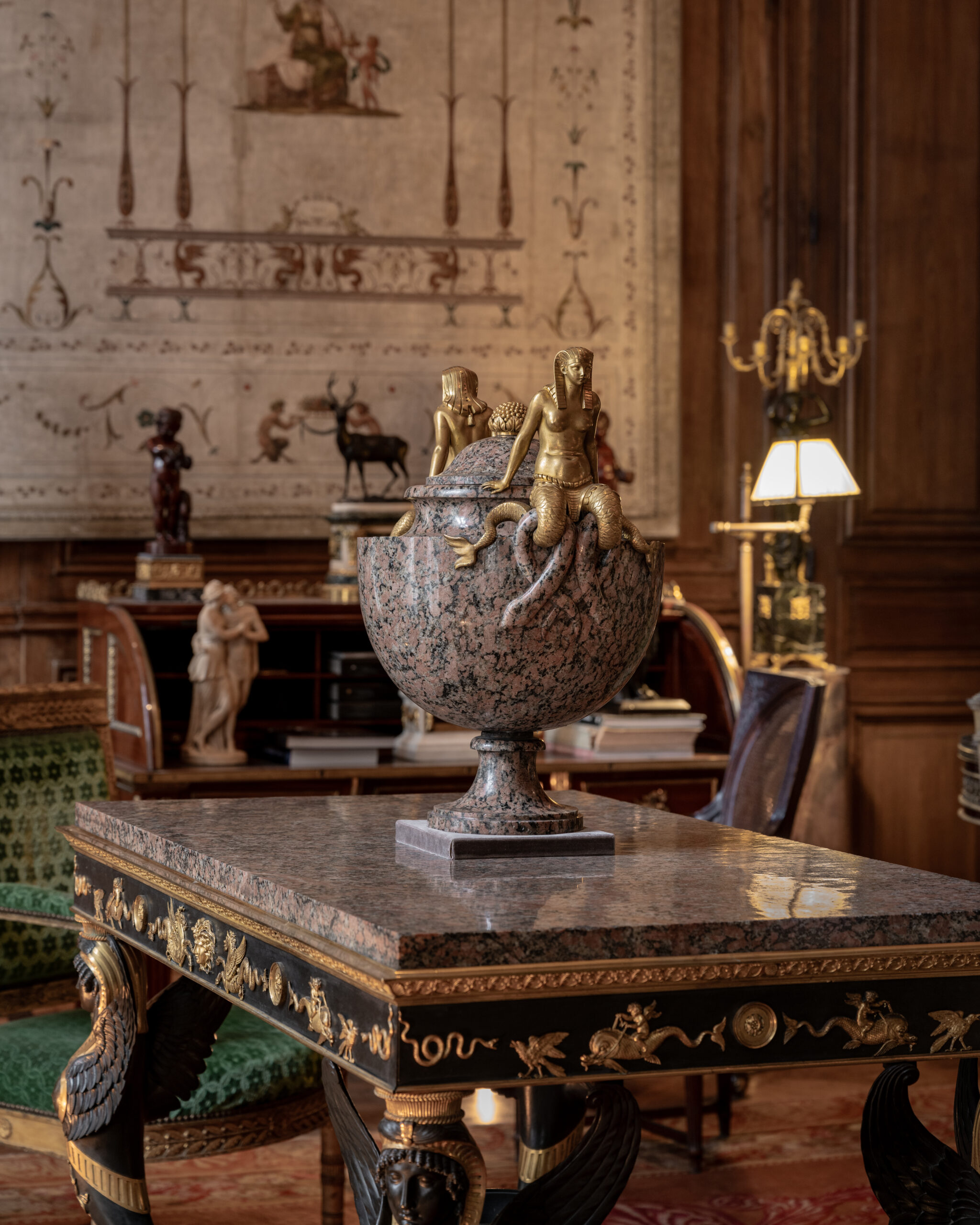 This imposing covered vase, carved in pink granite from the Urals and adorned with two imposing figures of mermaids wearing Egyptian nemes headdresses and a shendyt (loincloth) around their waists, is emblematic of the collection of Count Alexander Sergeyevich Stroganov (1733-1811), who took over the administrative management of the three Russian imperial lapidary manufactories—those at Peterhof, Yekaterinburg and Kolyvan—in 1800. Designed by a major figure of Russian Neoclassicism, Andrei Nikiforovich Voronikhin (1759-1814), the protégé architect of the Count who launched his career, and probably his natural son, the vase was carved circa 1805 at the Imperial Lapidary Manufactory in Yekaterinburg, which is located in the Urals, in western Siberia, and then mounted in gilded bronze in the Imperial Bronze Foundry of Saint Petersburg, founded in 1805 on the instigation of Count Stroganov on Vasilyevsky Island, in a building belonging to the Imperial Academy of Fine Arts.