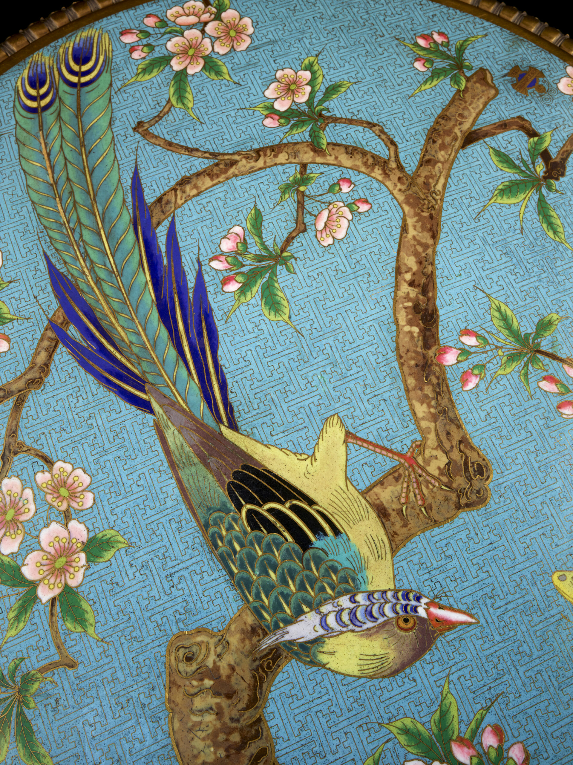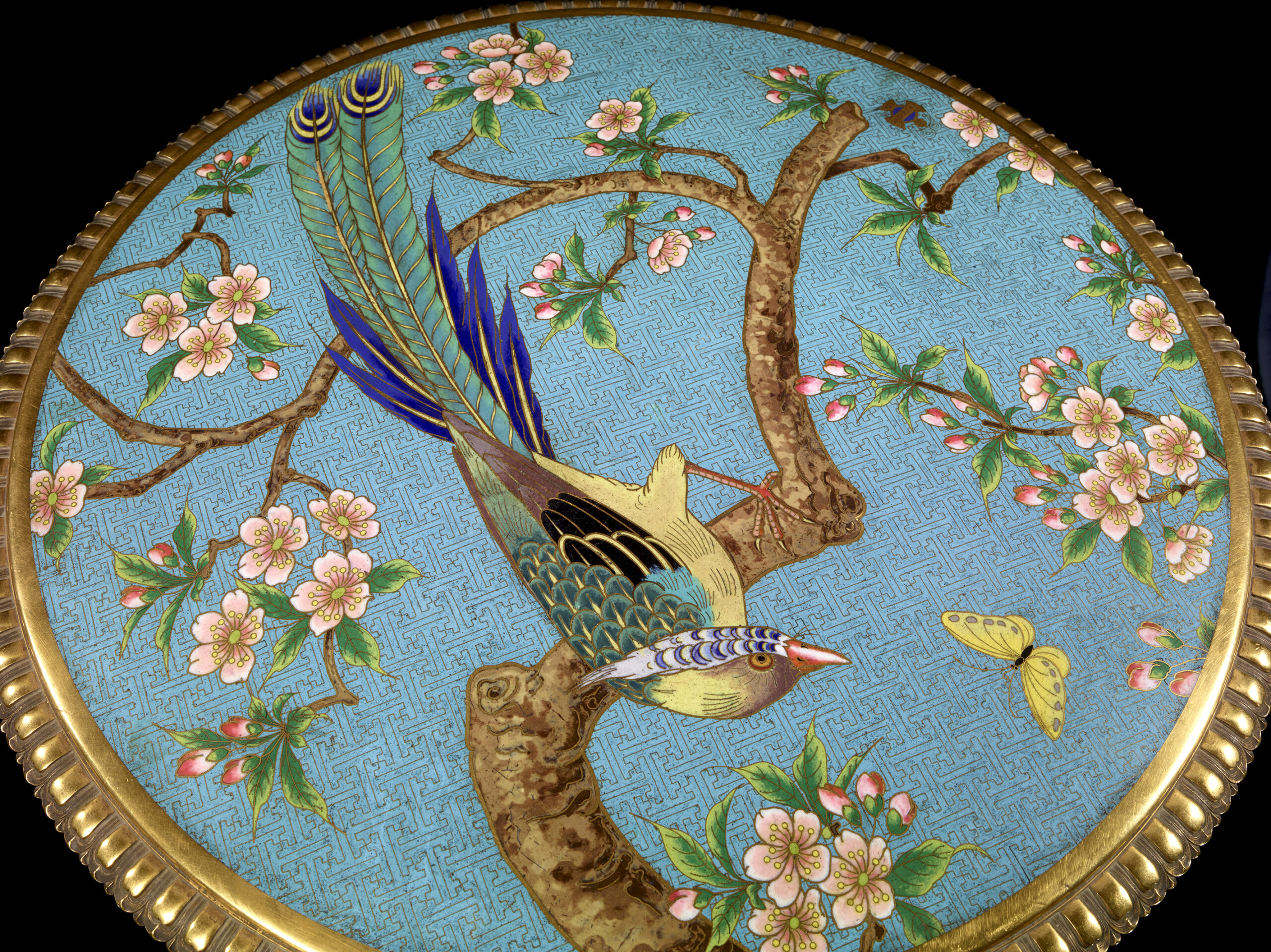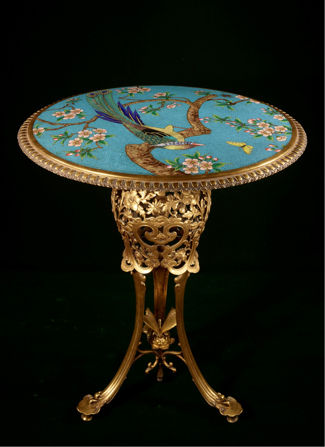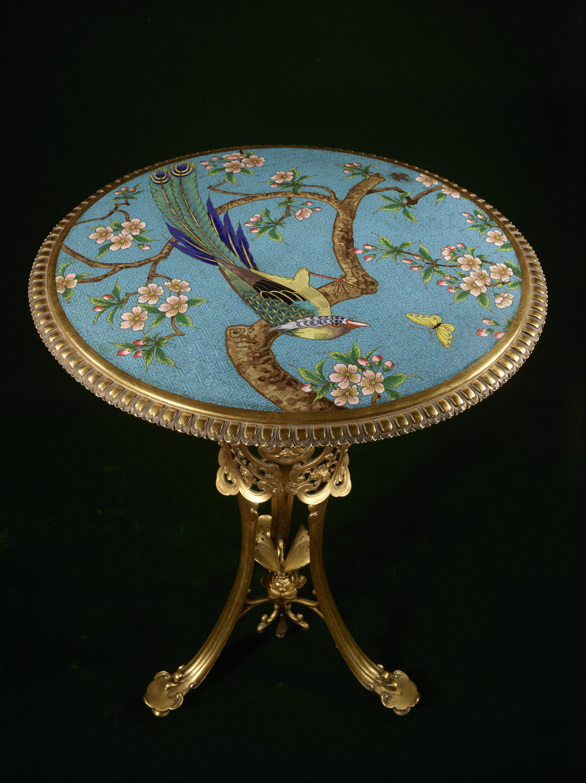 Executed in gilded bronze with a tray in cloisonné enamel, it was created in 1885 and used to illustrate the expertise of the Maison Christofle in this field at the Exposition Universelle of Paris in 1889, then at the Exposition des arts de la femme, organised by the UCAD (Union Centrale des Arts Décoratifs) at the Palais de l’Industrie of Paris in 1891. Designed by Emile Reiber (1826-1883), director of the design workshops at Christofle, perhaps in collaboration with Edouard Lièvre (1828-1886), it displays a luxuriant cloisonné enamel tray with a turquoise blue ground executed by Antoine Tard (a renowned enameller who was active at the Maison Christofle between 1860 and 1889). The tray features a bird reminiscent of a Japanese paradise flycatcher, with rich plumage of predominantly green, yellow and lapis blue tones, resting on the branch of a blossoming plum tree and observing a yellow butterfly flying right in front of it.