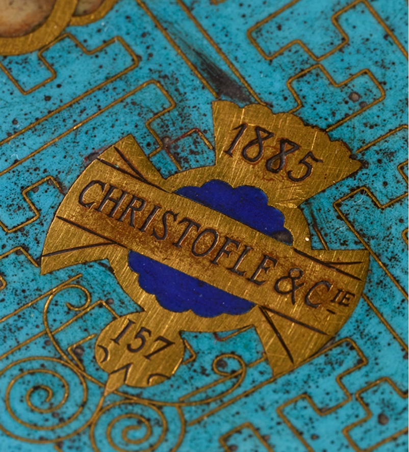 The model of this gueridon was created in 1874, with a first example, similar to ours, which was acquired by Henri d’Orléans (1822-1897), Duke of Aumale and fifth and penultimate son of King Louis-Philippe I, between 1874, the date of its creation indicated on its tray, and 1879, the date on which it was mentioned for the first time at the Château de Chantilly, in the Cabinet d’angle (Corner Room) of the Grand Apartement of the Duke. The Duke may have acquired it as early as 1874, on the occasion of the Exposition de l’Union Centrale des Beaux-Arts appliqués à l’Industrie, where the Maison Christofle presented on its stand three gueridons with cloisonné enamel trays, the description of one of which matches our model perfectly. He might also have acquired it in 1878, at the Exposition Universelle that was held that year in Paris, where Christofle presented a gueridon of our model visible in an engraving by Henri Toussaint published in the Gazette des Beaux-arts: courrier européen de l’art et de la curiosité, volume XVIII, 2nd period, Paris, 1st September 1878, p. 227.