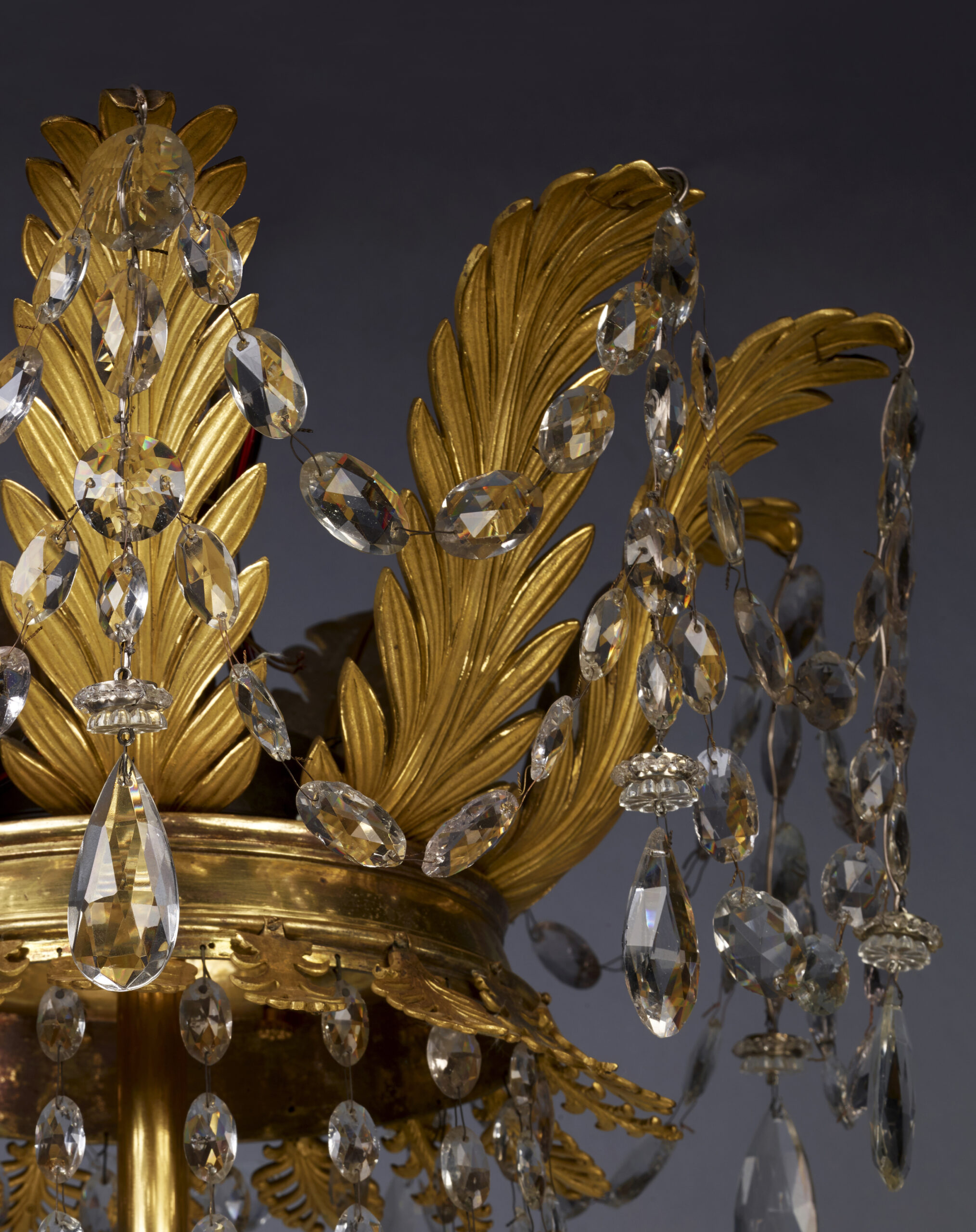 Remarkably chiselled and still displaying its original gilding, this chandelier is structured around a large central vase in the shape of a ‘loutrophorus’ with a plain body, enhanced at the neck with a flared frieze with alternating fleurons and lanceolate leaves. The vase rests on a pedestal and a circular plinth with plain doucines, all attached to a lavish ‘corbeille’ (basket) adorned with foliage masks, stylised palmettes, enhanced by scrolled fleurons and rosettes, friezes of raies de coeur, and a luxuriant corolla combining acanthus and lanceolate foliage. A first row of eighteen arms of light ‘en console’ with scrolled rosettes, each underlined by a large palm leaf with stylised seeds and terminating in a flared bobeche chiselled with foliage motifs, emerges from rosettes that punctuate the waist of the ‘corbeille’, enhanced by a second row, of a smaller diameter, made up of nine additional lights attached to the waist of the ‘loutrophorus’ vase described above. A gilded bronze stem links the latter to a circular ‘pavilion’ crowned with tall palmettes in stylised ‘consoles’, lined with a frieze of similar short palmettes but facing downwards. A rich ornamentation of garlands of crystals, pendants, pampilles and faceted pears rounds off the dazzling décor of this chandelier, a testament to the most luxurious pieces that were executed in Paris during the Empire period.