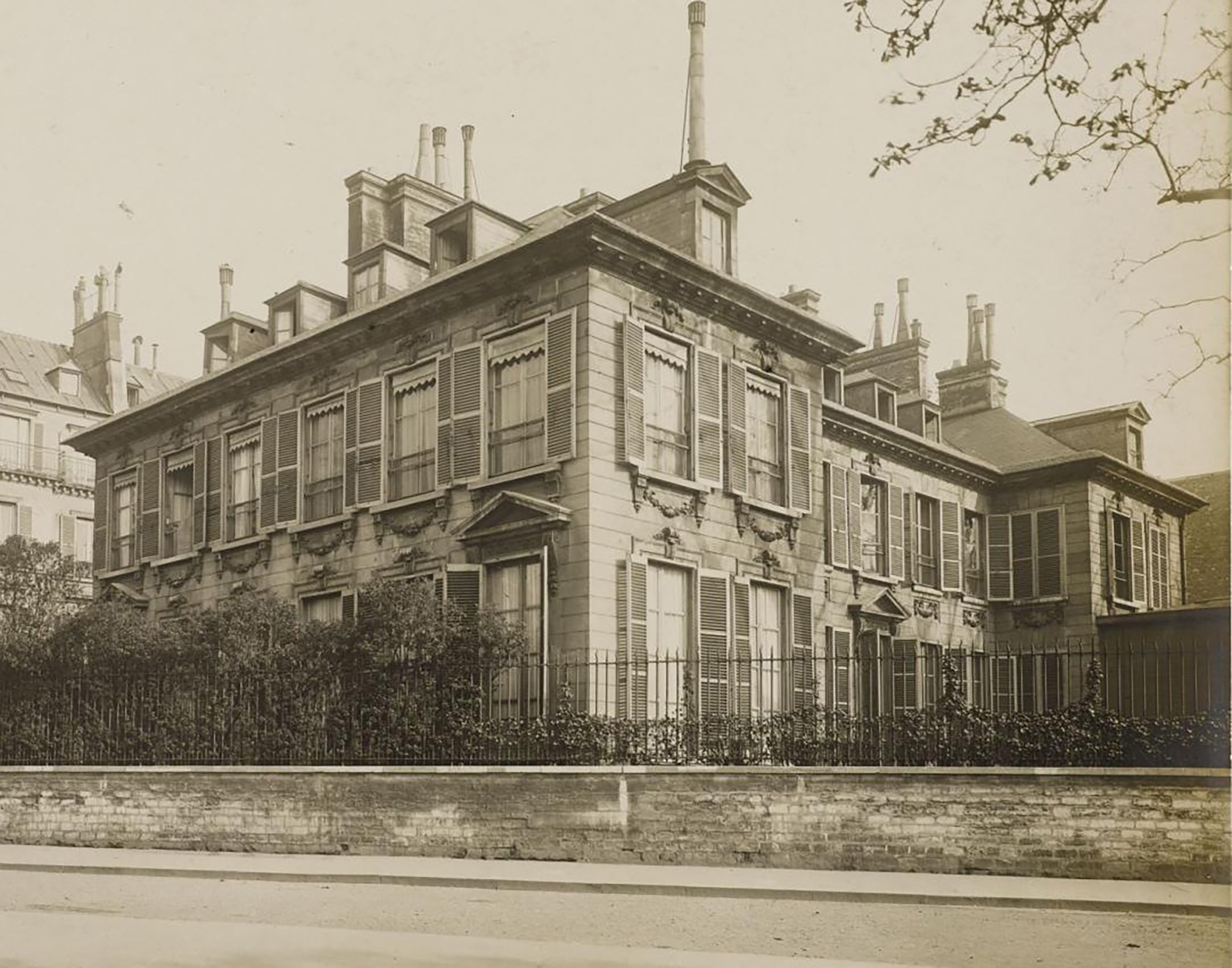This 18th century town house was built between 1777 and 1779 by the architect Jean-Baptiste Le Boursier for Denis-Philibert Thiroux de Montsauge, Esquire, seigneur of la Bretêche Saint-Nom de Champillot, administrateur général des Postes, at least since 1756, and receveur général des Finances of Paris, who had married the daughter of the fermier général Étienne-Michel Bouret. This hôtel was successively occupied by prestigious guests: it was acquired by the Duke of Richelieu in 1788; seized as émigré property in 1793; purchased by Bonaparte, First Consul, in 1802; rented to Count Ferdinando Marescalchi, Ambassador of the Kingdom of Italy in Paris in 1805; acquired by the Countess of Durfort in 1815 and occupied by her daughter the Countess of Juigné in 1827; it was sold to Count Charles de Flahaut in 1830, who occupied it with his family for twenty-three years.