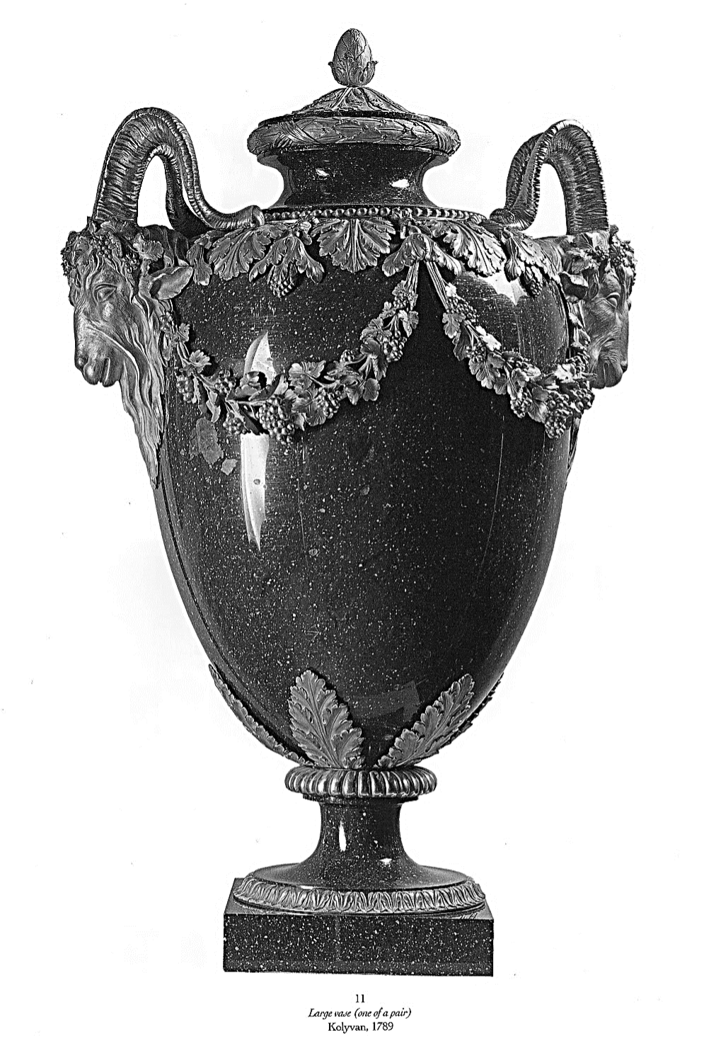 It is at this time that our vases were adorned by gilt-bronze mounts with superb goat heads, ordered to the Swiss-born bronzier Pierre Agis (1752-1828). Agis created these mounts in such a way that they were not attached to the stone but simply set into it. Sadly, the Tsar Paul I had very little time to enjoy these vases and his new palace as he was assassinated in 1801.