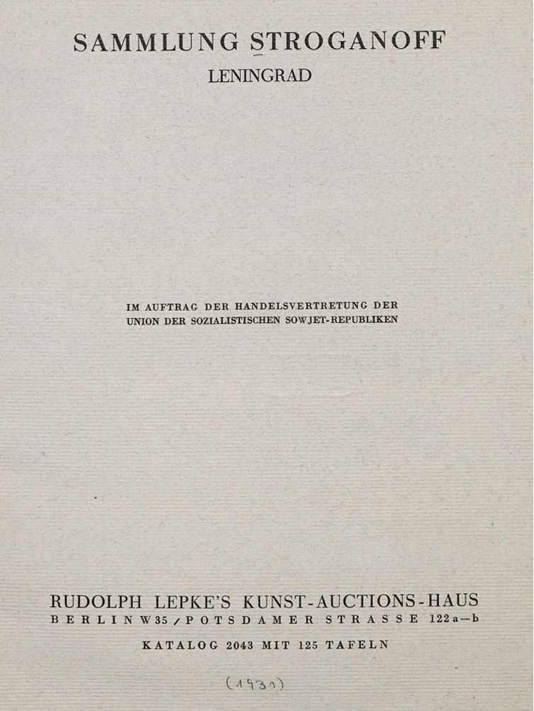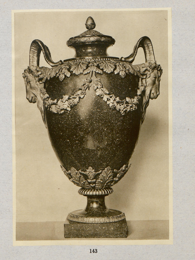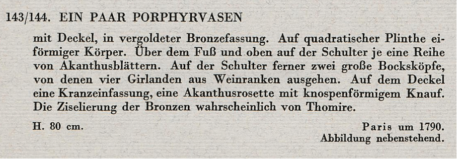 After his death, the contents of the Mikhailovsky Palace were eventually removed and sold to members of the Court and at public auction. A pair of vases similar to ours was then acquired by Stroganoff. It remained in the family until being confiscated by the Soviet government and offered for sale with an important part of the Stroganoff collection at the famous auction house Rudolph Lepke, 122 a-b Potsdamer Strasse, Berlin, on May 12 and 13 1931. Forming lots N° 143 and 144 of the auction, the vases were described as being French, dated circa 1790, with bronze attributed to Pierre-Philippe Thomire. They were not sold and were returned to Russia to the Hermitage Museum, Saint-Petersburg, then finally transferred to Pavlovsk Palace where they remain today.