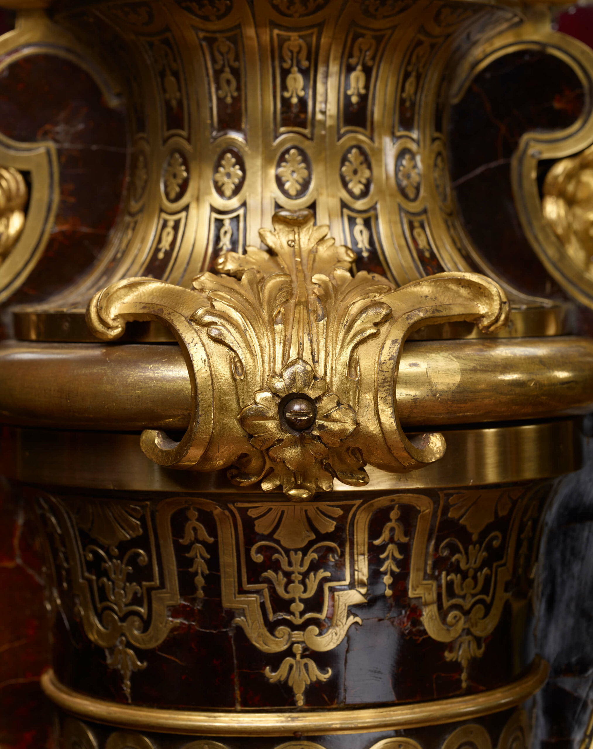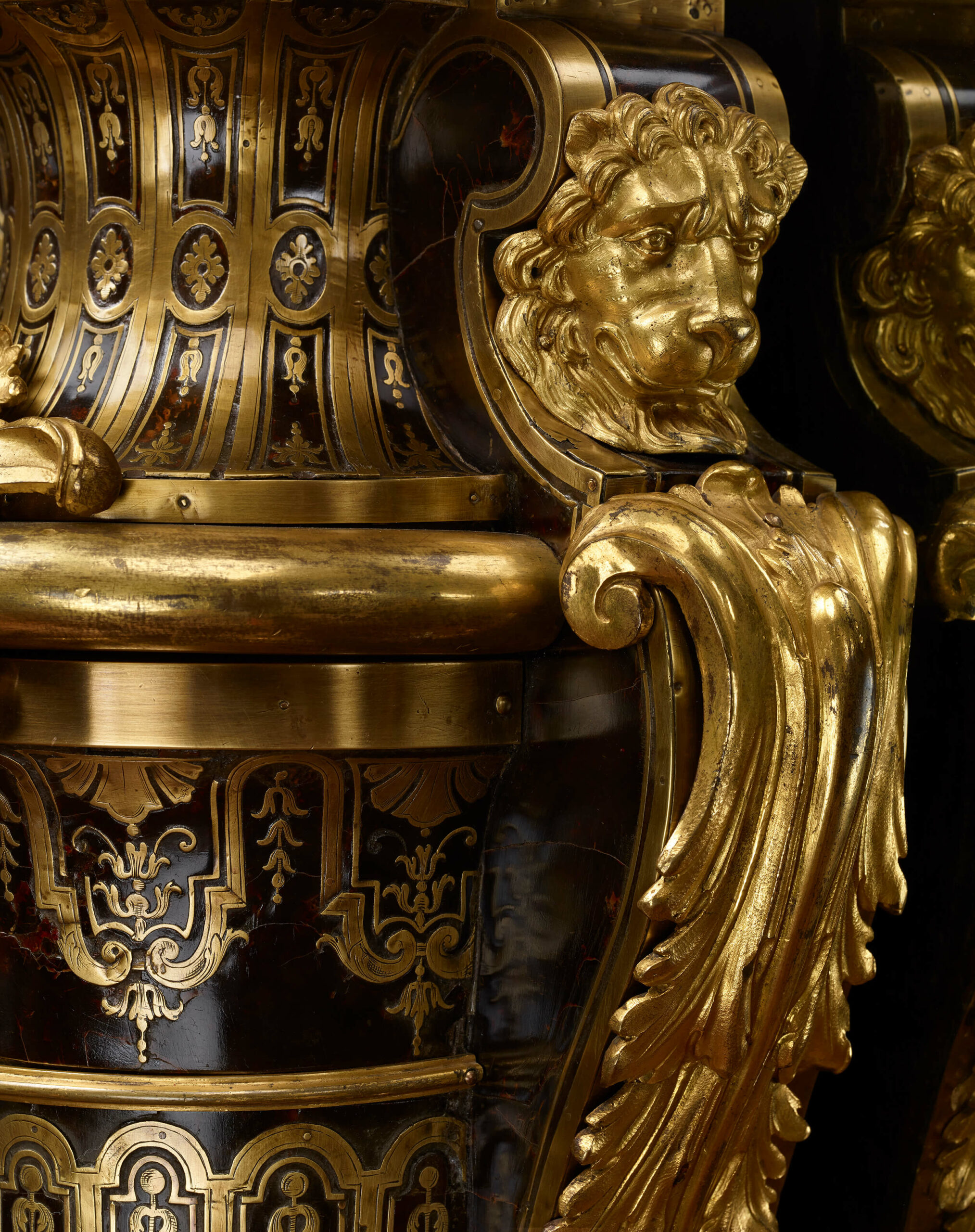 ‘Boulle’ marquetry of loggerhead (Caouane) tortoiseshell, copper and pewter and blackened oak, ornamentation of chiselled and gilded bronze.