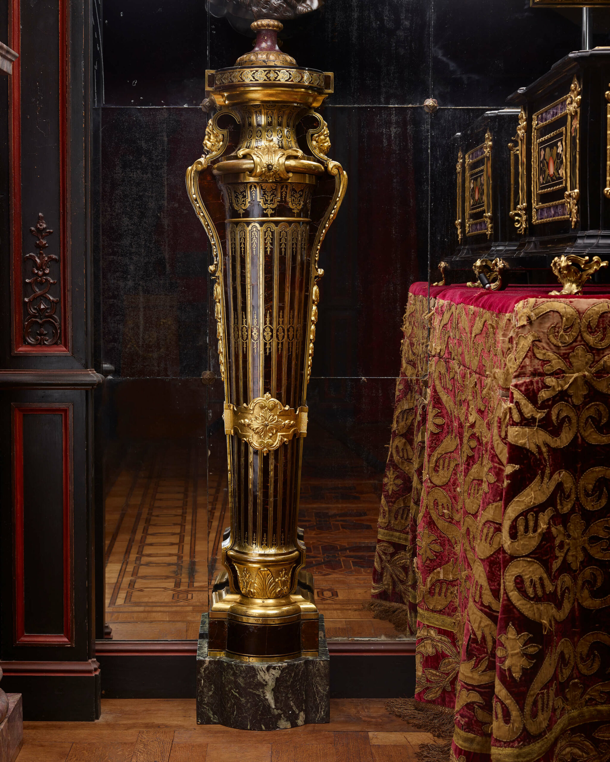 View of the pair of gaines by André-Charles Boulle forming the pendant in contre-partie to our gaines in the State Dining Room of the Dukes of Devonshire at Chatsworth House.