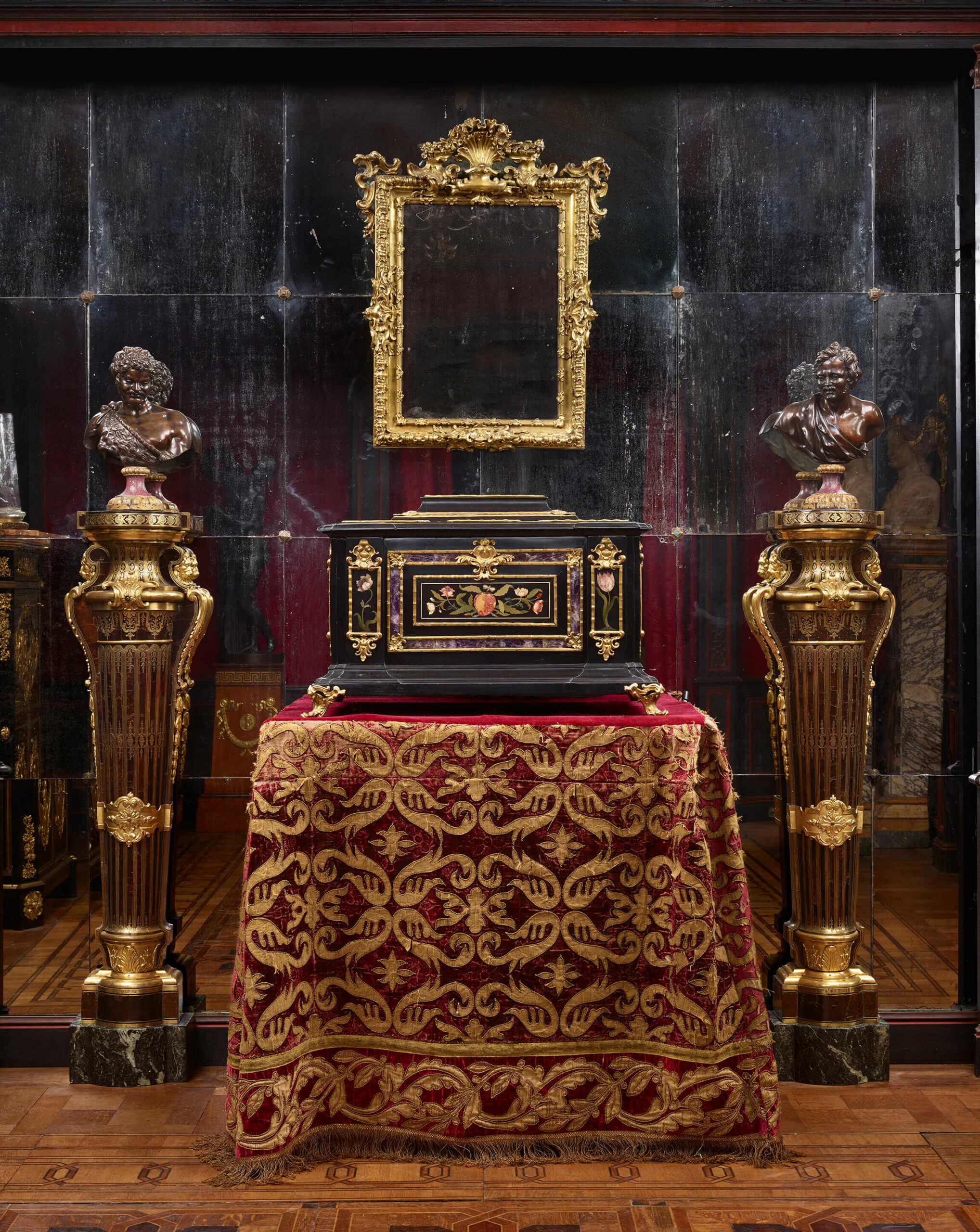 On the first floor on Place Vendôme and in the three cabinets of the wing flat, the cymas of crimson or green damask were covered with paintings by the greatest masters hanging in three rows. They were so many that they were also hung on the panelling, the mantelpieces, the doors and the tapestries. Underneath, hundreds of pieces of Chinese or Japanese porcelain, precious marble vases and bronzes covered the Boulle furniture or the lacquered furniture from the Far East, sometimes piling up on the floor between the legs of the furniture.