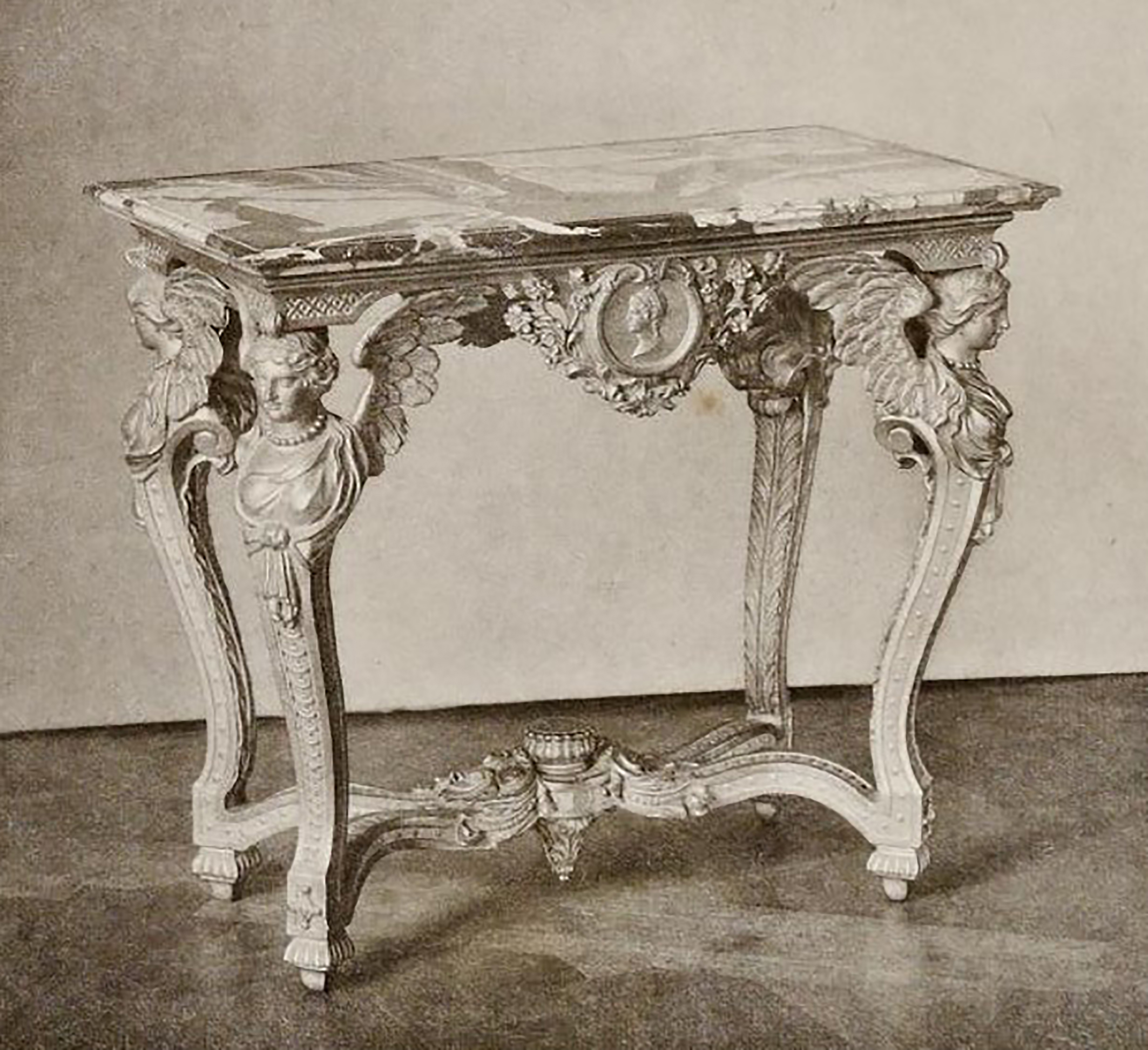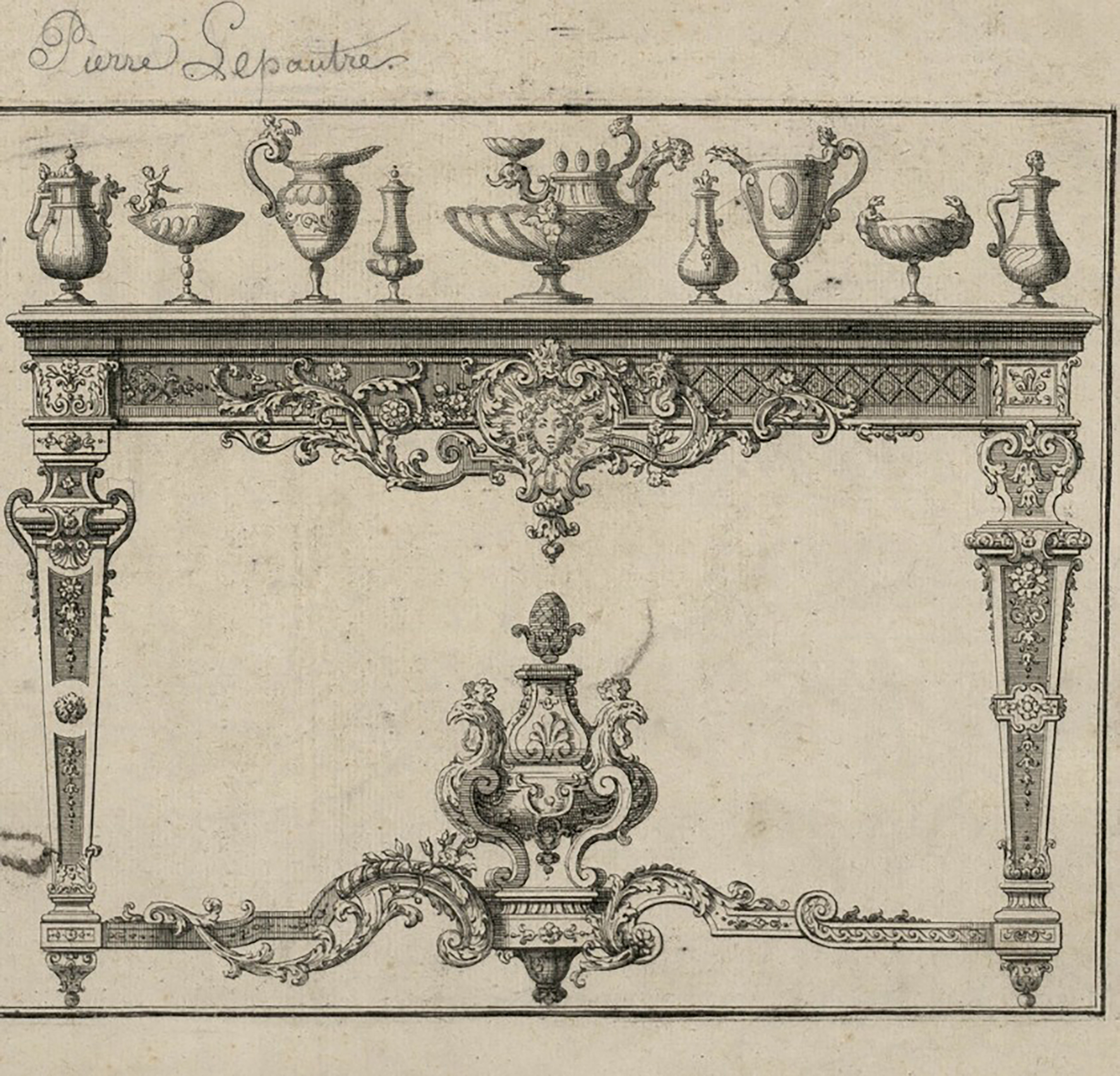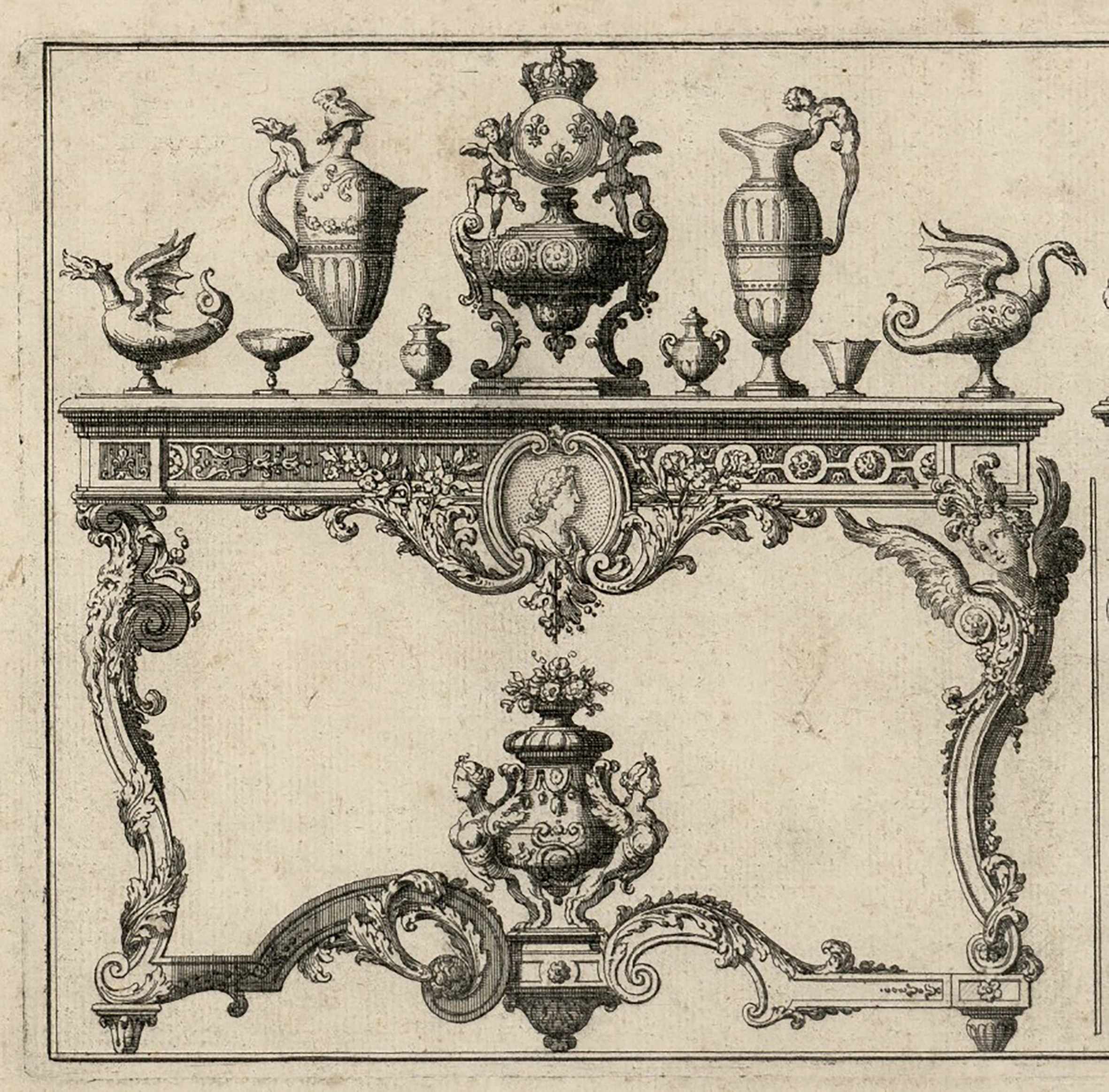 The console, from the collection of the Marquis of Harcourt-Olonde, is derived, without much modification, from a table engraved circa 1700 by Pierre Lepautre (c. 1652-1716), architect, engraver and ornamentalist, appointed in 1699 draughtsman of the Bâtiments du Roi, from his Livre de Tables qui sont dans les Apartemens du Roy sur lesquelles sont posée des Bijoux du Cabinet des Médailles. Dessiné et gravé par P. Le Pautre Graveur du Roy. Se Vend Chez Daigremont Rue Aubriboucher [Rue Aubry-le-Boucher in the 4th arrondissement in Paris] a l’image Ste. Genevève. Just like the King’s table, it is characterised by a large central medallion, ribboned and forming a projection, adorned with the profile of a male bust in the ‘antique style’, in the case at hand facing to the left and helmeted.