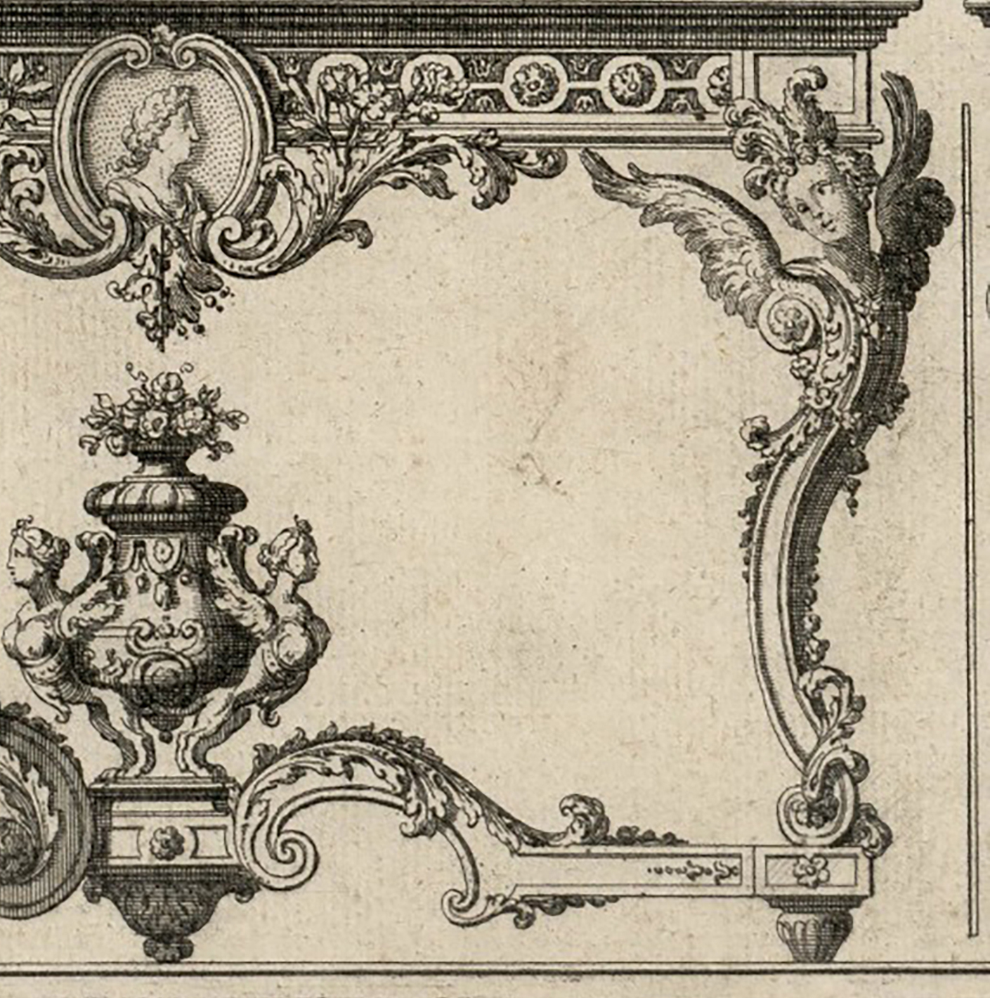 The medallion is underlined by a small foliage motif flanked by two lavish acanthus beaded scrolls, forming a “crossbow-shaped” lower section in this central part of the console, from which can be seen to emerge sinuous intertwined stems of foliage and flowers, partially covering, all around the medallion, the carved “mosaic and fleuron” décor of the rail. Although this frieze “with mosaic and fleurons” does not appear on the table by Lepautre that is of interest for us here, it does, however, feature in identical fashion, arranged in the same way on a single row around the edge of the rail, on two other tables in the Livre of the ornamentalist.