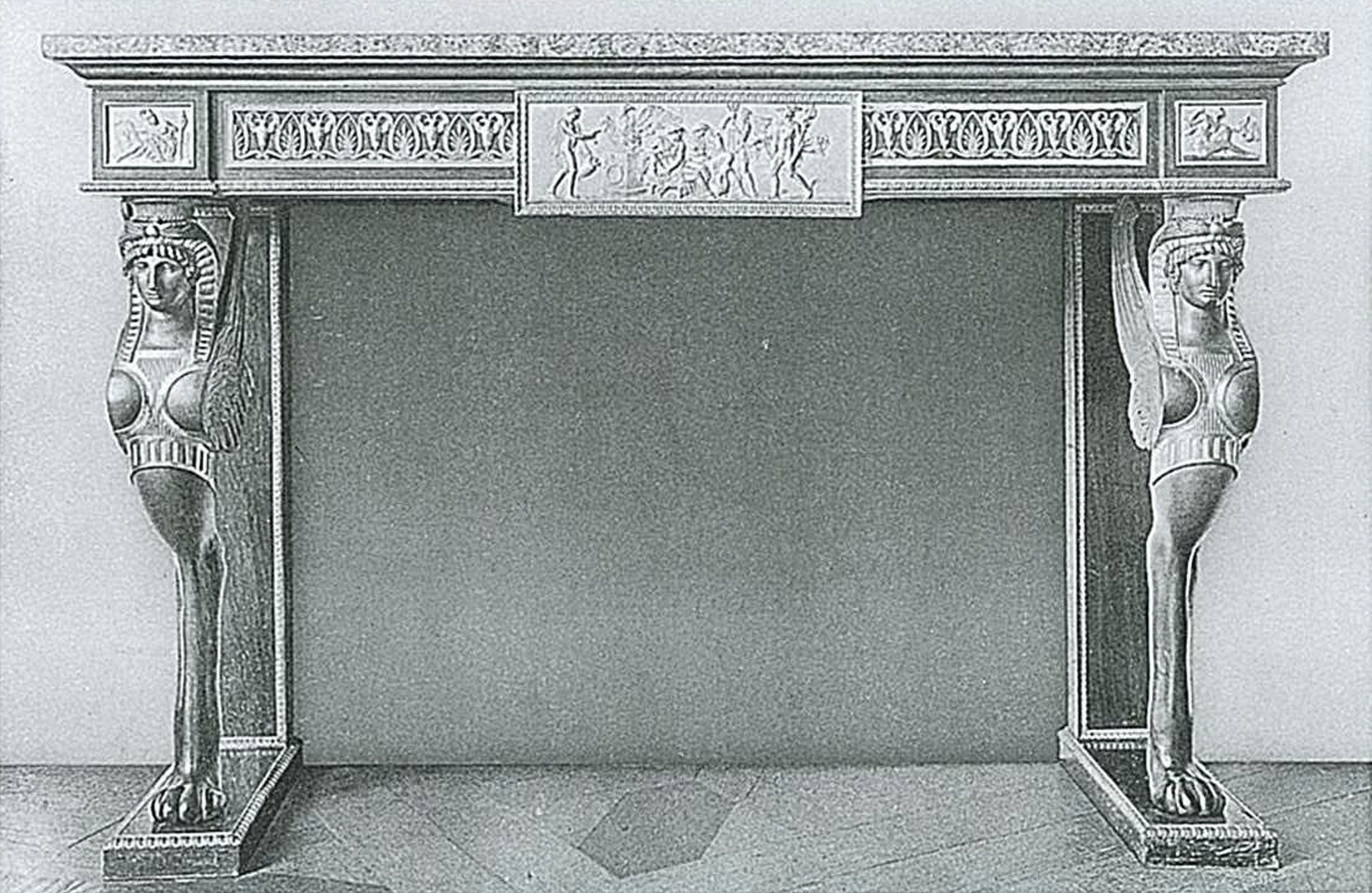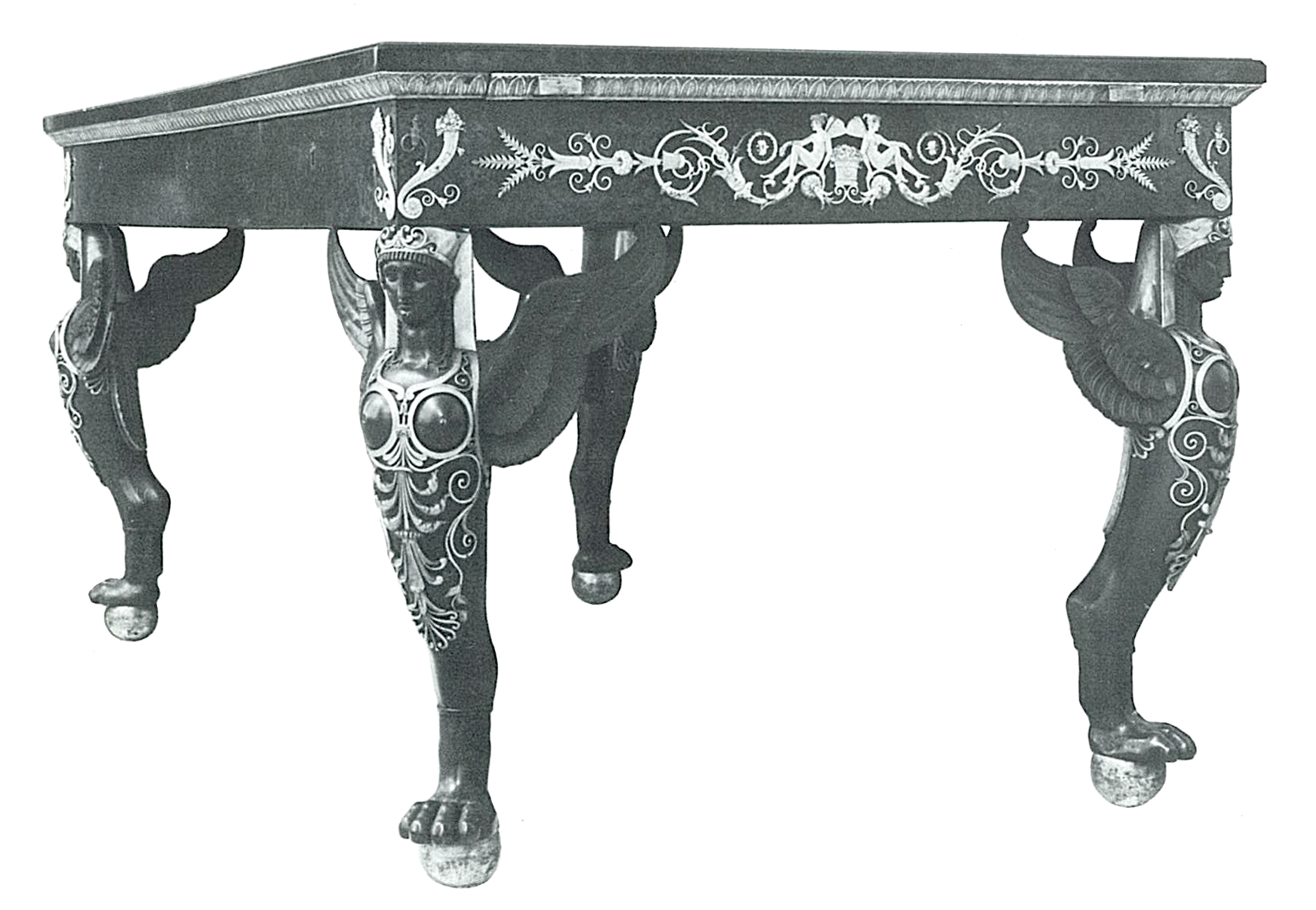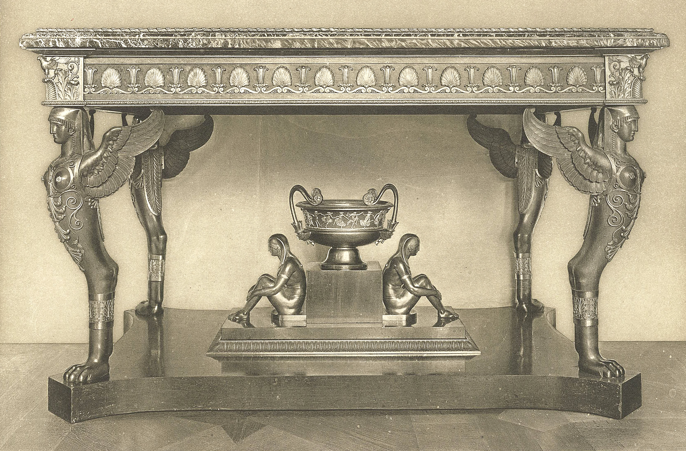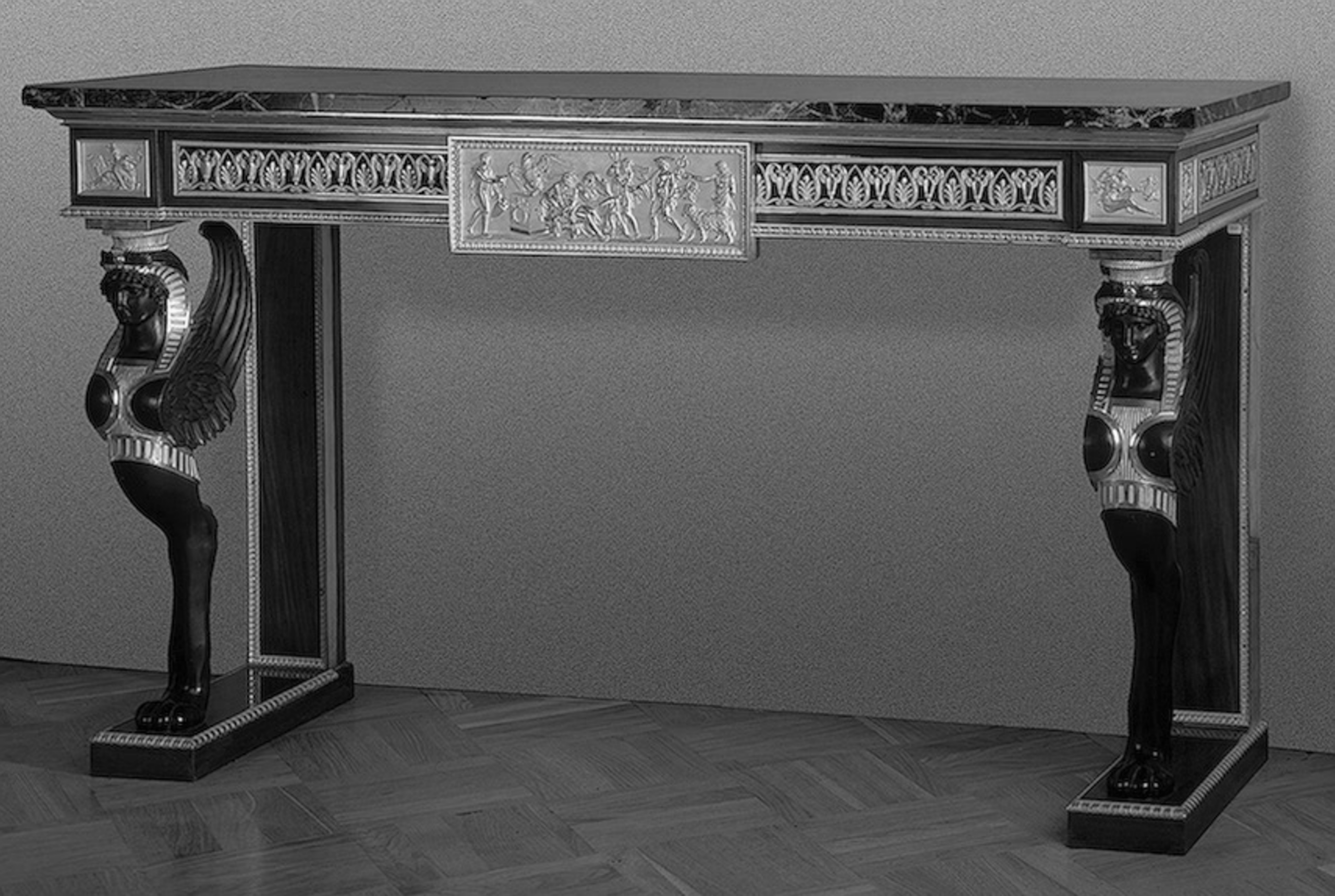 Vincenzo Brenna was particularly demanding with these dealers as to the quality of the furniture and objects supplied. Twenty-two items of ceremonial furniture were acquired during this period for Saint Michael’s Castle: nine consoles, five “rich” commodes, three desks, a work table and four occasional tables. Guillaume Culot sold a lavish console signed by Thomire with gilt bronze caryatids, and in October 1799, a pair of consoles – which are of particular interest here – “in mahogany wood from selected roots” ornamented with bas-reliefs in gilt bronze “representing the Gods of Fable” – probably executed after an engraving of a Roman bas-relief published by Bernard de Montfaucon in his famous Antiquité expliquée […] – standing on two back feet with monopod chimeras in patinated gilt bronze identical to the ones in this table. A third console, in the same model, had already been delivered a few months before, in February 1799, by the dealer Defarge. All this furniture, now in the Hermitage Museum in Saint Petersburg, features the same rigorous quality of execution attributed to Thomire in the bronzes.
