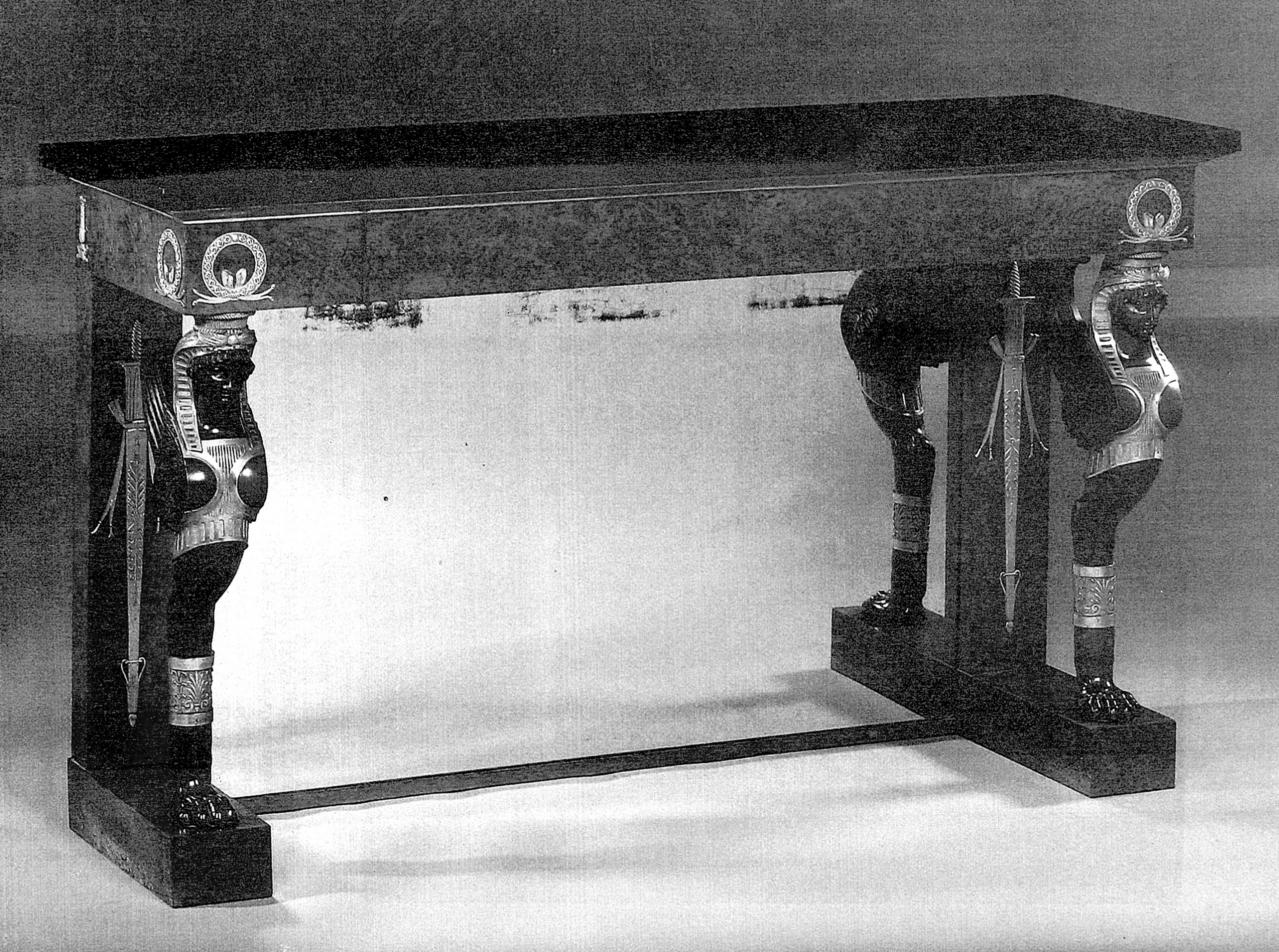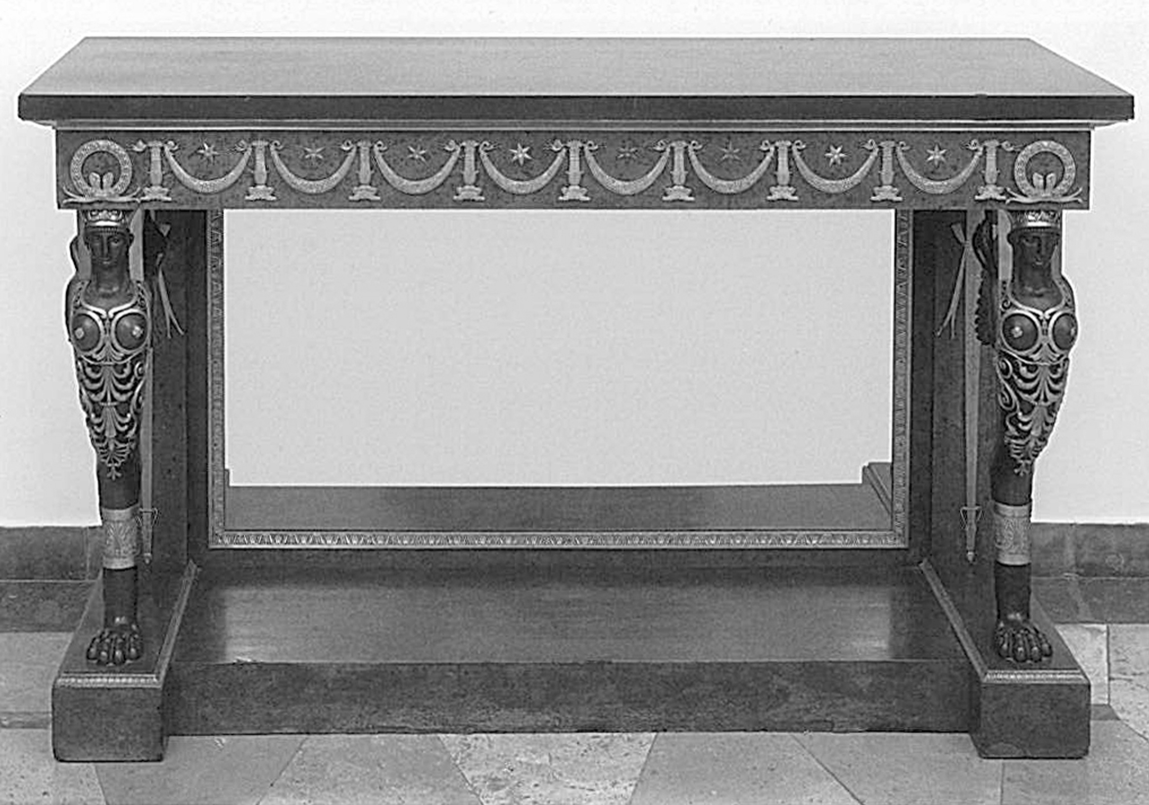 A console now in the Decorative Arts Museum in Budapest, also with chimeras in this model, and once part of the Esterhazy collection, still carries Lignereux’s label. It features a frieze in gilt bronze alternating “baluster” torches and garlands, identical to the one ornamenting the apron of a console deposited in 1807 by Thomire as a pledge for a loan, finally transferred to the Garde-Meuble Impérial in 1812.