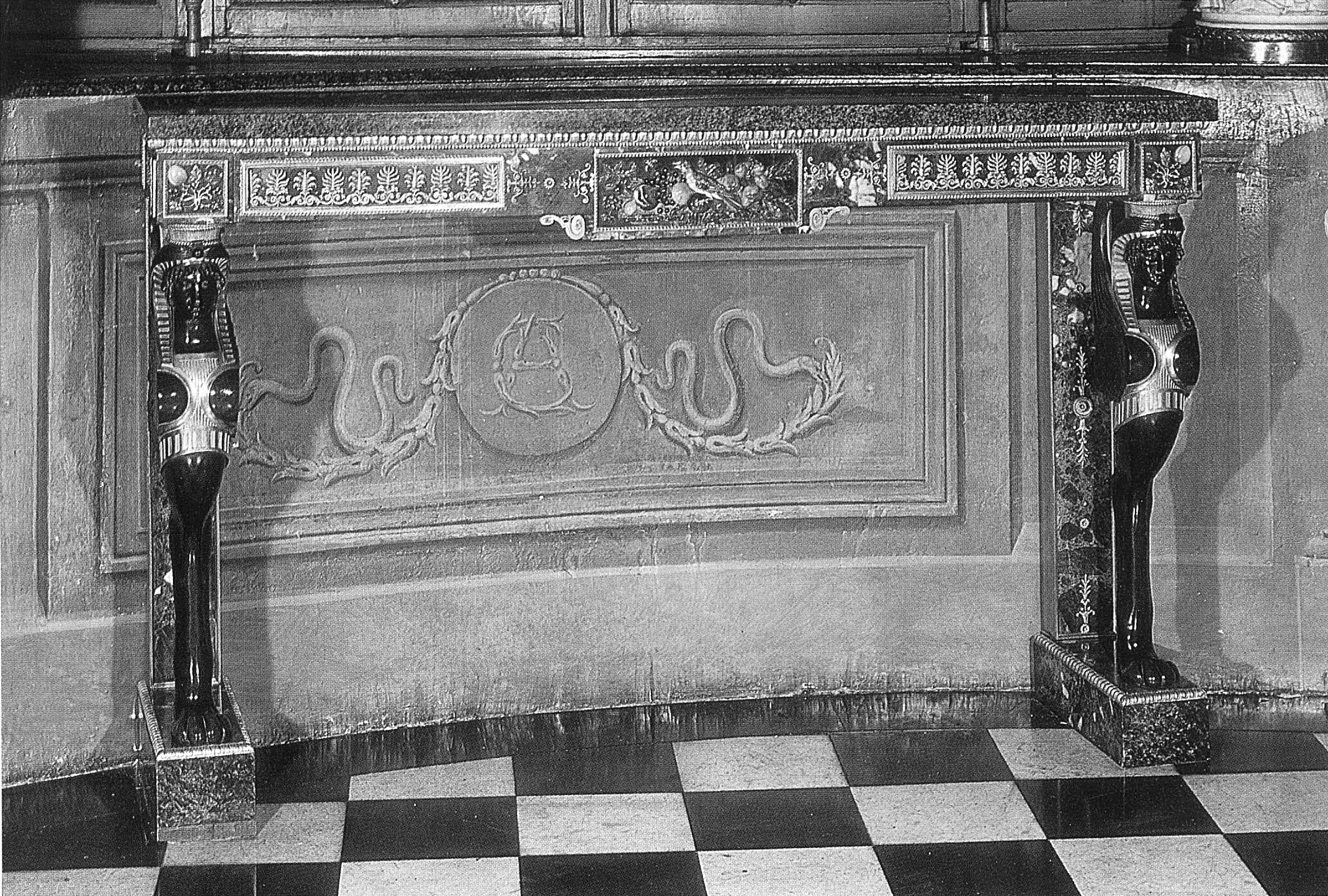 On 2 April 1798 the following was listed: “a large console with a top in green granite, with base, pilasters and apron in Egyptian green marble, ornamented on the crosspiece with a frieze of palmettes in gilt bronze and with bas-reliefs in pietra dura, in the centre and at the ends”, decorated with the same “chimeras”. This was placed in the large so-called “Seasons” drawing room in the private mansion of the financier Marc-Antoine Delannoÿ, in Rue Cerutti. In 1804, he sold his residence, entirely furnished, to Louis Bonaparte, the brother of Napoleon I and later King of Holland, and his wife, Hortense, daughter of the Empress Josephine. Later, this magnificent formed part of the collections of Baron de Redé at the Hôtel Lambert in Paris, and was sold by Sotheby’s in Monaco on 26 May 1975, as lot No. 266 of the sale.