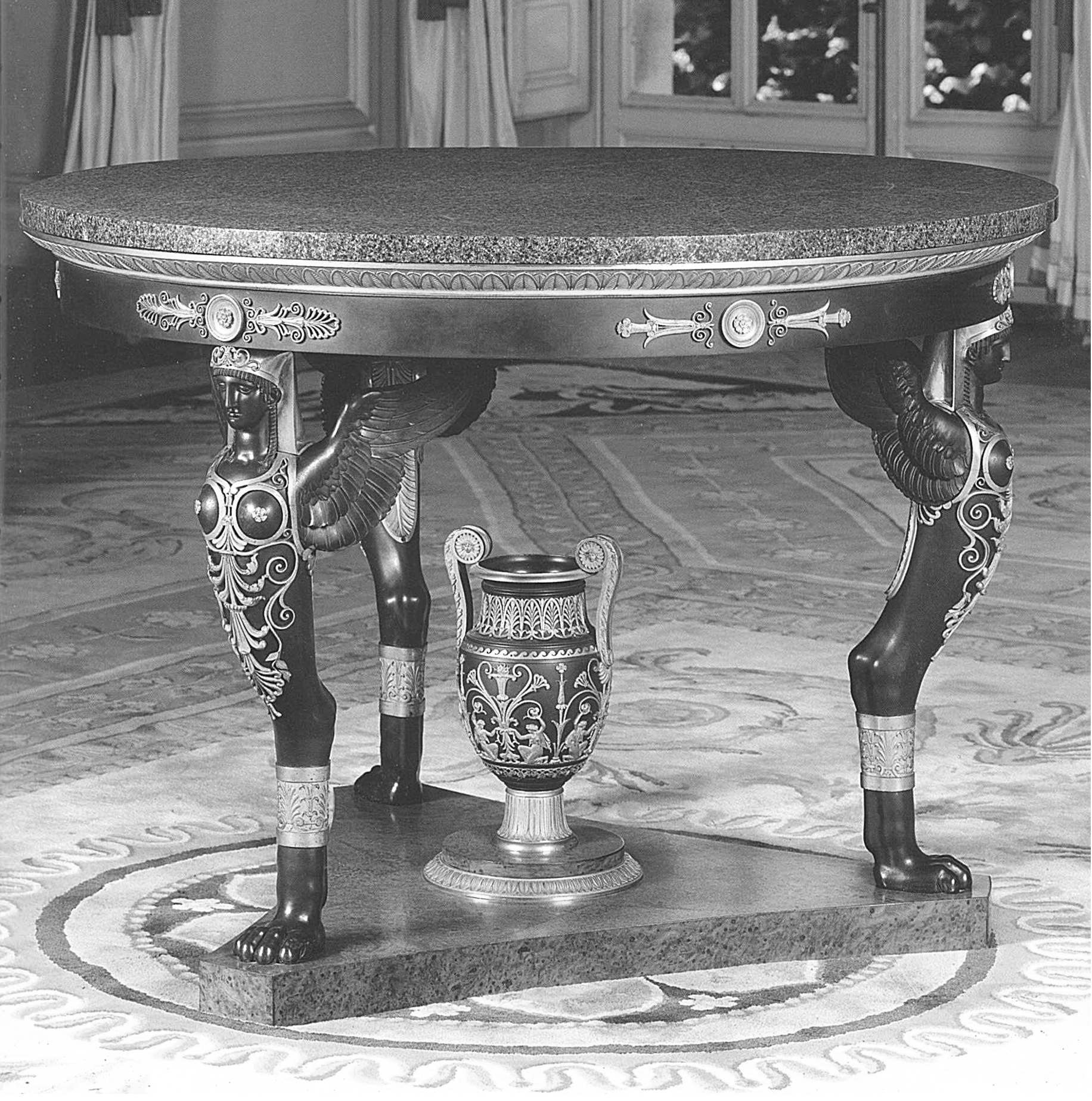 A masterpiece in the collection of Baron and Baronne Eugène Fould-Springer, then of Nathaniel de Rothschild, at the abbey palace of Royaumont in the Val-d’Oise, this centre table constitutes one of the most remarkable landmarks in the history of French furniture produced during the Directory: a particularly fertile period when the “Etruscan” and antique styles, together with the pronounced taste for Egyptomania, all forerunners of the Consulate style, went from strength to strength under the impetus of great designers. These included the architects Percier and Fontaine and illustrious companies specialising in luxury trade, the most famous uncontestably being those of the Jacob Frères and Martin-Eloi Lignereux, the latter working in partnership with the famous founder-finisher Pierre-Philippe Thomire.