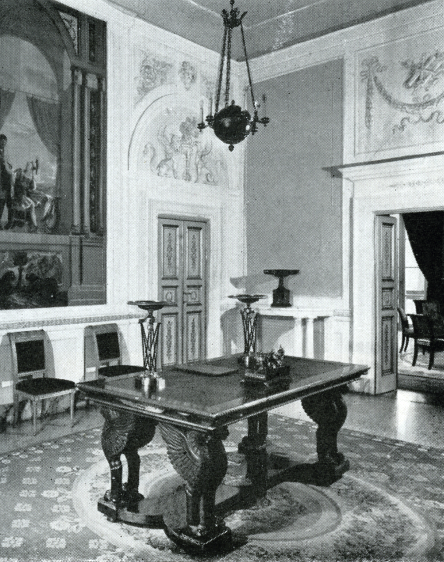 Reputed to be Napoleon’s “actual map table”, which went with him on all his campaigns, this remarkable item of furniture was part of the collection of the Count and Countess Pecci-Blunt, who placed it in the middle of the antechamber on the first floor of the “Villa Reale” in Marlia, Tuscany, the former residence of Elisa Baciocchi, Napoleon I’s sister, Princess of Lucca and Piombino and Grand Duchess of Tuscany under the Empire, a mansion they had acquired in 1923. Keen collectors and patrons, Count and Countess Pecci-Blunt took steps to restore the Villa to its former glory, buying large numbers of paintings, furniture and objets d’art in addition to the partially preserved decoration introduced by Elisa under the Empire, including mural frescoes, wallpapers, sculptures, mantelpieces and consoles executed in Carrara marble. Countess Anna Laetitia Pecci-Blunt (Rome, 1885 – Marlia, 1971), known as Mimi, was the great-niece of Pope Leo XIII, of the Pecci family (1803-1903). She married Cecil Blumenthal, known as Blunt, an extremely rich Jewish-American who had received the papal title of Count Pecci-Blunt.