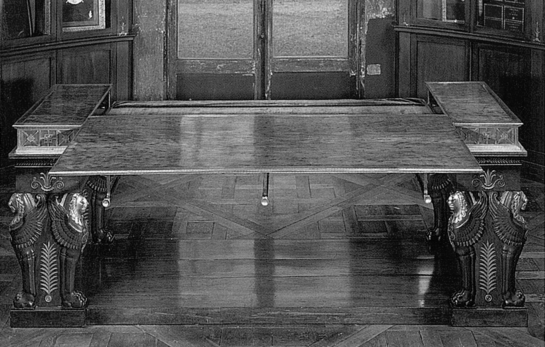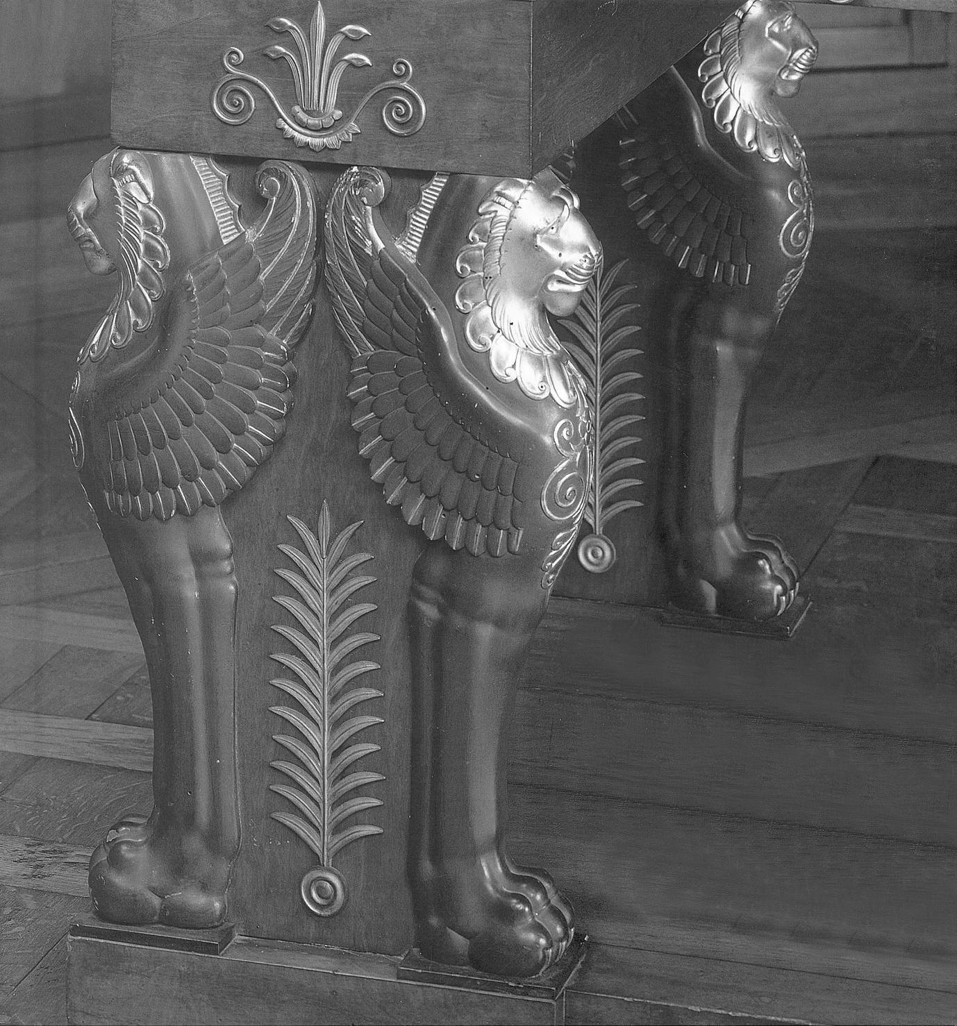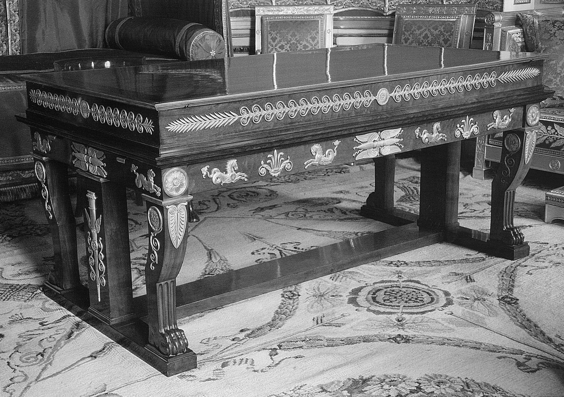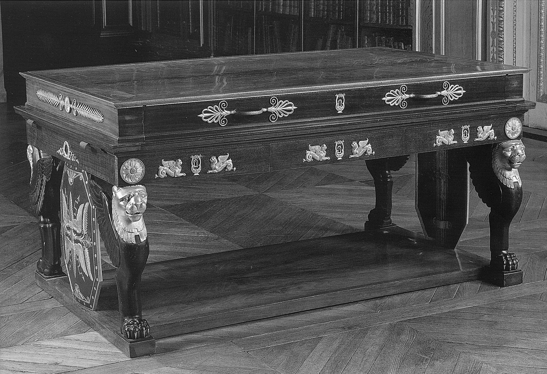 The eight legs of the table stand on an imposing X-shaped mahogany stretcher with rectangular projecting sections surrounded in gilt bronze, supporting each pair of monopod winged lions, and a broad central openwork rosette, also in bronze. The whole item stands on eight small spherical feet. This piece of furniture is directly related to the series of large bureaux plats with comparable supports in the form of lions or winged tigers supporting a storage cabinet with mechanical fittings developed by Jacob Frères at the beginning of the Consulate. One of the most famous examples is the desk of the First Consul at the Tuileries, now preserved at the Château de Malmaison.
