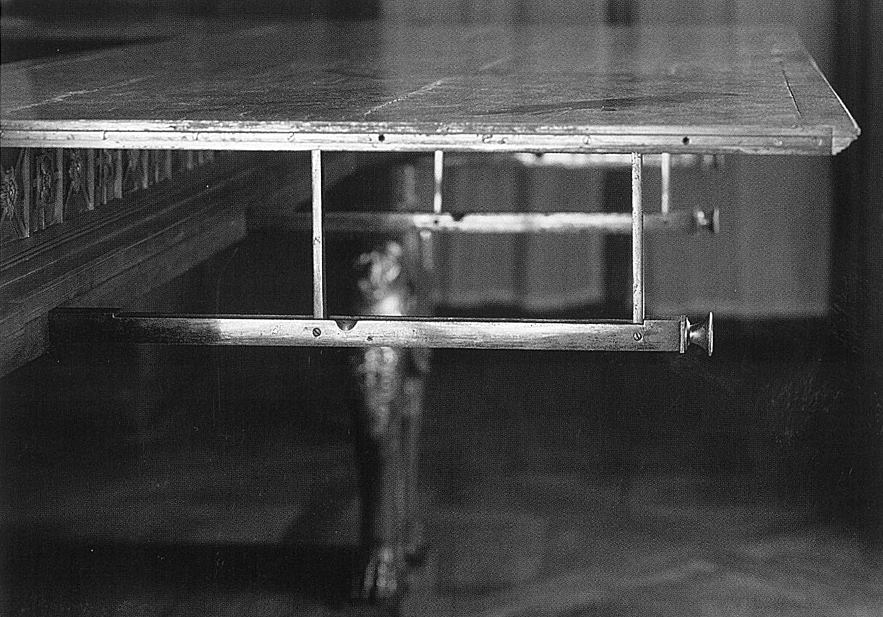 Two curved handles flanking either side of the front corners enable the top to be opened. This is mounted with hinges and can be adjusted by means of two flat steel rods in the form of a mobile “U” fixed to the first third of the blue velvet-covered, gold-edged underside. These rods are supported by two gilt bronze racks with pinions along the shorter sides of a very large coffer concealed in the thickness of the table apron, which then becomes a huge desk suitable for reading ordenance survey maps.