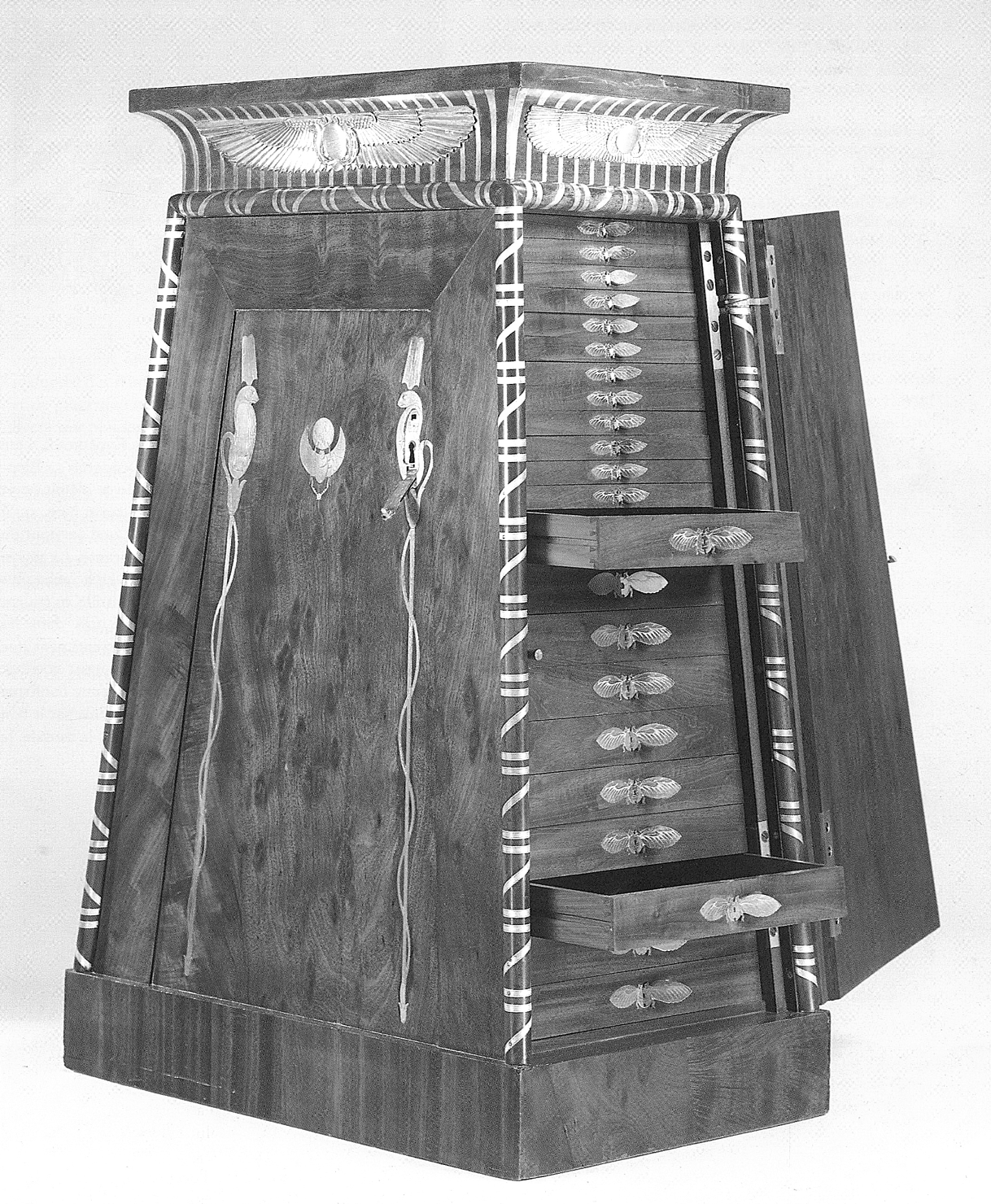 This same motif was executed in silver by Martin-Guillaume Biennais on a remarkable medallion cabinet produced in 1809 by Jacob-Desmalter Desmalter, after a drawing by the architect Charles Percier, for Baron Dominique-Vivant Denon (1747-1825), director of the Musée Napoléon and the celebrated author of Voyage dans la Basse et la Haute Egypte, published in two volumes in 1802. This cabinet is now in the collections of the Metropolitan Museum of Art, in New York.