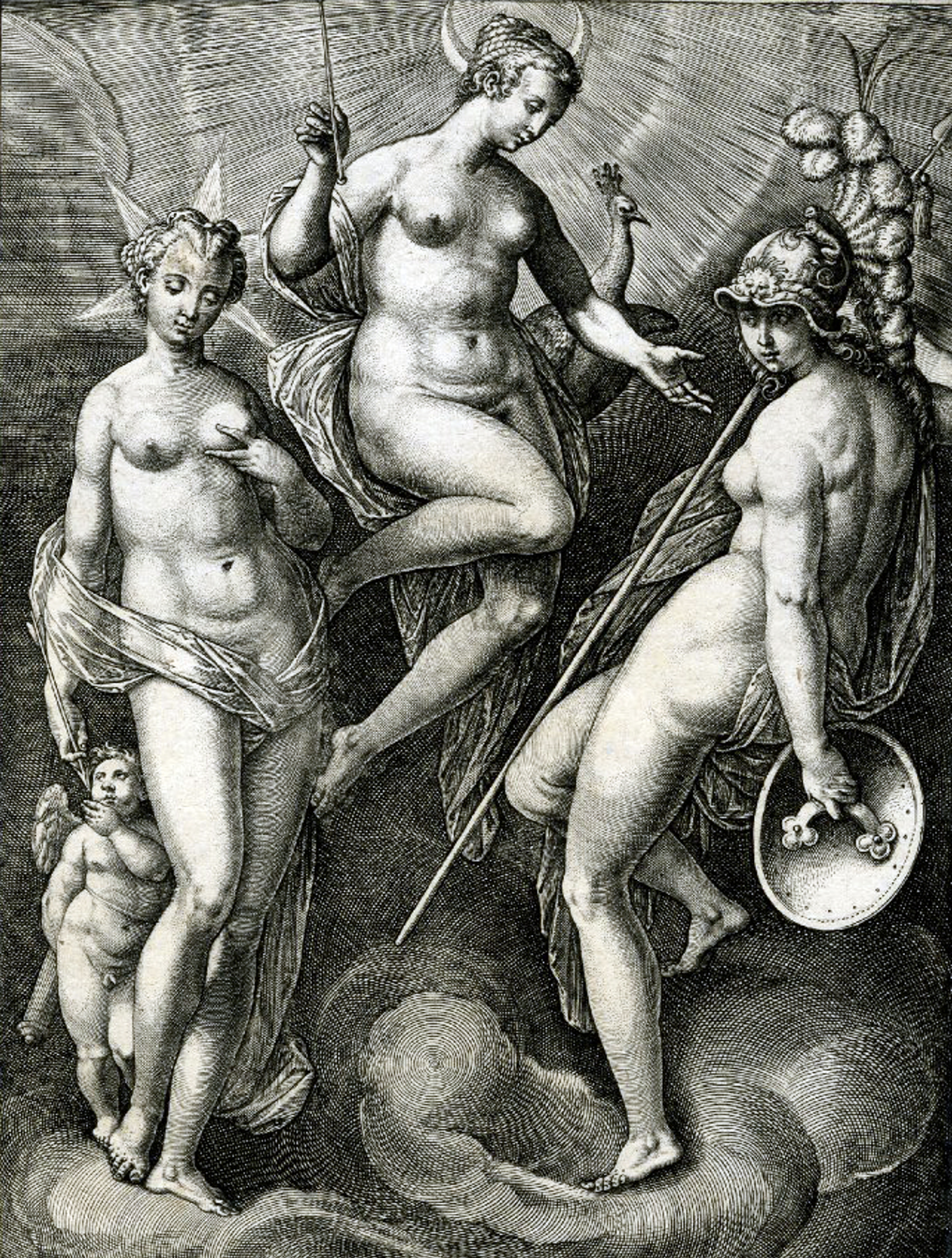 Jan van der Straet (1523–1605), known as Stradanus, Venus, Juno and Minerva, engraved by Adriaen Collaert, 1587.