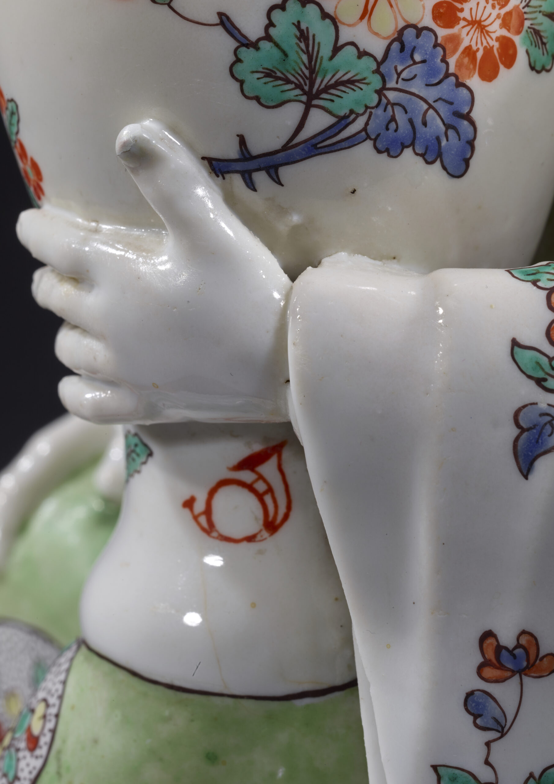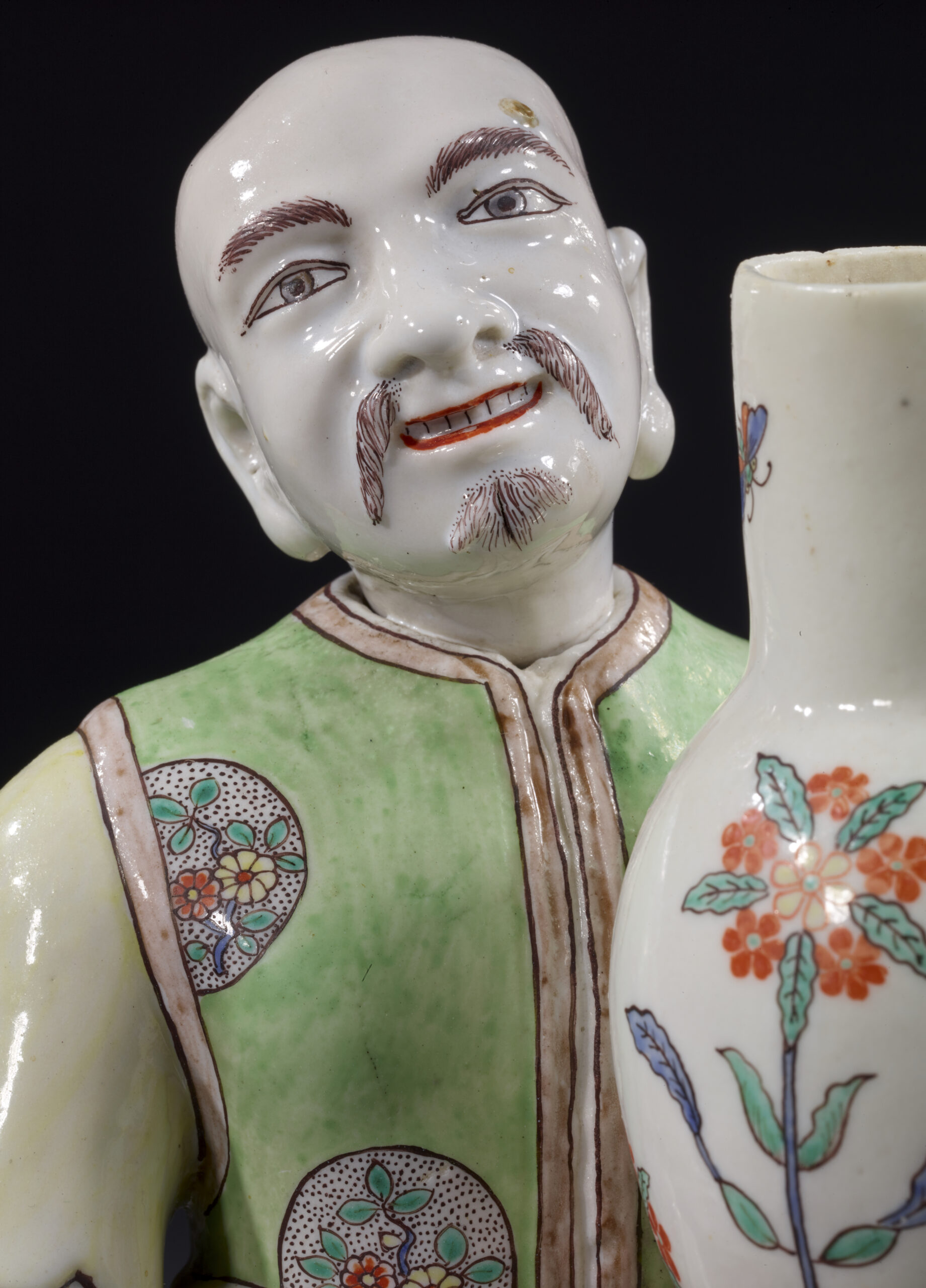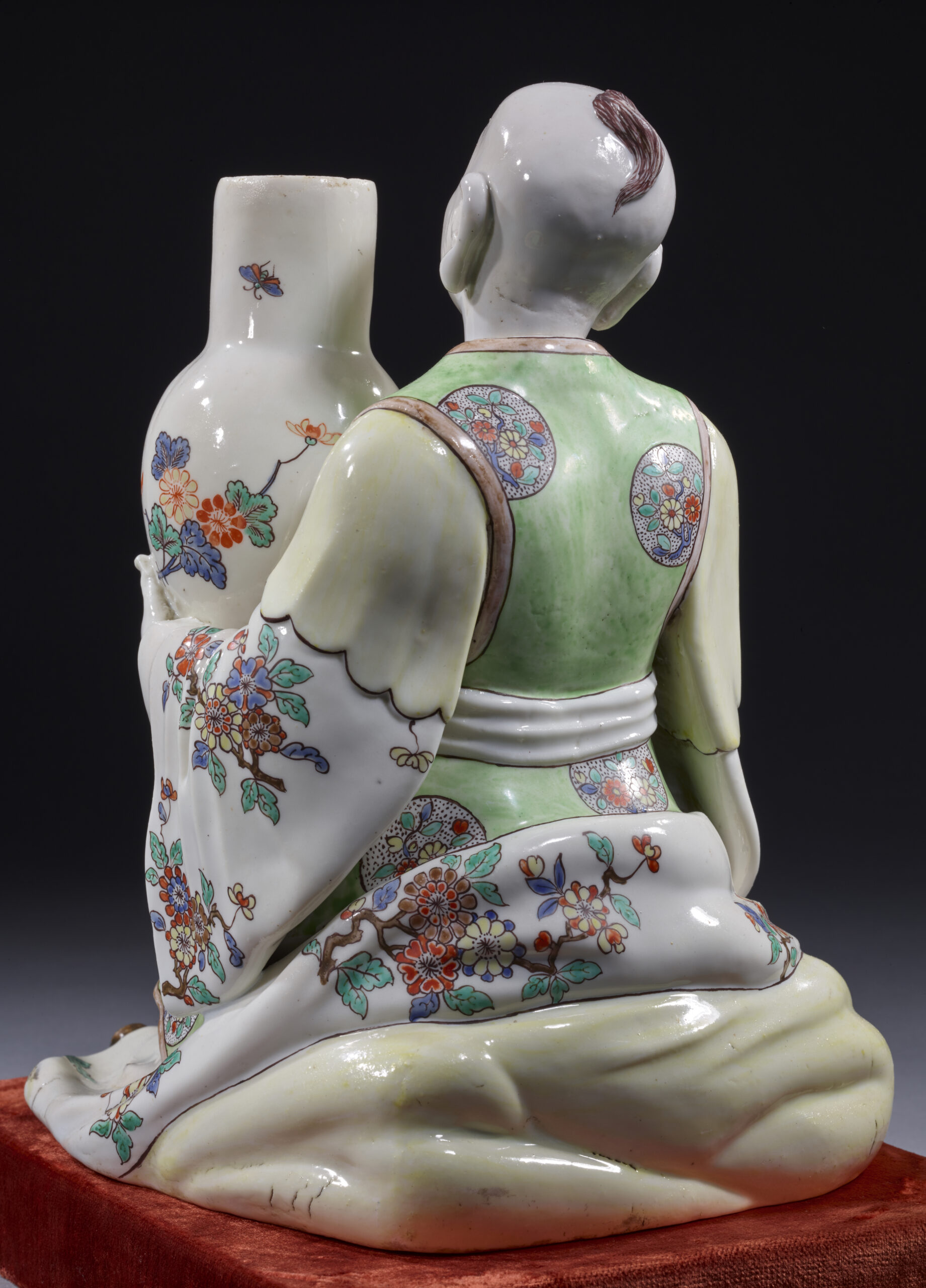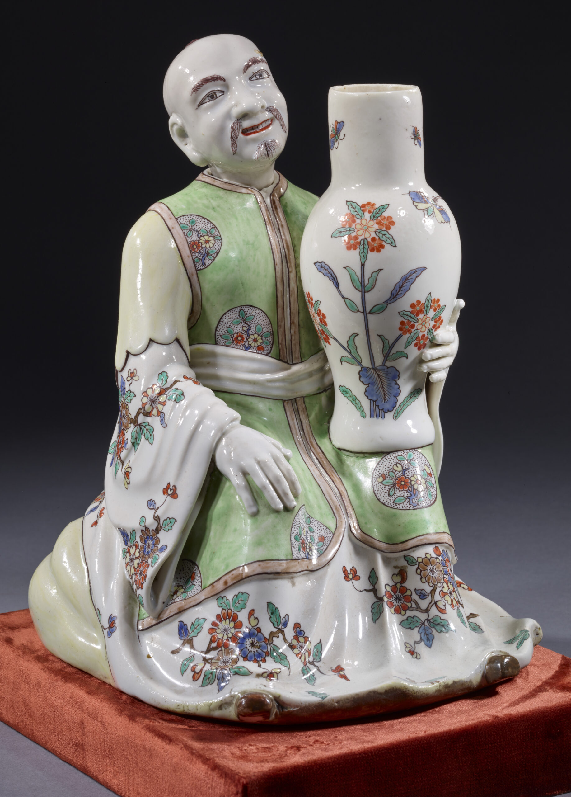 This rare soft-paste porcelain figure from the Chantilly manufactory, tin-glazed with a polychrome floral Kakiemon-style decoration, depicts a richly dressed Chinese figure seated on a cushion, holding a large baluster-shaped vase in his left hand. It is unique; no other example of this model has been recorded to date.