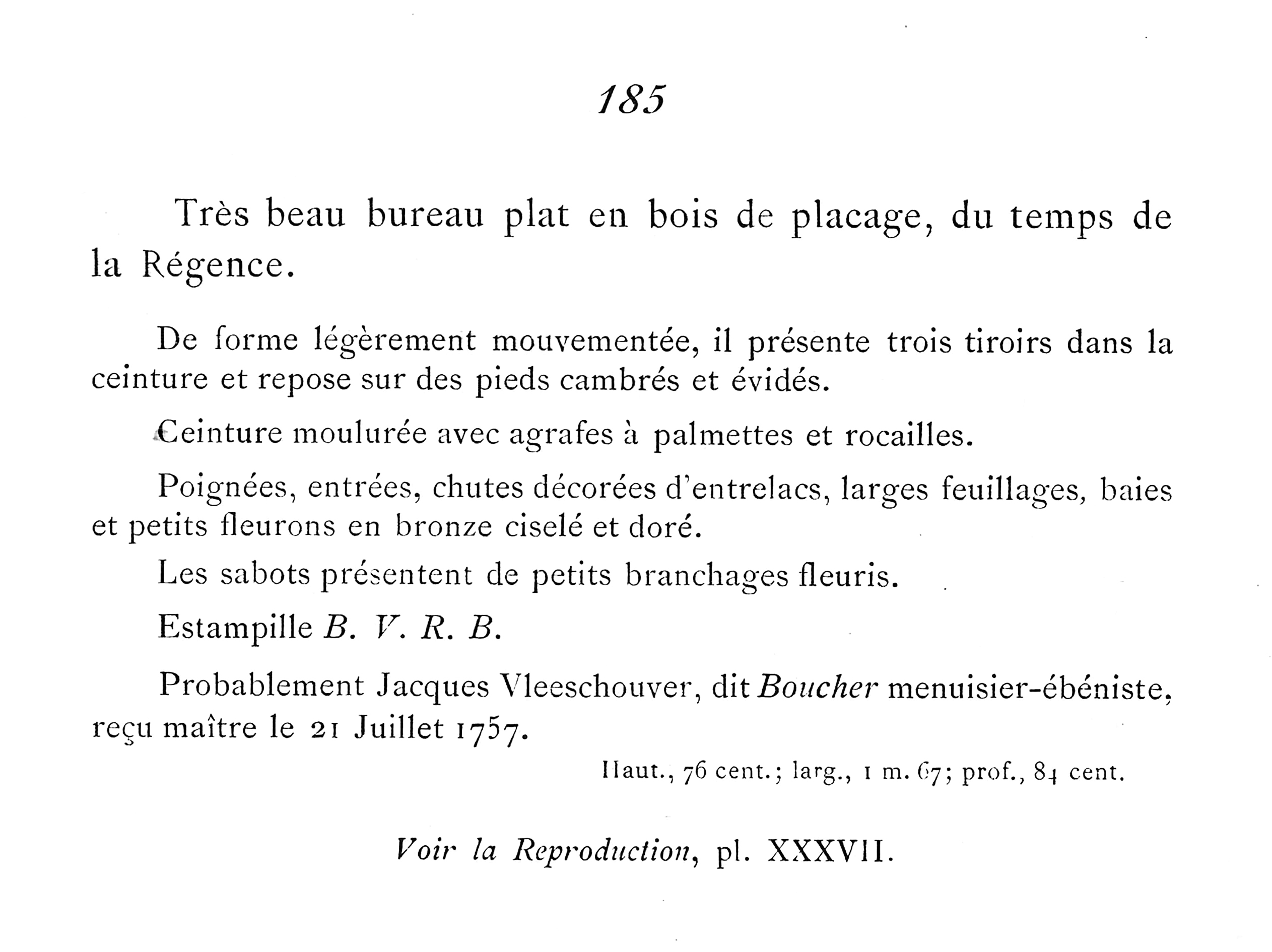 BIBLIOGRAPHIE : Jean Nicolay, L’Art et la Manière des Maîtres Ebénistes français au XVIIIe Siècle, vol. I, Paris, 1956, p. 65, fig. C ; Jean-Pierre Baroli, « Le mystérieux B.V.R.B enfin identifié », Connaissance des Arts, n° 61, mars 1957, p. 58, repr. ; Penelope Hunter-Stiebel, Elements of Style : The Art of the Bronze Mount in 18th and 19th Century France, catalogue de l’exposition présentée à New York, par la galerie Rosenberg & Stiebel, du 13 avril au 15 juin 1984, p. 12-14, cat. 1; Christiane de Nicolay-Mazery, Visites privées, hôtels particuliers de Paris, Paris, 1999, p. 13.