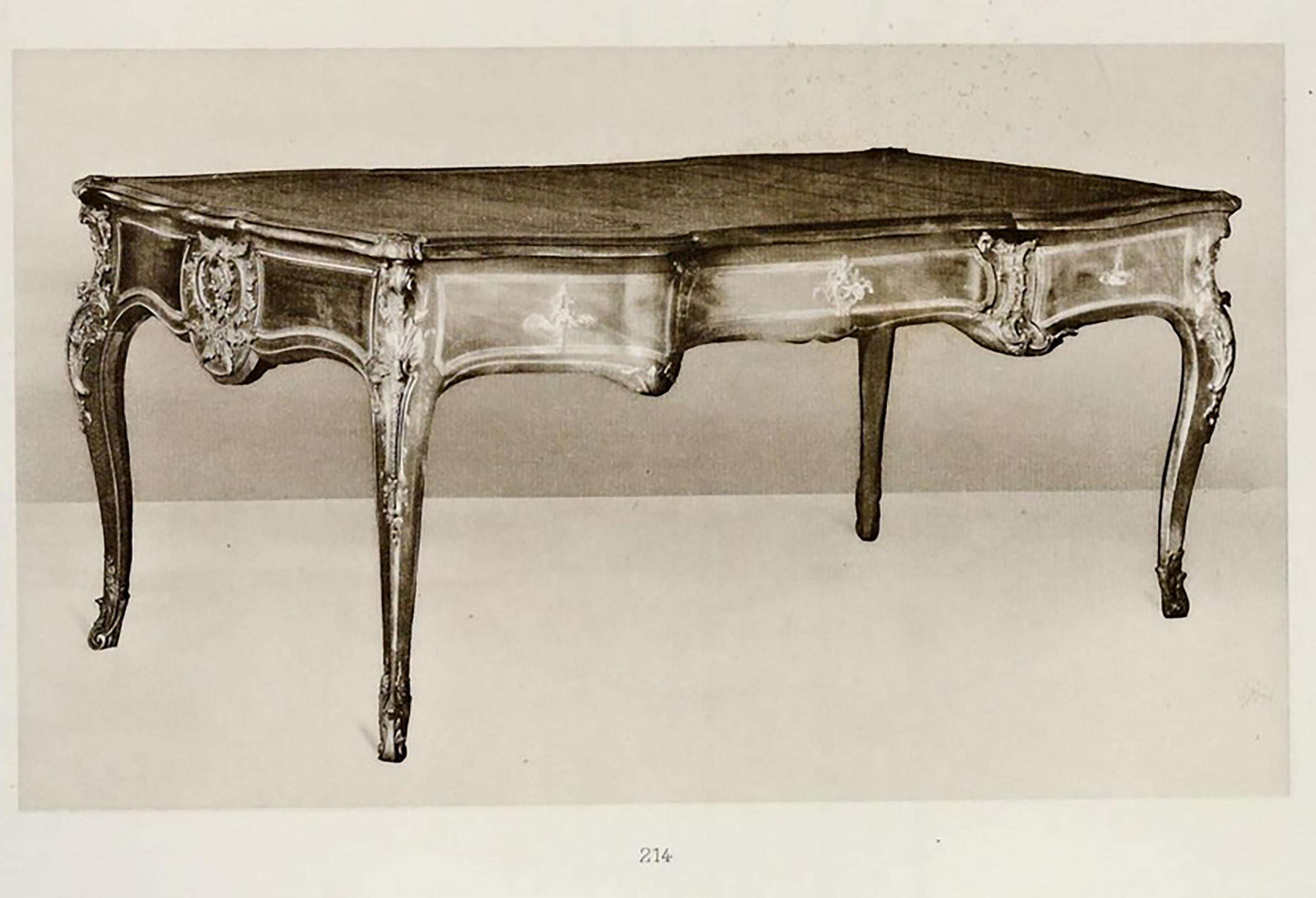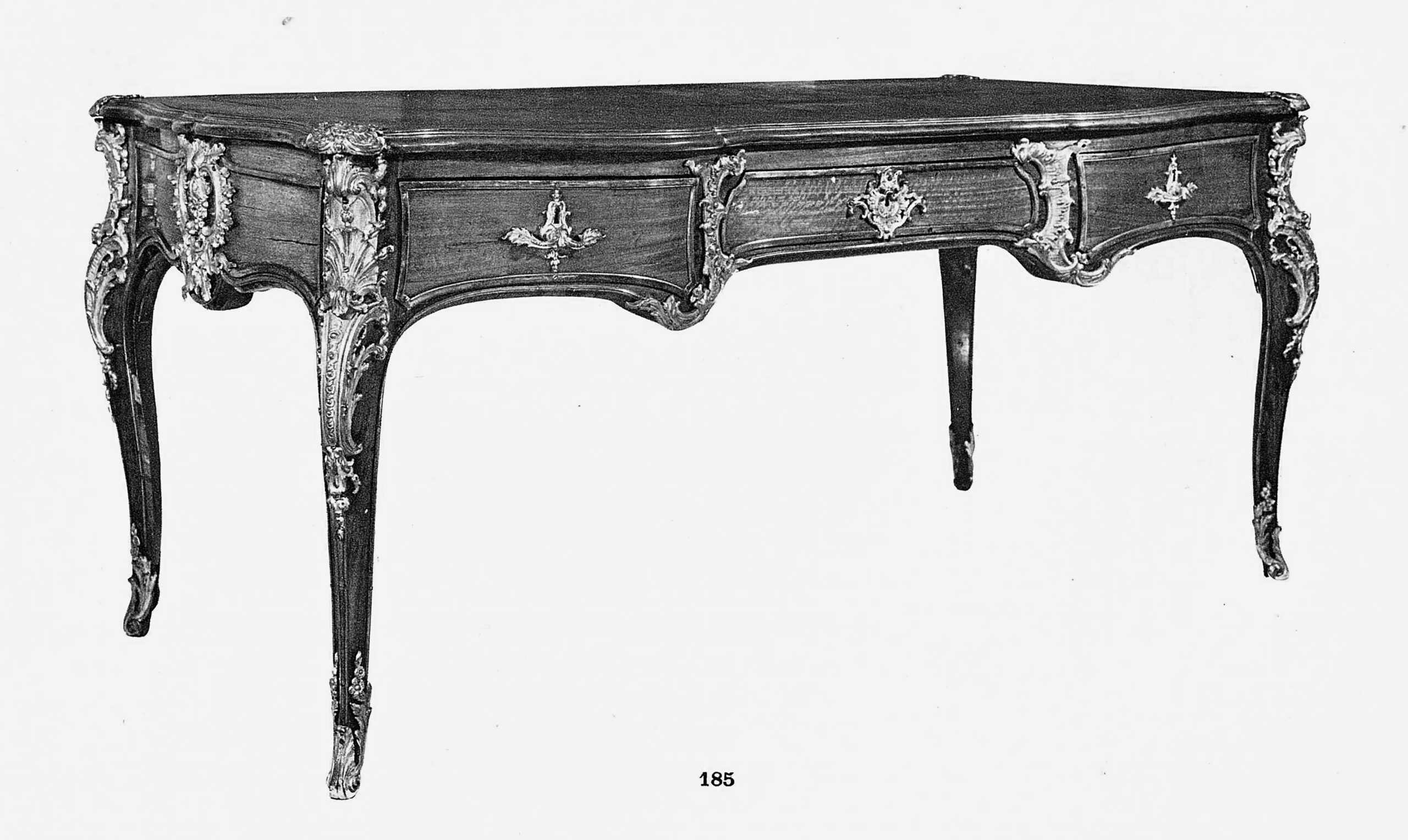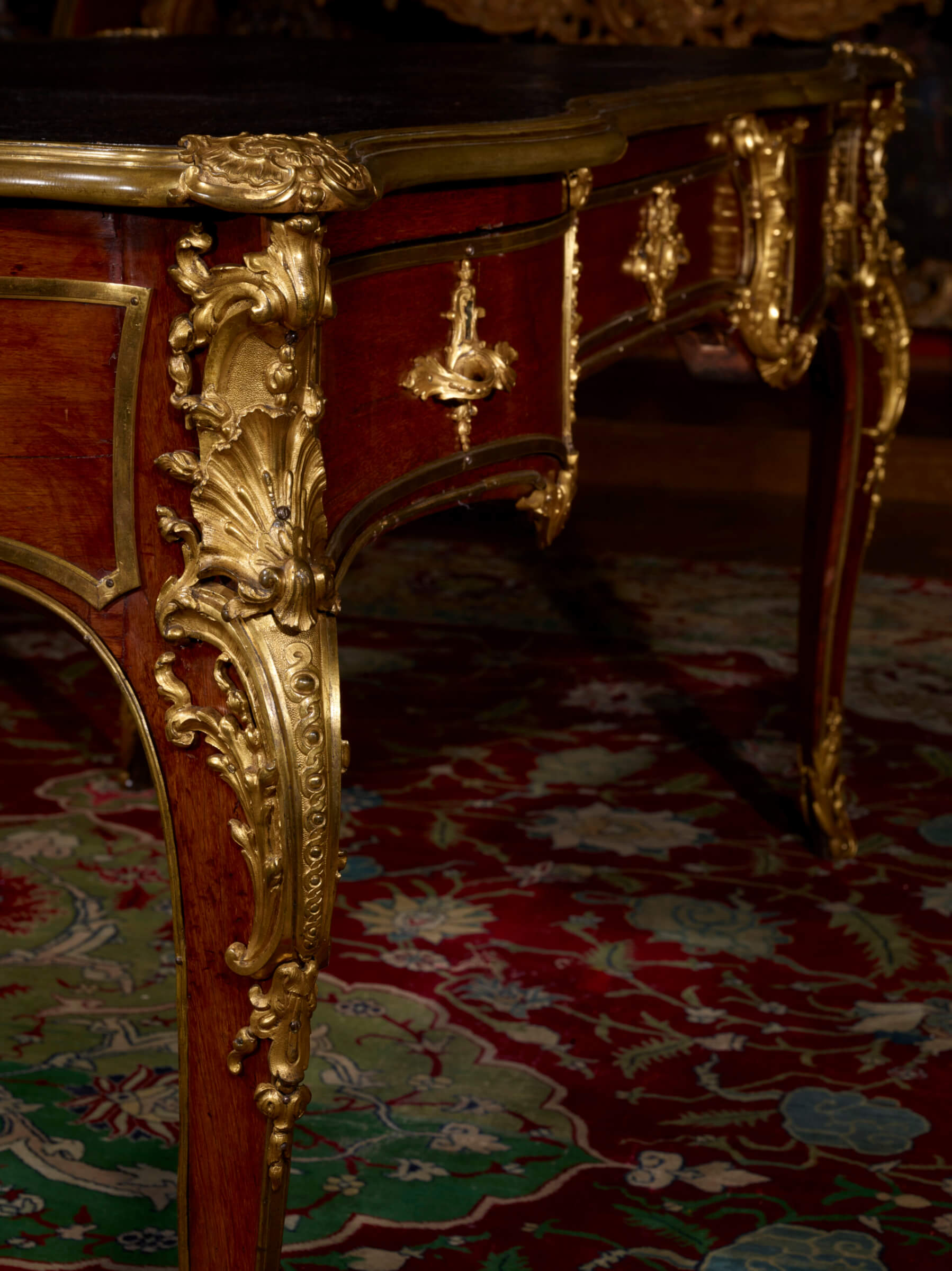 Chef-d’œuvre de Bernard II Vanrisamburgh, ce grand bureau plat, daté vers 1737, au bâti en chêne de Hongrie intégralement plaqué en amarante et très richement orné de bronzes dorés, a fait partie de la collection d’André Saint (1871-1933), qui dirigea au début du XXe siècle, avec son frère Maurice (1863-1936), la célèbre société familiale Saint Frères, spécialisée dans le tissage de la toile de jute. Le bureau meubla son hôtel dit de Breteuil, 12 avenue Foch, à Paris. Il fut vendu le 21 mai 1935 par sa veuve, Madeleine Saint (1879-1955), née Bariquand, à l’occasion d’une importante vente aux enchères de la collection Saint qui se tint à la galerie Jean Charpentier à Paris, sous le ministère de Me Etienne Ader. Adjugé 107.500 francs, il fut acquis par le marchand d’art allemand Hans Stiebel († en 1964), qui s’était installé à Paris, au 43 avenue Montaigne, au lendemain de la Première Guerre mondiale. C’est très certainement lui qui le vendit à la baronne Renée Eléonore Juliette de Becker Remy (1903-1987), fille de baron Léon Lambert (1851-1919) et de Zoé Lucie de Rothschild (1863-1916), petite-fille du baron Gustave de Rothschild (1829-1911), et l’une des plus grandes collectionneuses d’art du milieu du XXe siècle. Le bureau orna le splendide appartement new yorkais situé au n° 820 de la 5e avenue à Manhattan, que lui rachèteront à la fin des années 50 Charles et Jayne Wrightsman.