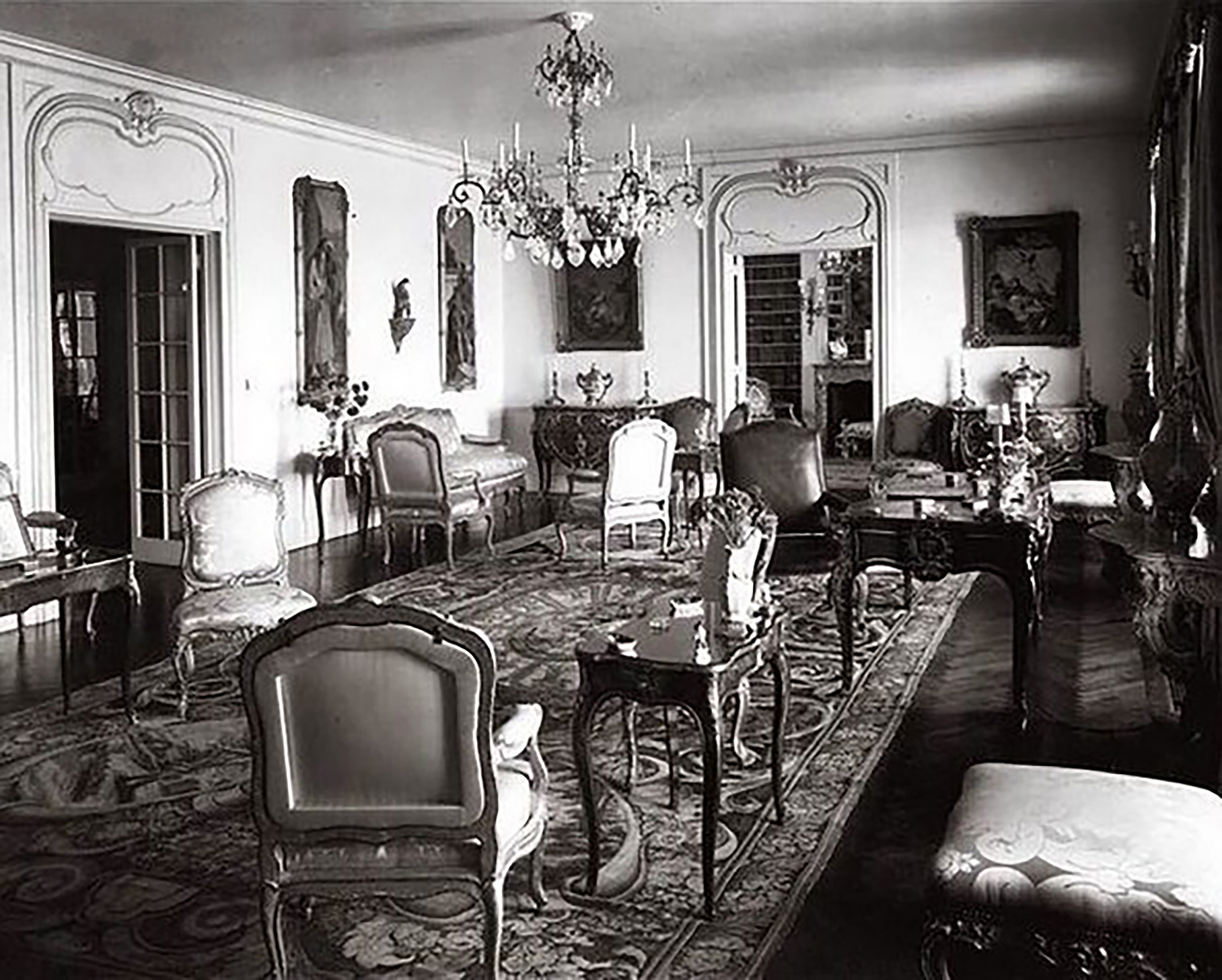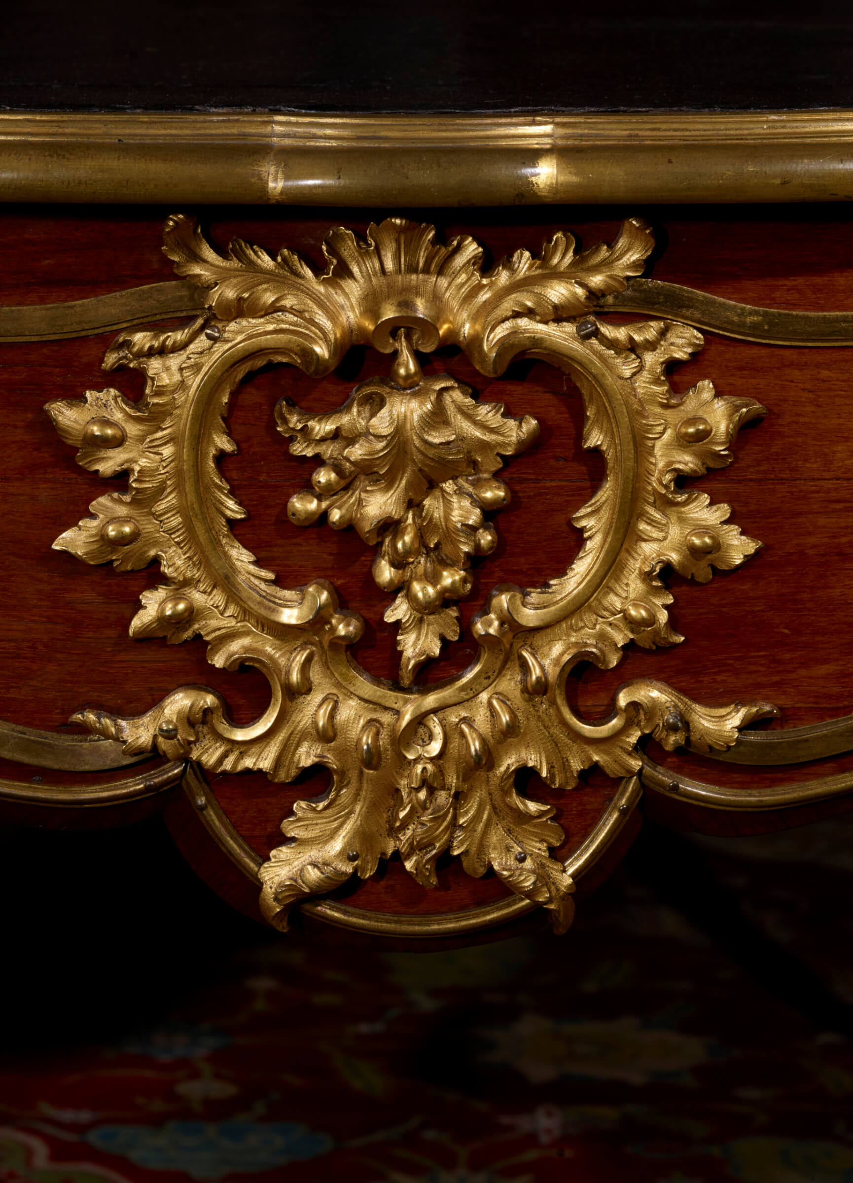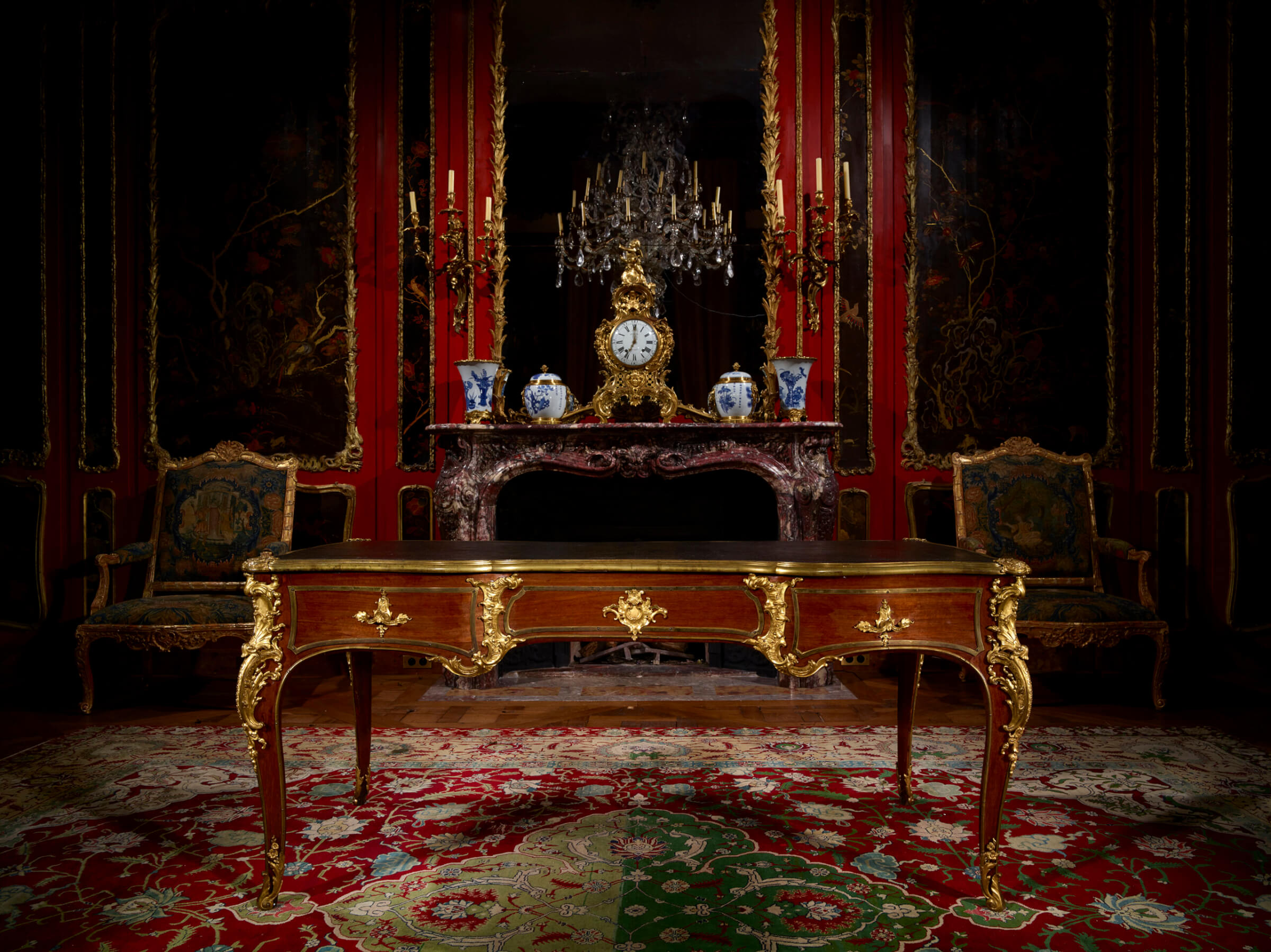 Chef-d’œuvre de Bernard II Vanrisamburgh, ce grand bureau plat, daté vers 1737, au bâti en chêne de Hongrie intégralement plaqué en amarante et très richement orné de bronzes dorés, a fait partie de la collection d’André Saint (1871-1933), qui dirigea au début du XXe siècle, avec son frère Maurice (1863-1936), la célèbre société familiale Saint Frères, spécialisée dans le tissage de la toile de jute. Le bureau meubla son hôtel dit de Breteuil, 12 avenue Foch, à Paris. Il fut vendu le 21 mai 1935 par sa veuve, Madeleine Saint (1879-1955), née Bariquand, à l’occasion d’une importante vente aux enchères de la collection Saint qui se tint à la galerie Jean Charpentier à Paris, sous le ministère de Me Etienne Ader. Adjugé 107.500 francs, il fut acquis par le marchand d’art allemand Hans Stiebel († en 1964), qui s’était installé à Paris, au 43 avenue Montaigne, au lendemain de la Première Guerre mondiale. C’est très certainement lui qui le vendit à la baronne Renée Eléonore Juliette de Becker Remy (1903-1987), fille de baron Léon Lambert (1851-1919) et de Zoé Lucie de Rothschild (1863-1916), petite-fille du baron Gustave de Rothschild (1829-1911), et l’une des plus grandes collectionneuses d’art du milieu du XXe siècle. Le bureau orna le splendide appartement new yorkais situé au n° 820 de la 5e avenue à Manhattan, que lui rachèteront à la fin des années 50 Charles et Jayne Wrightsman.