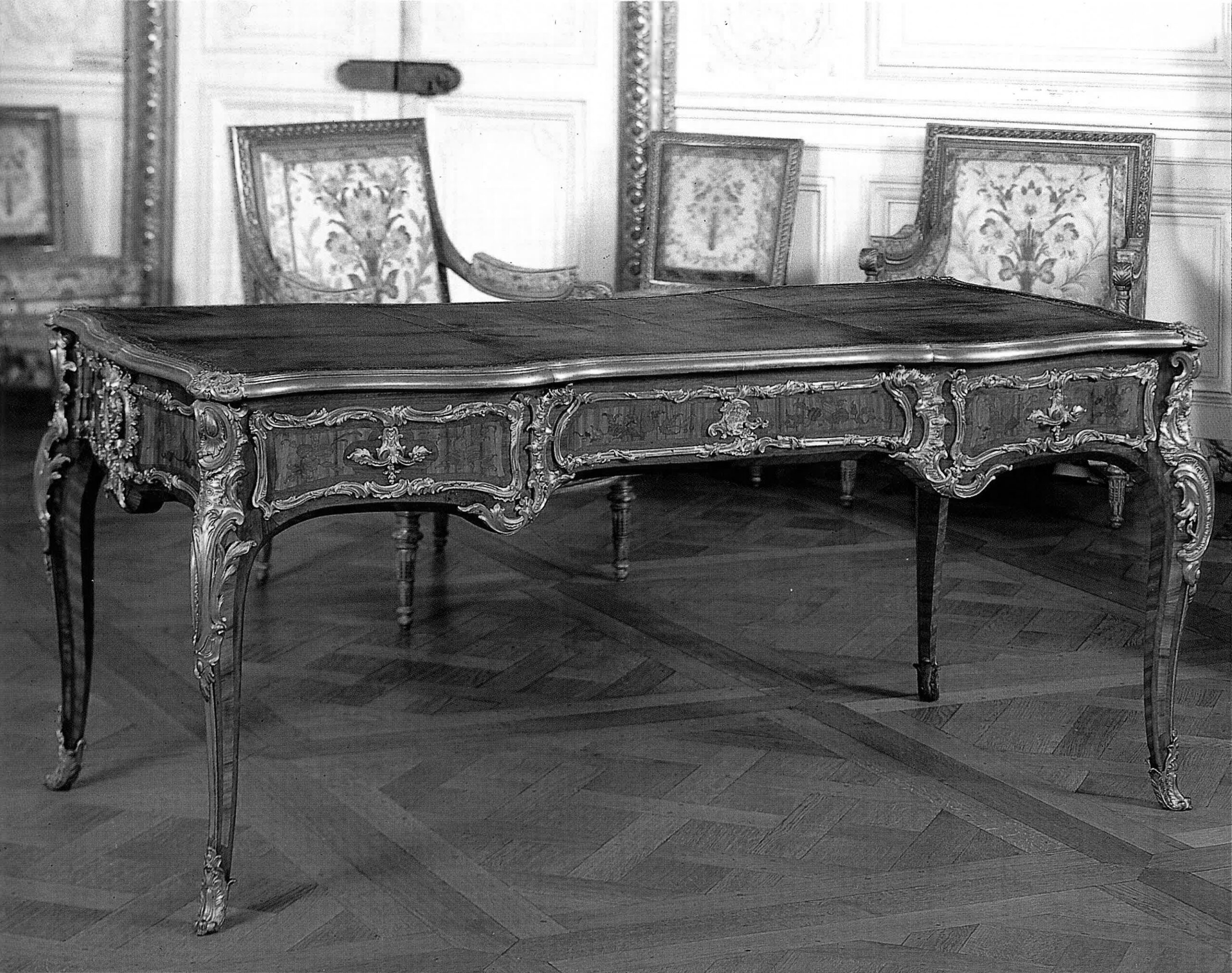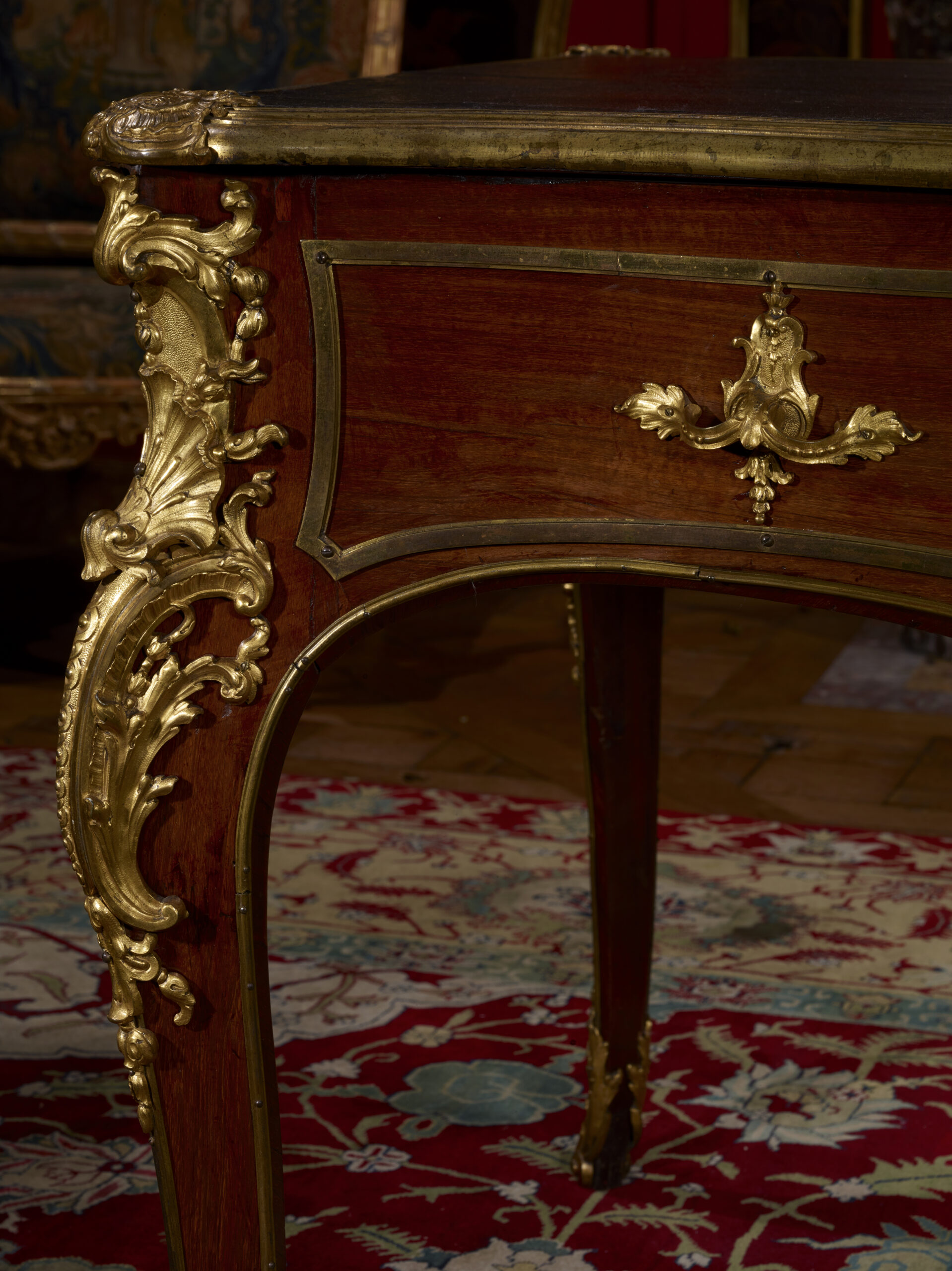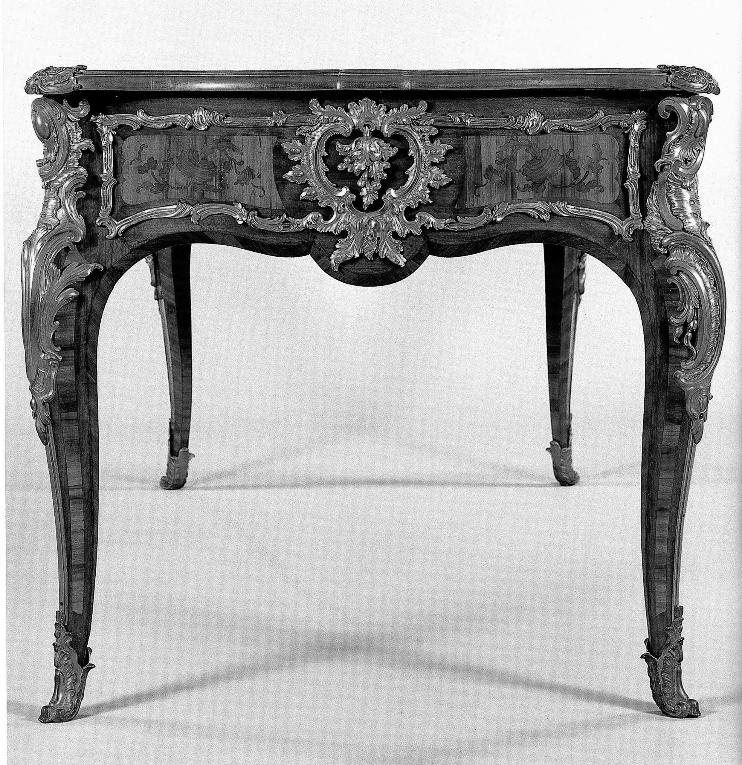 Le Dauphin semble avoir particulièrement apprécié le modèle. En effet, six ans plus tard, le 18 février 1745, le marchand mercier Thomas-Joachim Hébert livrait à Versailles, pour le grand cabinet du nouvel appartement du prince, aménagé au premier étage de l’aile du Midi, un bureau plat du même modèle. Estampillé B.V.R.B., ce bureau, en marqueterie d’amarante et de satiné, est agrémenté des mêmes agrafes encadrant son tiroir central, des mêmes grands cartouches à fleurons ajourés ornant le centre de ses petits côtés, et des mêmes poignées singularisant ses tiroirs latéraux, le tout complété par des chutes et des encadrements de bronze en revanche plus ostentatoire. Louis Tocqué disposait du modèle du bureau dans son atelier.