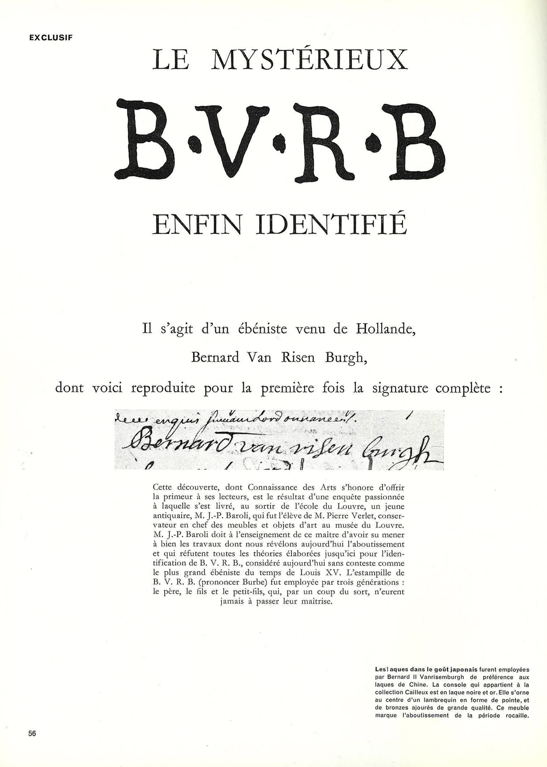 Jean-Pierre Baroli, « Le mystérieux B.V.R.B enfin identifié », Connaissance des Arts, n° 61, mars 1957, p. 58.