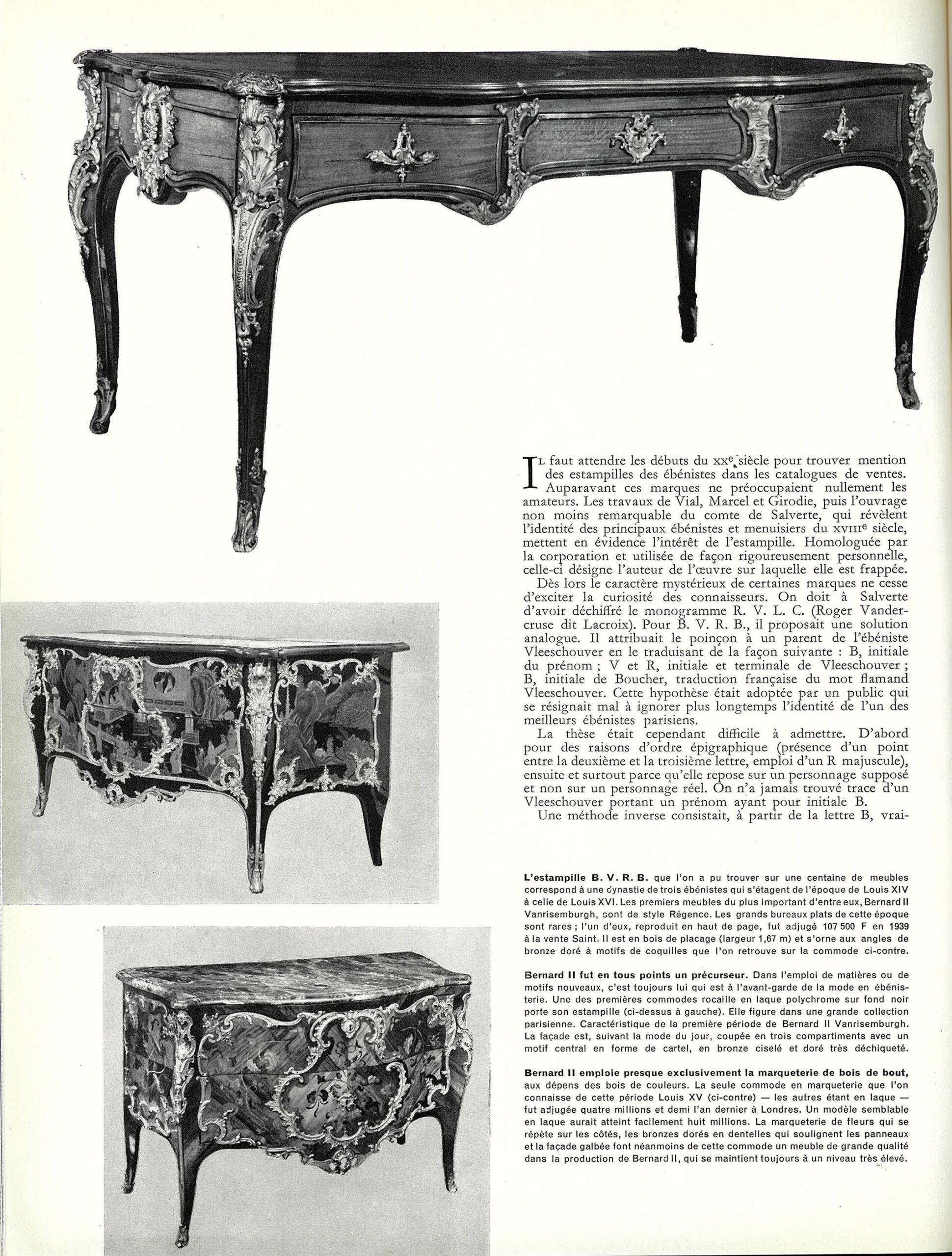 Au cours de la même période, la baronne confia le meuble à la galerie Rosenberg & Stiebel à New York, qui le vendit au baron Guy de Rothschild (1919-2007). Celui-ci le ramena en France et, à partir de 1975, le plaça dans l’un des salons de l’hôtel Lambert qu’il venait d’acquérir avec son épouse la baronne Marie-Hélène de Rothschild (1927-1996). Le bureau est depuis resté dans l’apanage des Rothschild jusqu’à nos jours. Il a été reproduit en mars 1957 dans un article référent de Jean-Pierre Baroli, paru dans Connaissance des Arts, identifiant pour la première fois l’auteur de la mystérieuse estampille B.V.R.B. Il a également été publié par Jean Nicolay en 1956, dans son dictionnaire des Maîtres Ebénistes français au XVIIIe siècle. Il appartient à un corpus très réduit de bureaux plats appartenant au même modèle de Bernard II Vanrisamburgh. En effet seulement deux autres exemplaires sont à ce jour répertoriés.