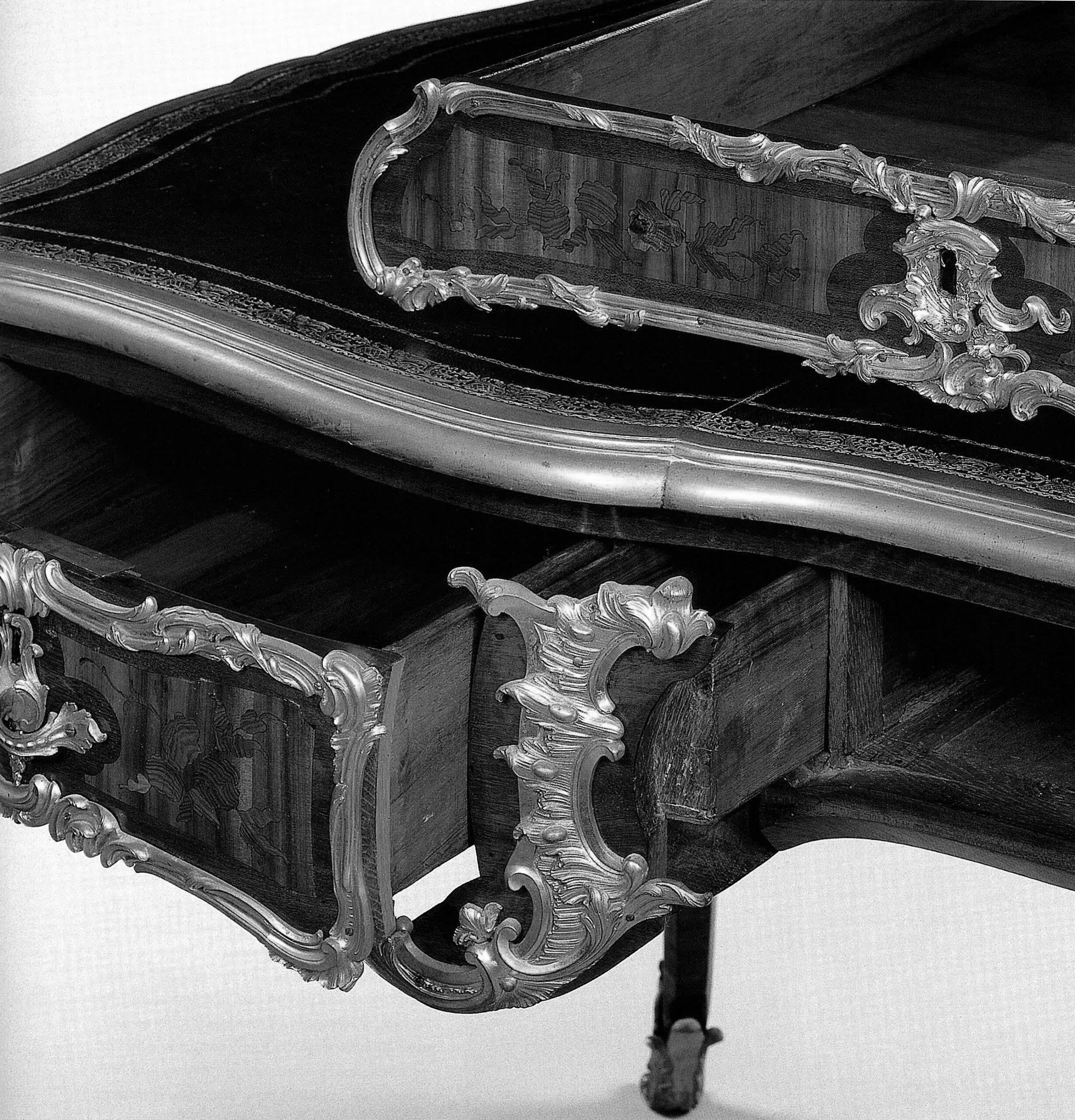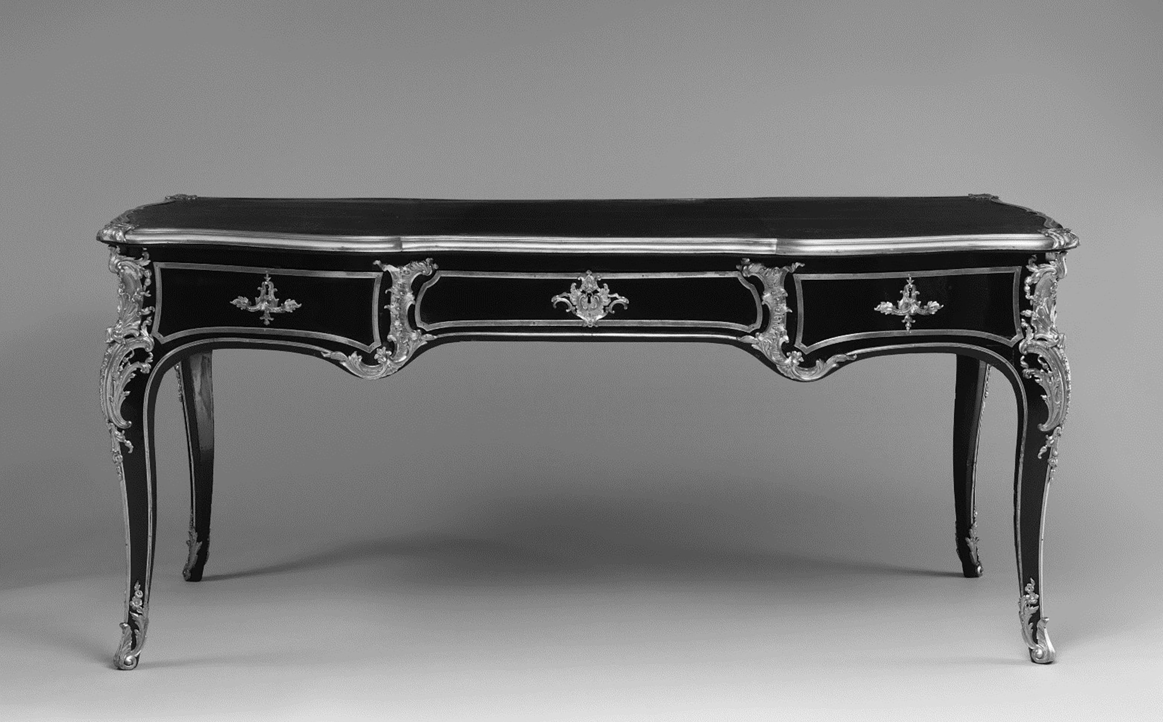 Le second bureau, intégralement plaqué en ébène, a fait partie au XVIIIe siècle des collections de Louis-François Armand de Vignerot du Plessis (1696-1788), 3e duc de Richelieu. Demeuré dans sa descendance, il fut lui aussi acquis par Rosenberg & Stiebel vers 1952, qui le revendit à Charles et Jayne Wrightsman. Ces derniers le placèrent, ironie du sort, dans la Drawing Room de l’ancien appartement de la baronne Renée de Becker à Manhattan, où avait précédemment figuré le bureau présenté ici.