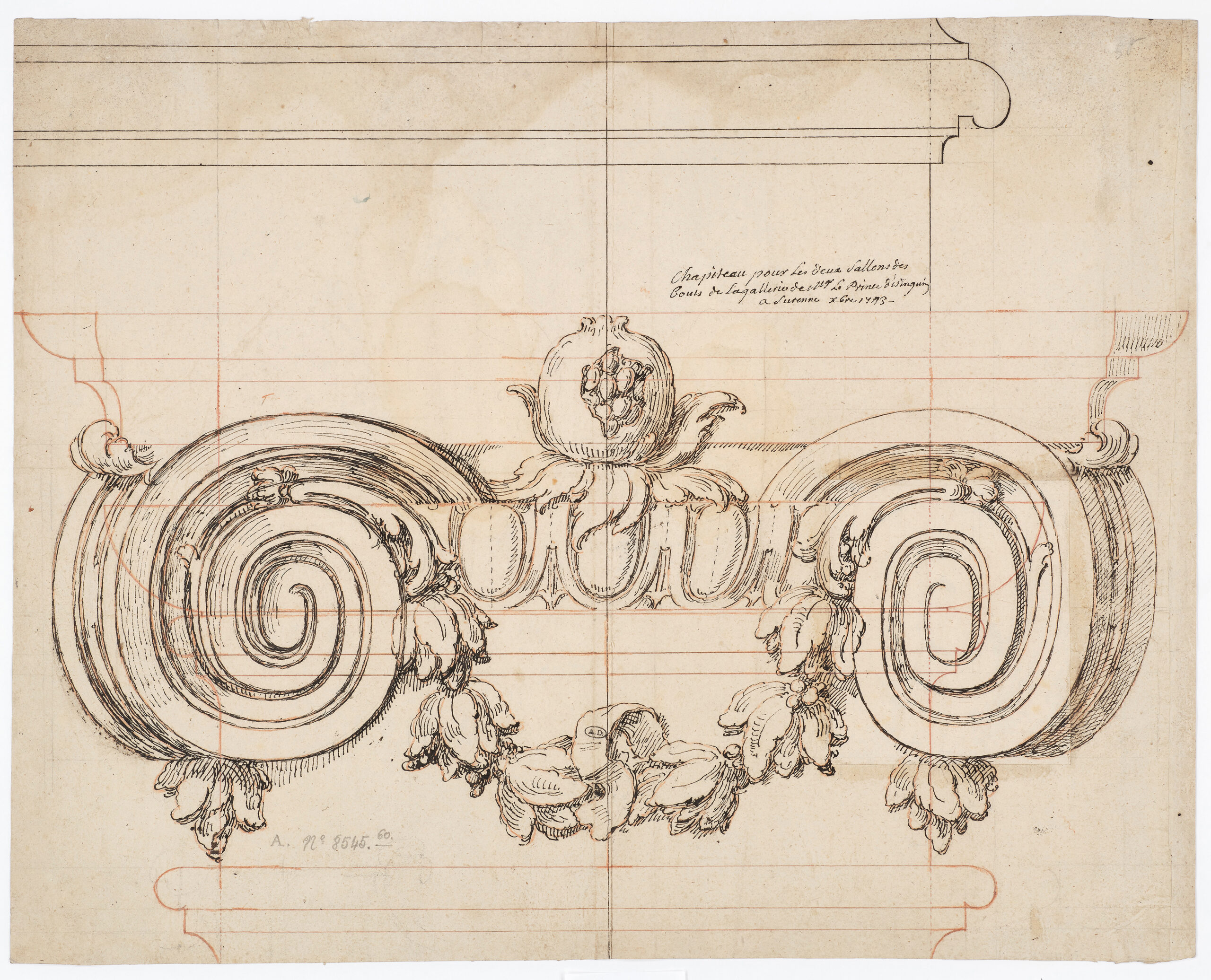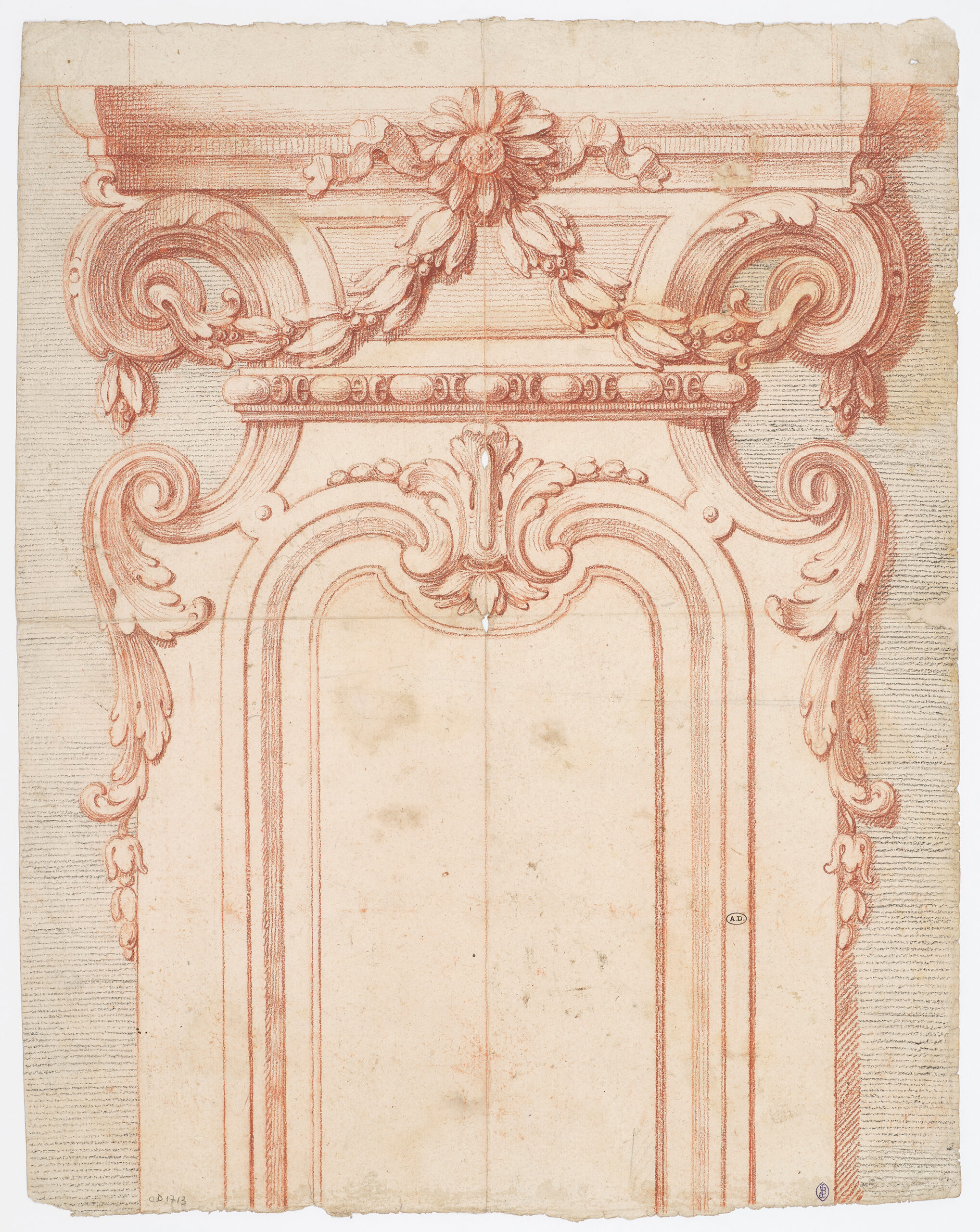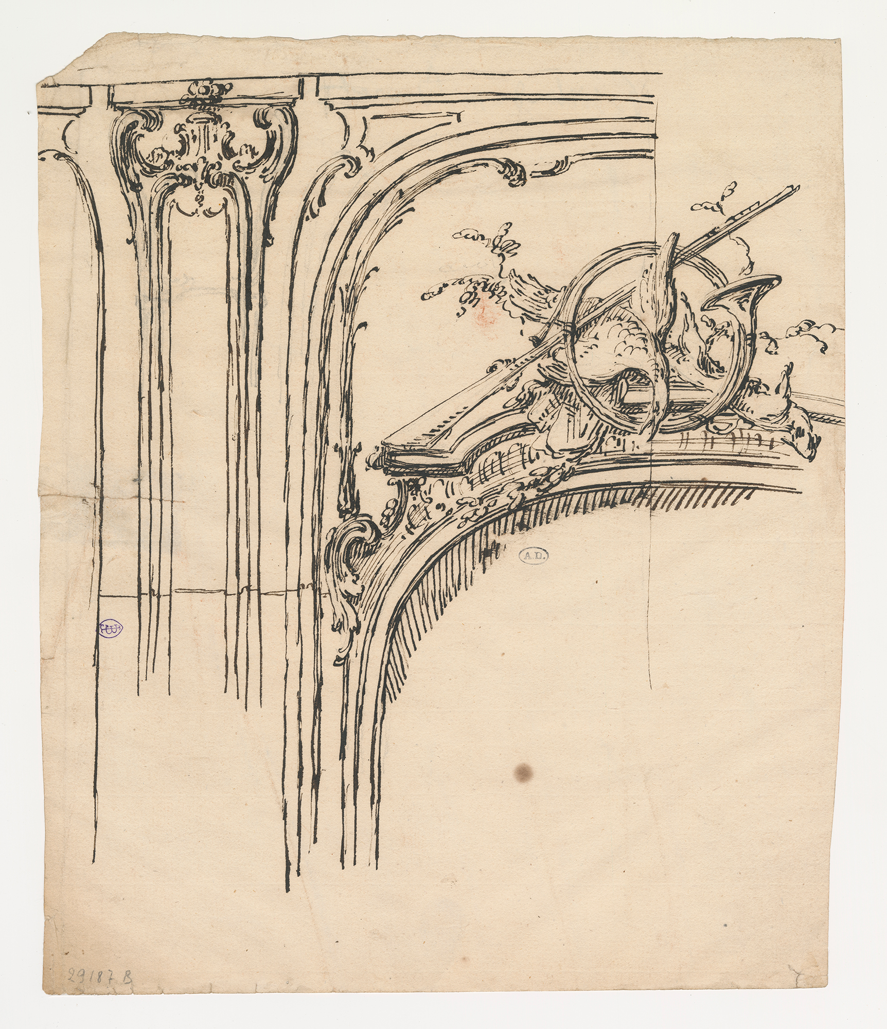 Avant que le rapprochement ne soit fait avec notre boiserie, une datation tardive avait été donnée au dessin. Il avait même été exclu du corpus des œuvre de Nicolas Pineau et avait été attribué à Dominique Pineau, son fils. Cette datation et cette attribution fautives reposaient sur l’idée que le dessin aurait été d’un esprit trop néoclassique pour être de Nicolas. L’art rocaille n’a pourtant jamais abandonné l’usage des ordres architecturaux, en particulier dans la sculpture en pierre – par exemple pour les vestibules ou escaliers. Le dessin à grandeur d’exécution pour les salons du prince d’Isenghien à Suresnes daté de 1743 (inv. 8545.60) prouve que Nicolas Pineau a su traiter les ordres architecturaux avec une certaine légèreté.